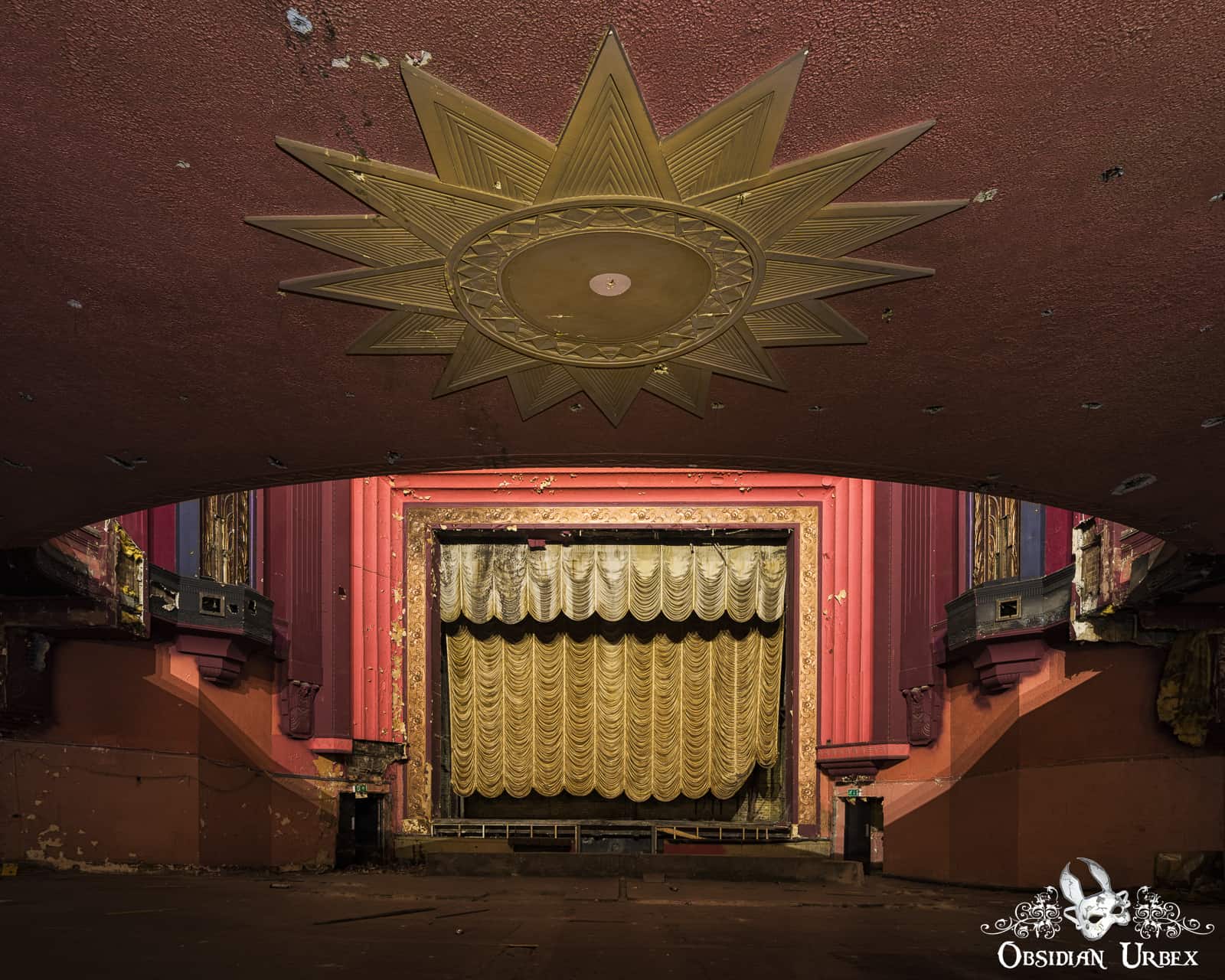 The magnificent golden Art Deco starburst ceiling rose dominates the upper portion of the photos from almost any angle. From the center, hangs a chandelier with numerous round frosted light bulbs. Strikingly, there is a similar starburst motif on the underside of the balcony you can see when standing in the stalls area below.