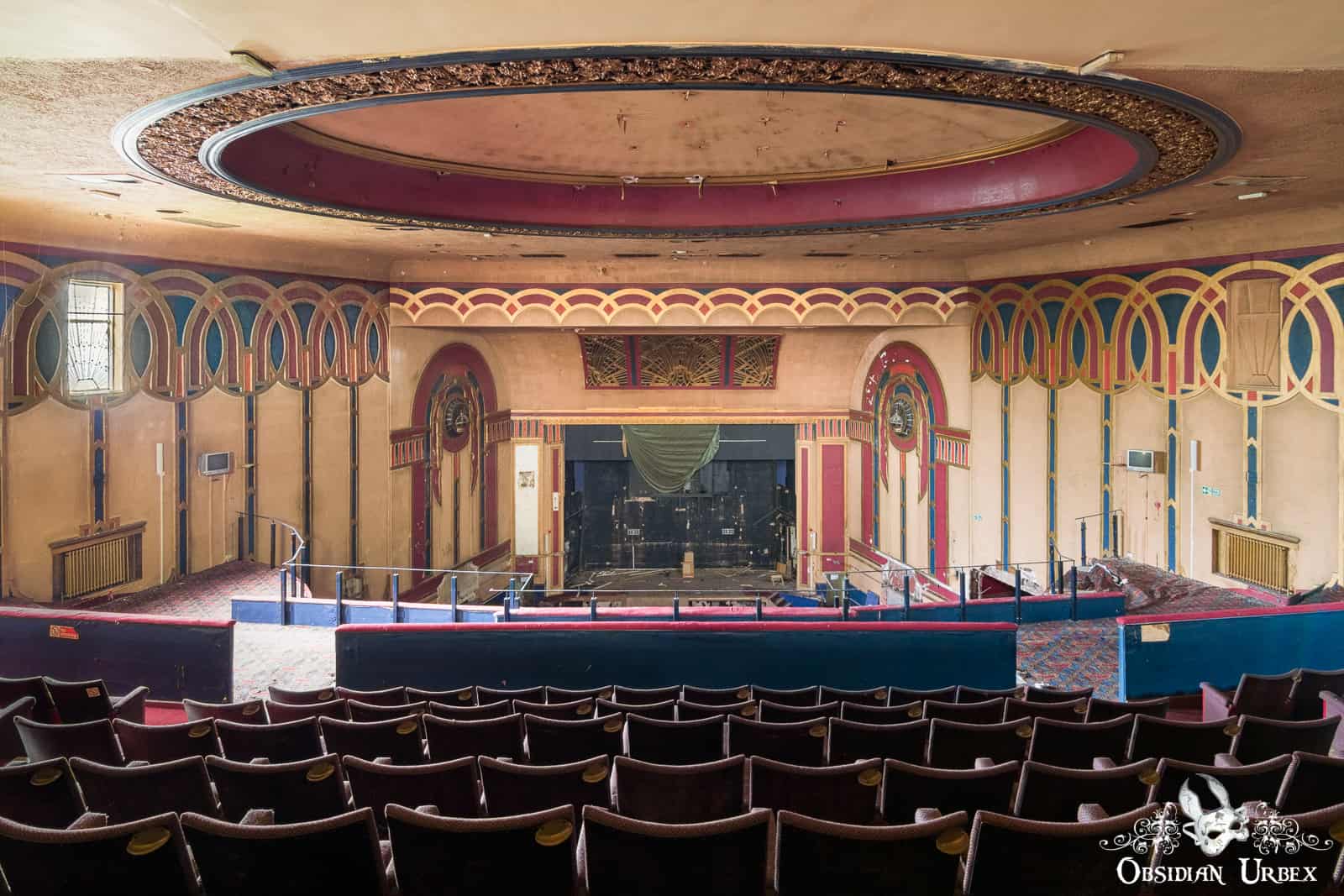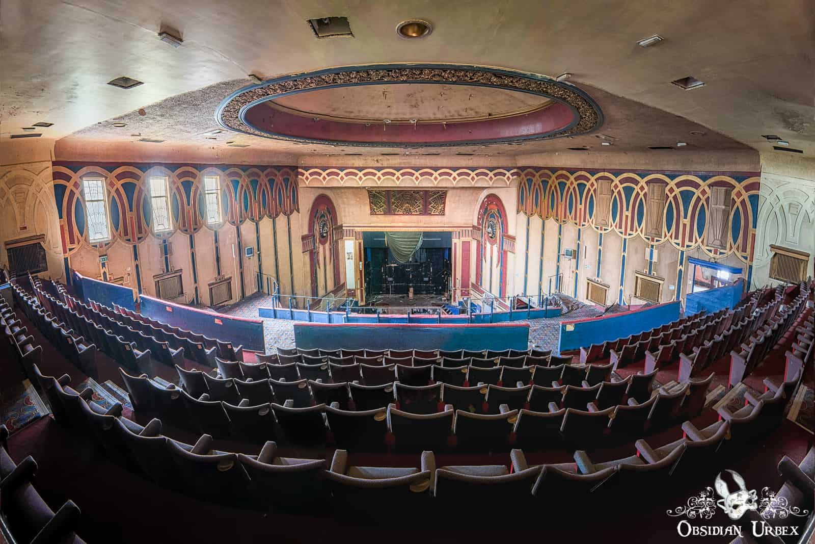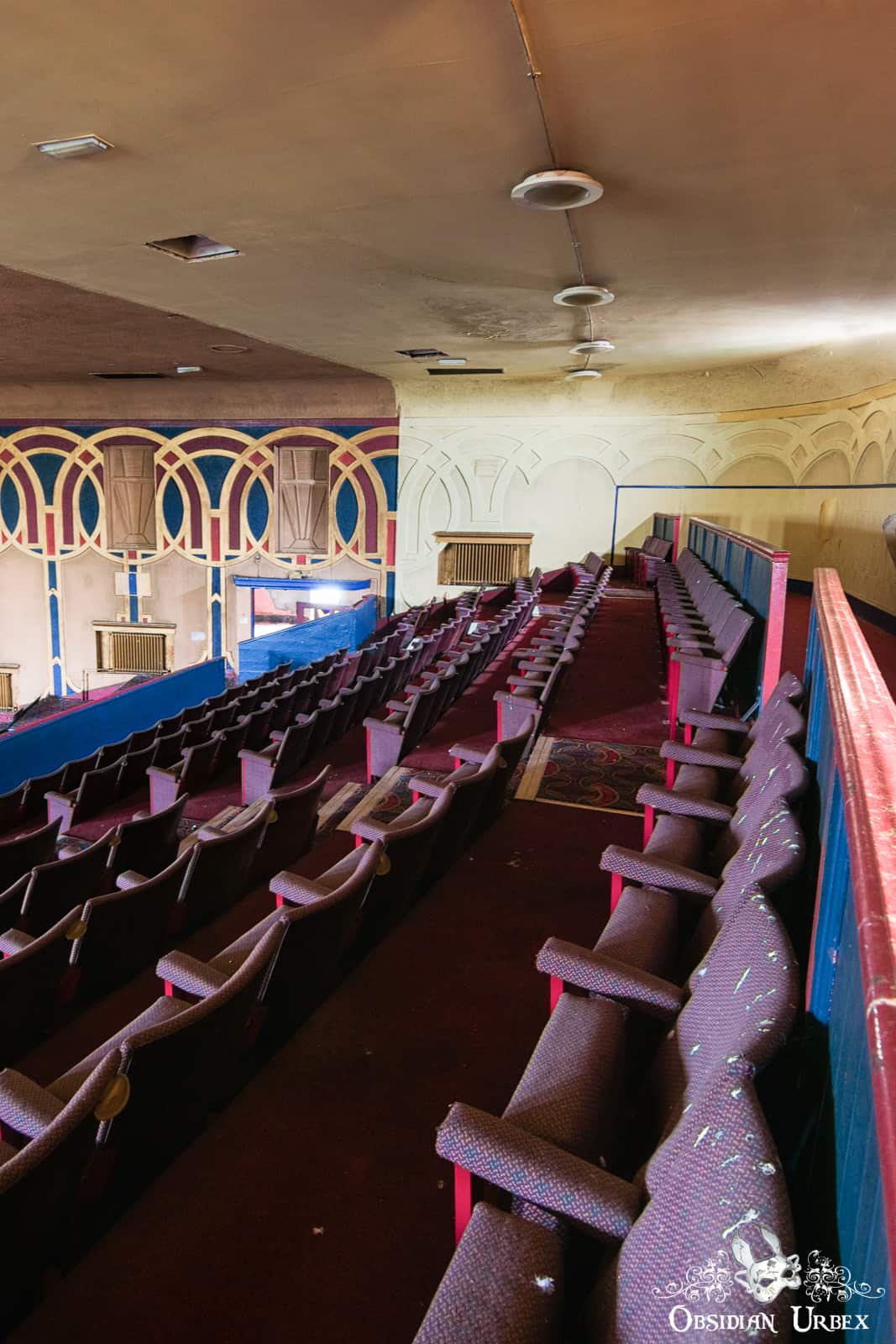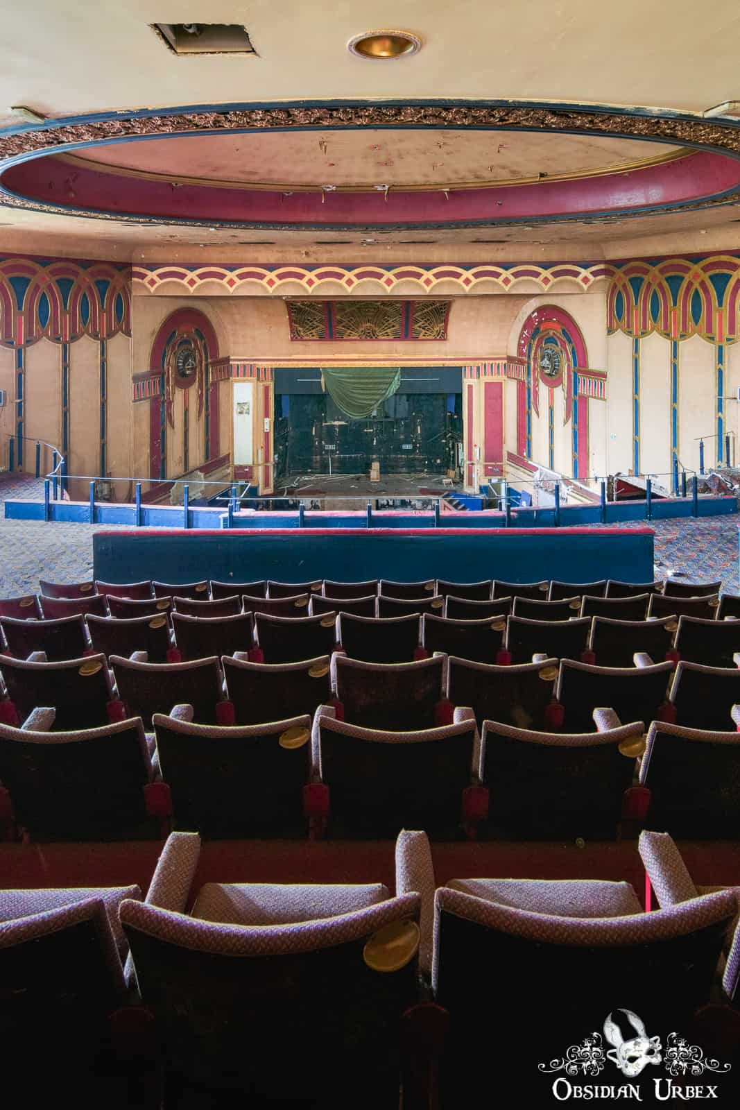 At the time of our visit in early 2017, the Royalty Cinema was free of graffiti and was gracefully decaying. Graffiti tags began to appear later in 2017. The cinema was gutted by a large fire in September 2018, destroying this interior of this beautiful building. There was another fire in 2019.