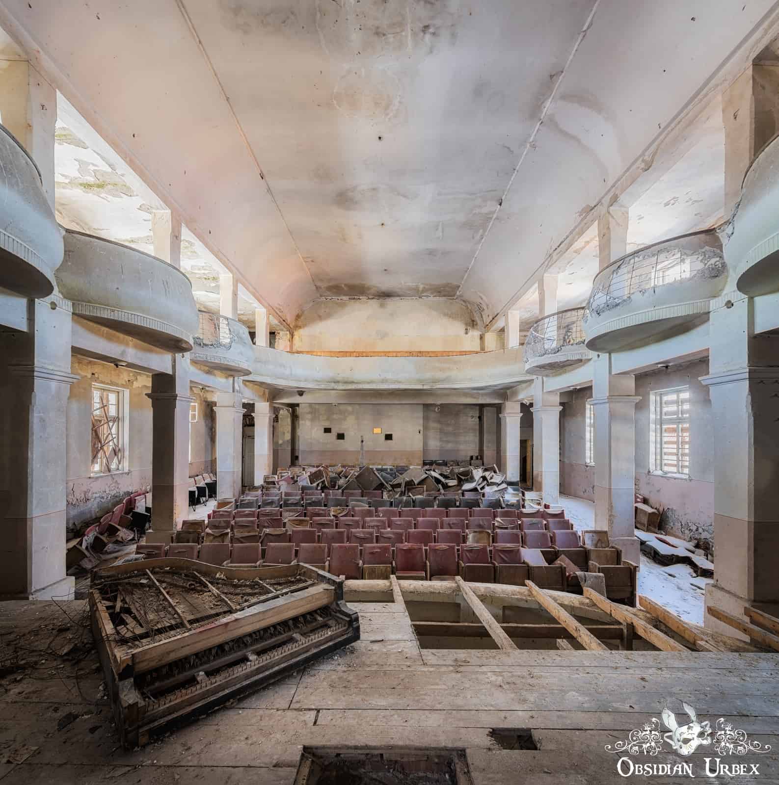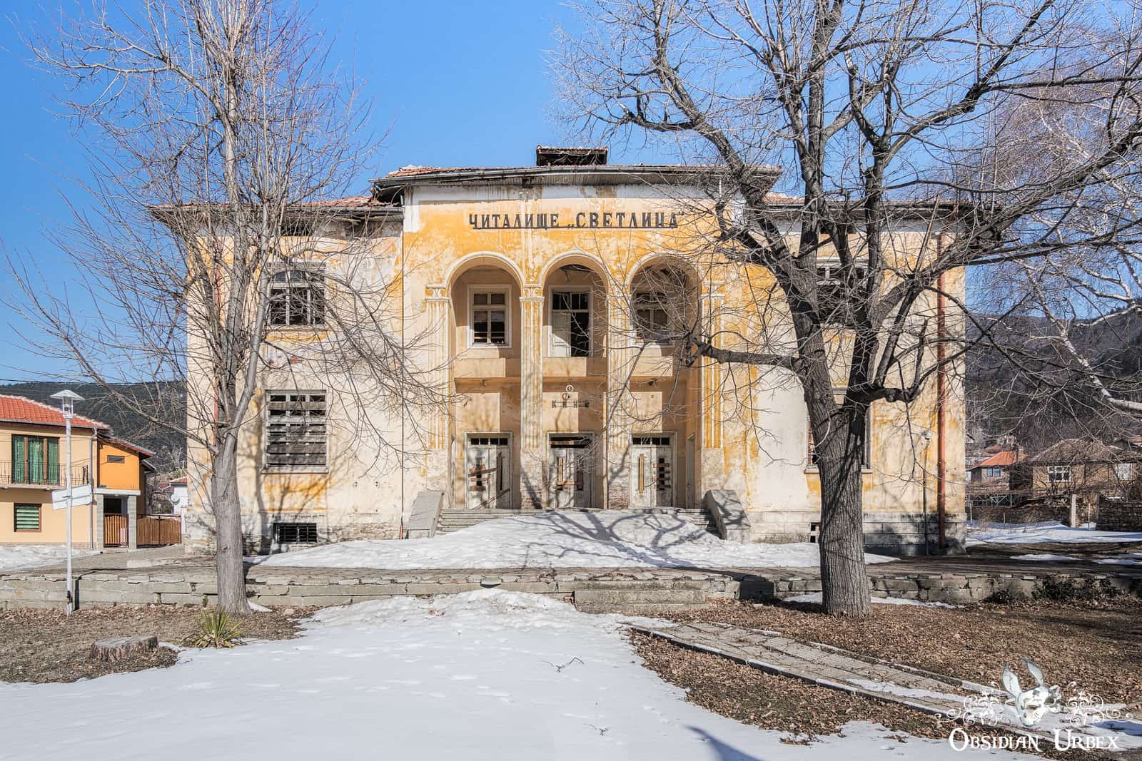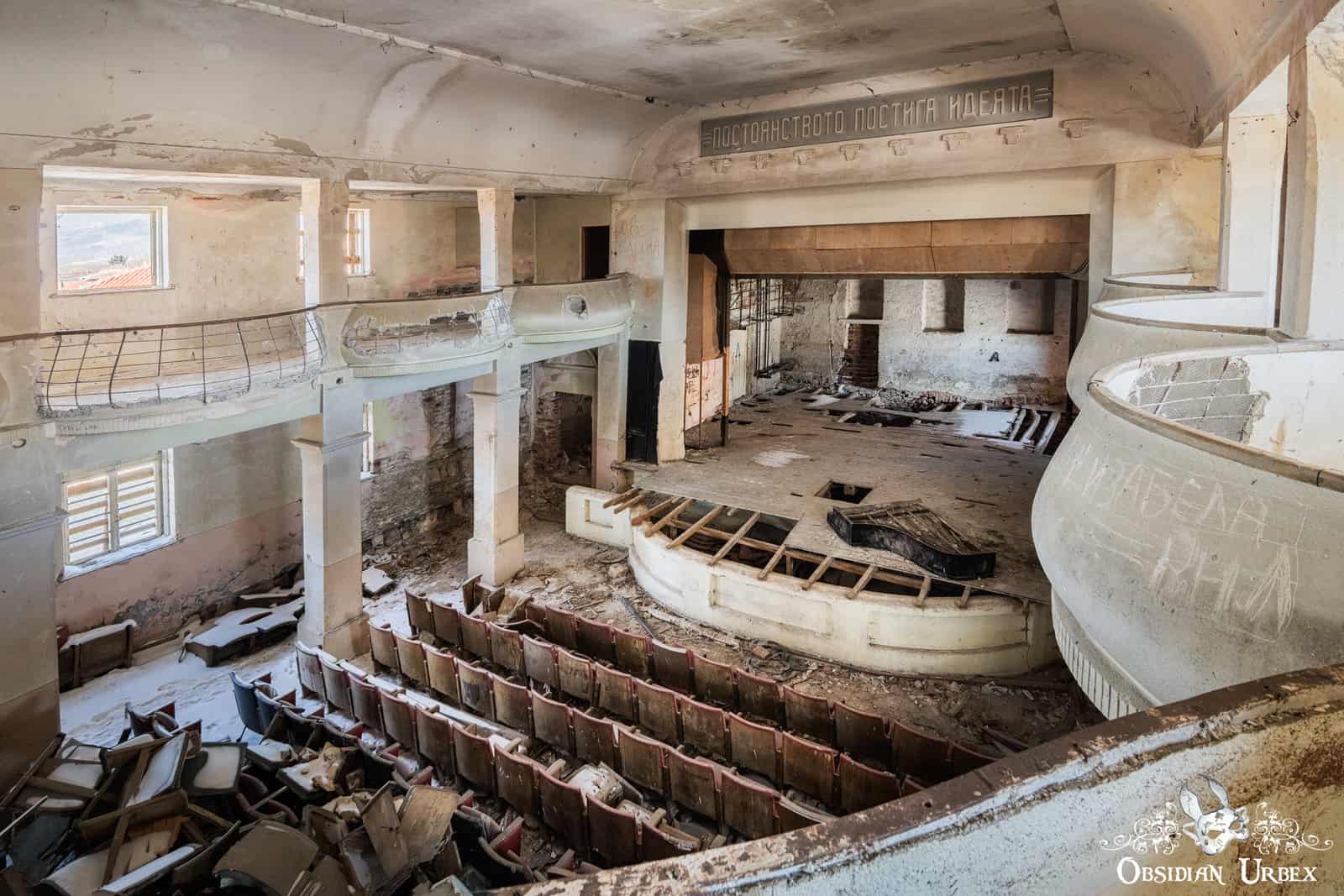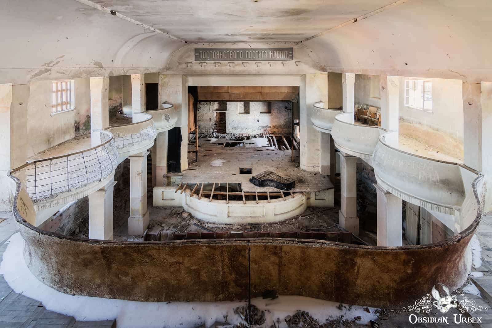 The abandoned Soviet Theatre lays hidden in a Bulgarian mountain village. The theatre was once part of a larger community center, which itself dates back to the 1860s. The prominent yellow building is tucked away in a rural town, deep in the Balkan Mountains. The windows are crudely boarded with planks, the original windows long since gone. The theatre itself has been abandoned since the 1990s. Since then it has been silent and empty.