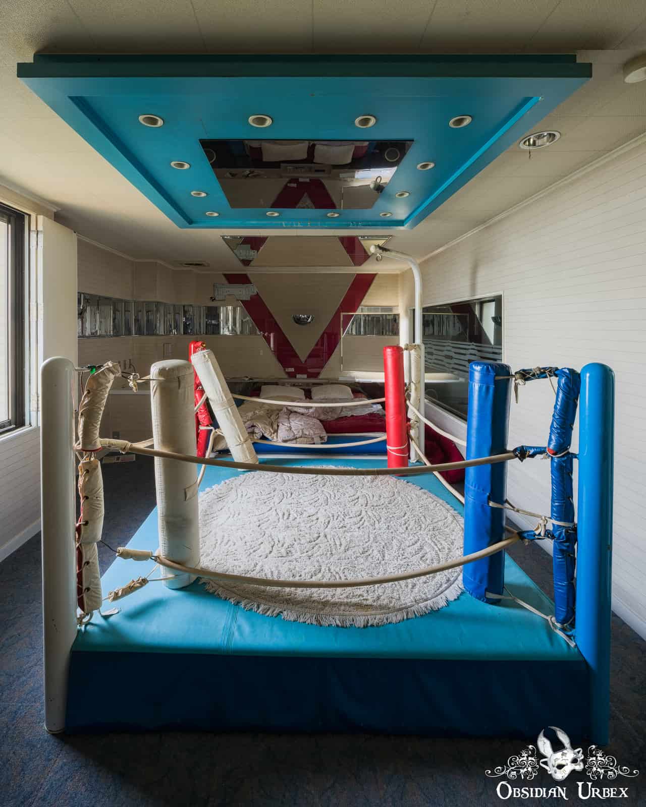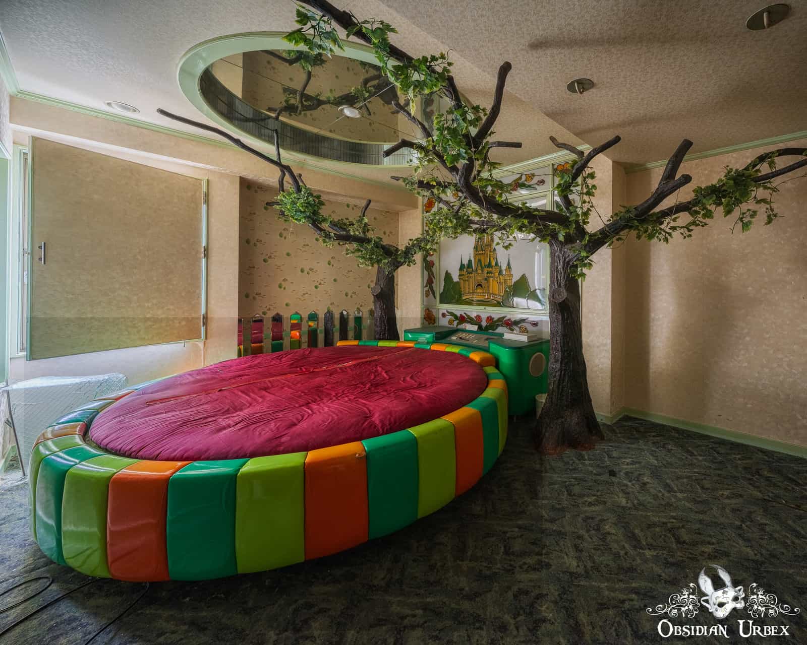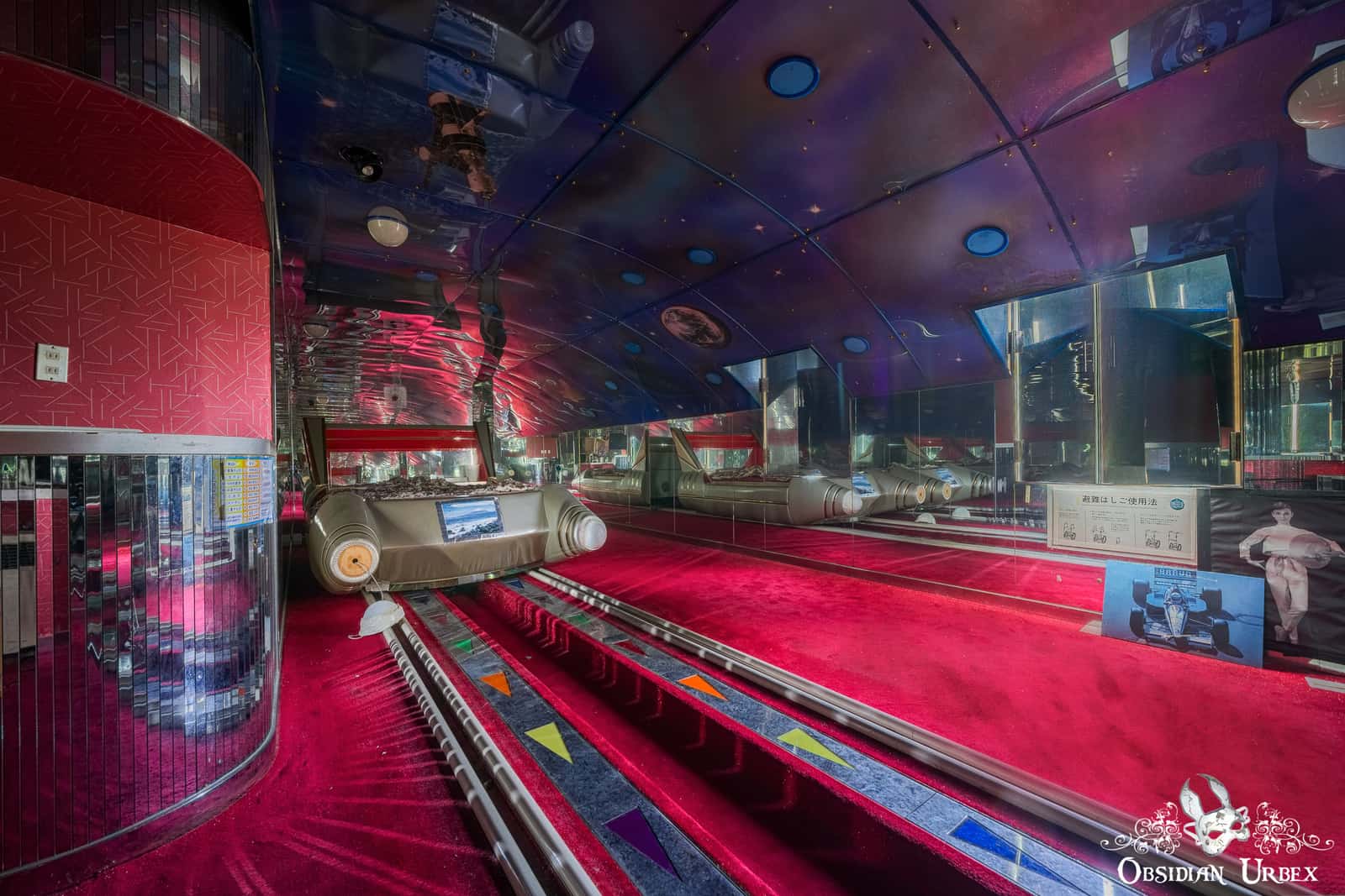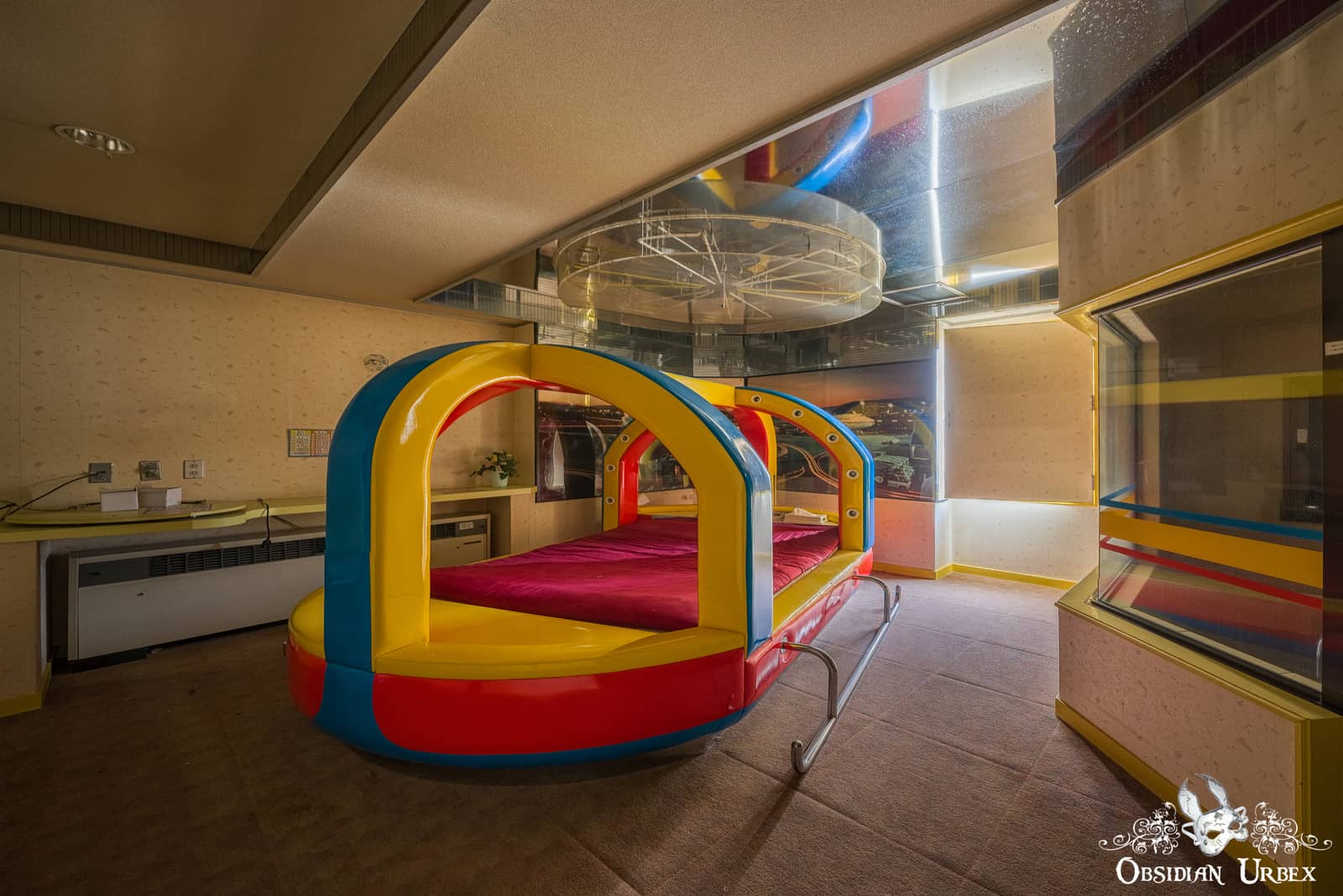 Spaceship Love Hotel is an abandoned hotel and adult entertainment venue in Japan. The hotel is three storeys tall. Bright pink and blue lights and neon strips would have illuminated the exterior of the hotel would have been. The lights have been off since the hotel closed in the mid-2000s.