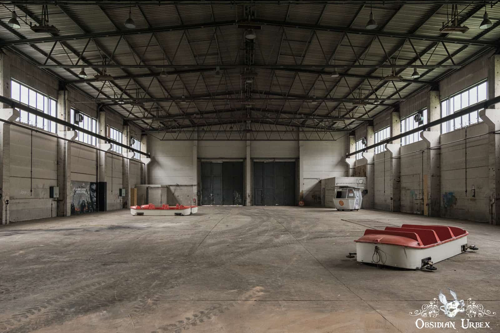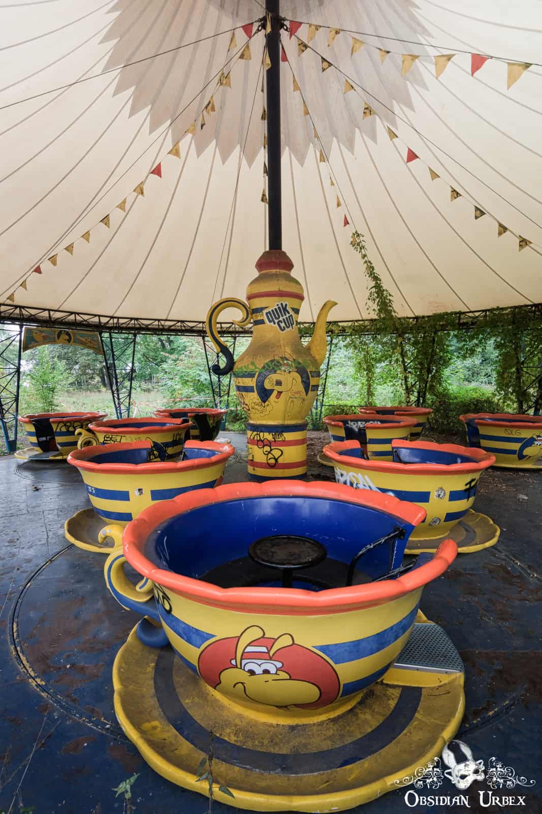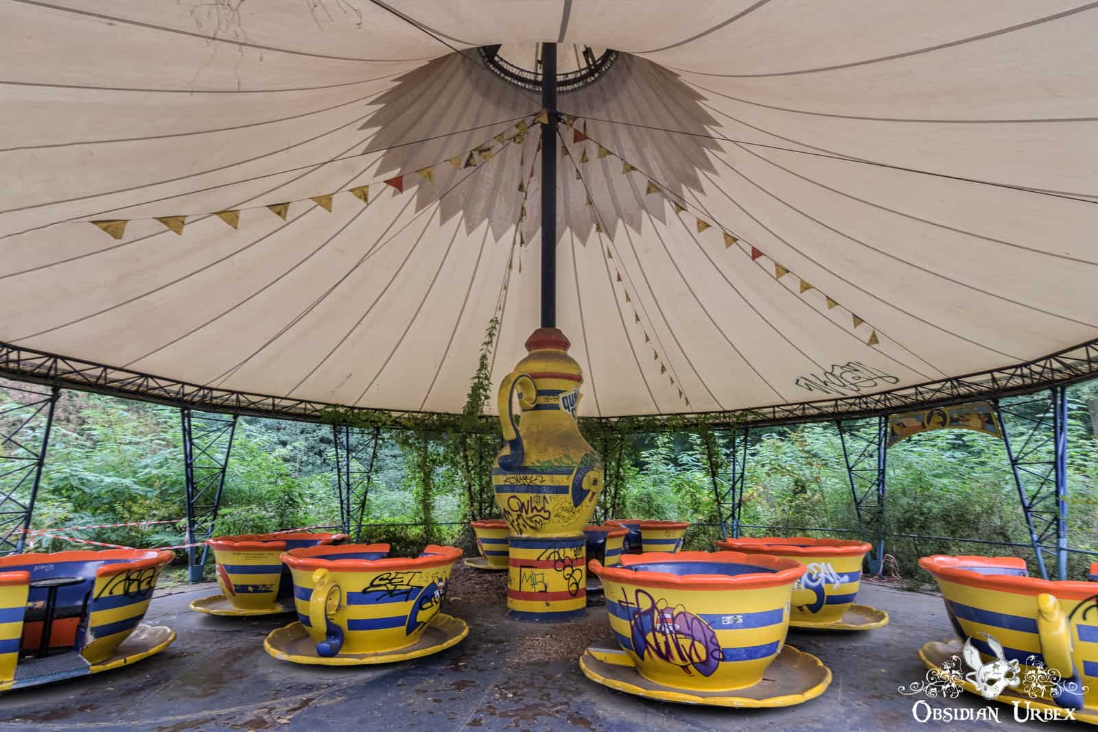 The most iconic ride remaining at the park is a roller coaster that goes through a large tunnel shaped like a blue roaring cat. The Ferris Wheel, complete with rainbow-spectrum carriages, rotates slowly in the wind almost silently. The Viking long-ship nearby sadly has had the dragon head decapitated in recent years. Most of the dinosaur statues are gone and only one graffiti-covered T-Rex lies on the floor, broken and forlorn behind some comically ineffective fencing. The brightly coloured spinning teacup ride remains in relatively good condition. The swan boats and remaining roller coaster cars are now locked away inside a large storage warehouse.