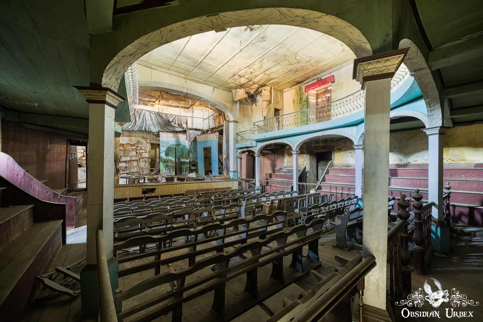 Teatro Antiqua can be entered through the main street-facing door as well as side entrances on either side of the stage. The main lower floor seating, in the centre of the room, has removable folding chairs organised into rows of six. Additionally, there is a private box on either side of the stage. There is also more seating on the ground floor, with simple, stepped benches encircling the room. Finally, the upper floor features a horseshoe-shaped balcony with iron railings. The stage is sloped and has a proscenium arch. Part of a backdrop remains from the last production – some sort of landscape seen with trees.