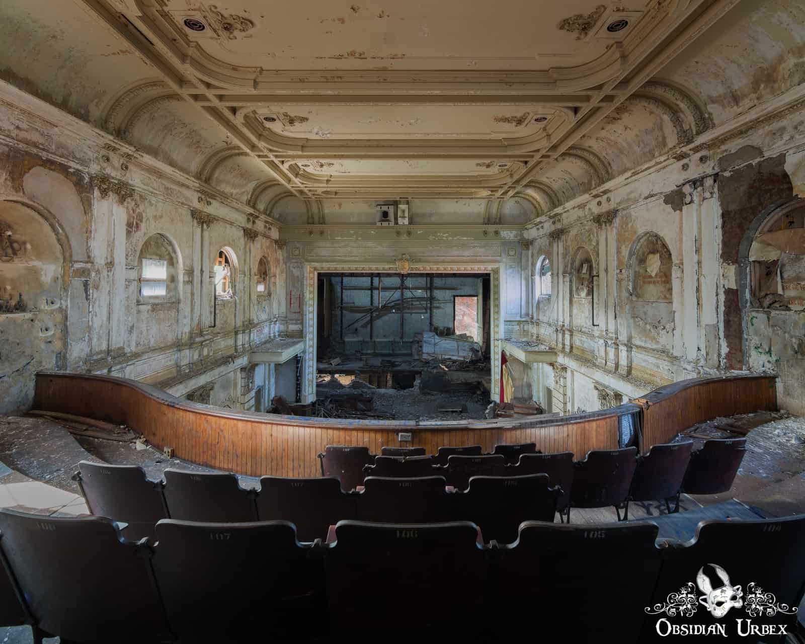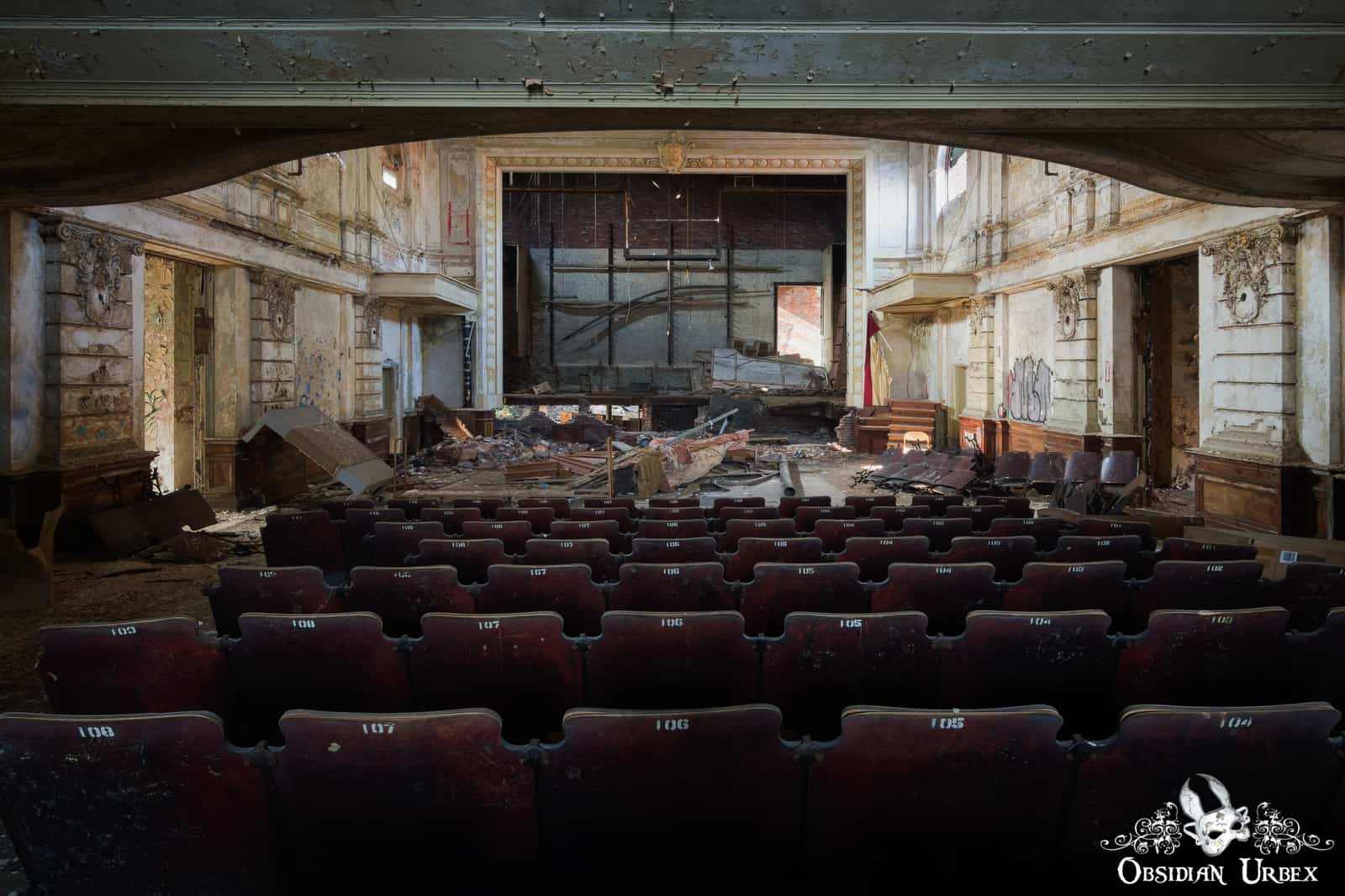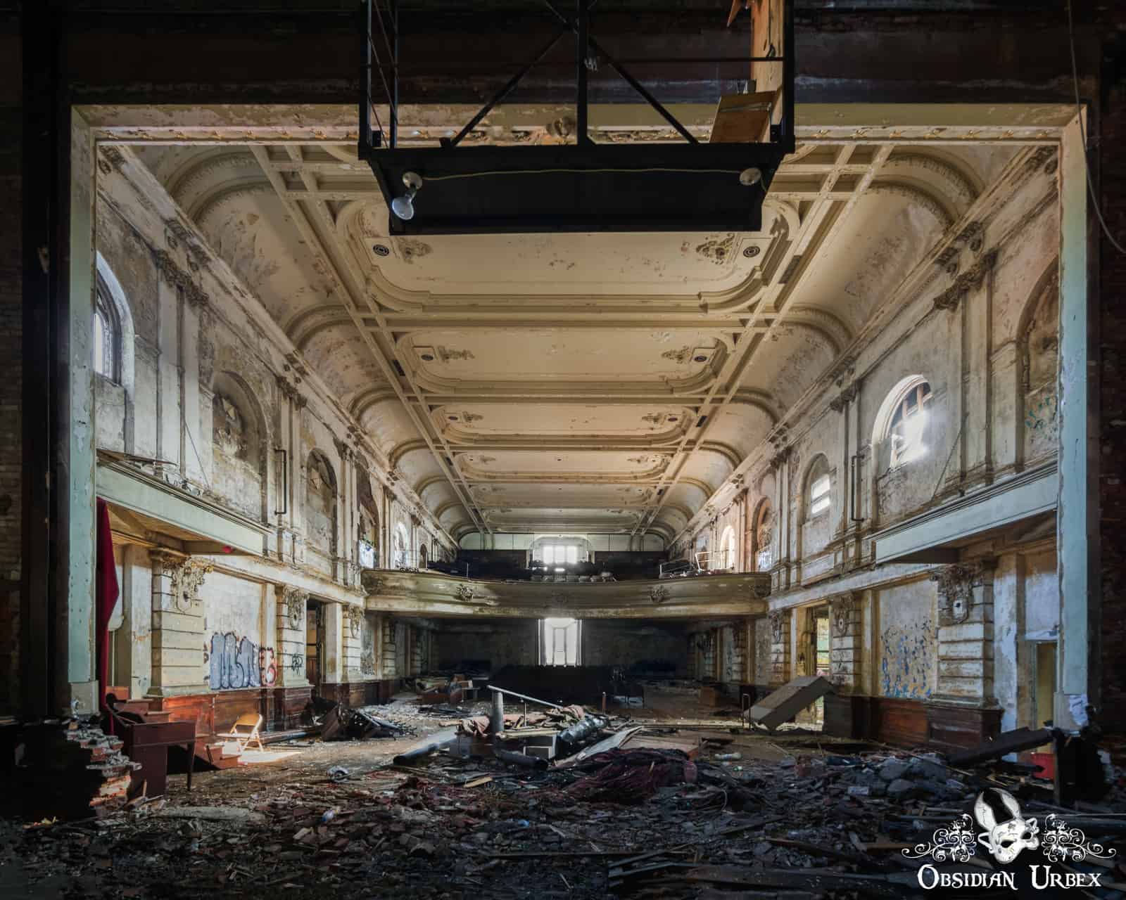 Veronica’s Veil is an abandoned theatre auditorium at a former Catholic high school in America. The nearby church and rectory, now converted to condominiums, date back to the mid-1800s. The school buildings were built in the 1880s and enlarged in the 1900s, when this auditorium was added.