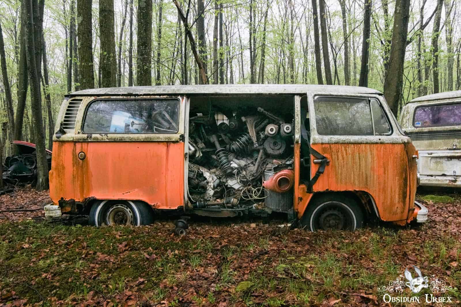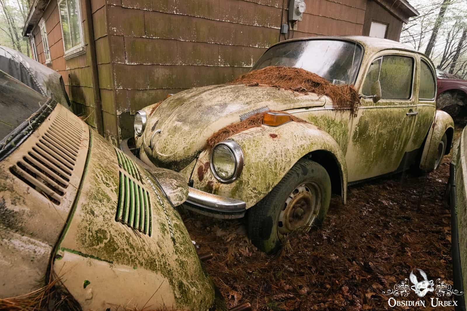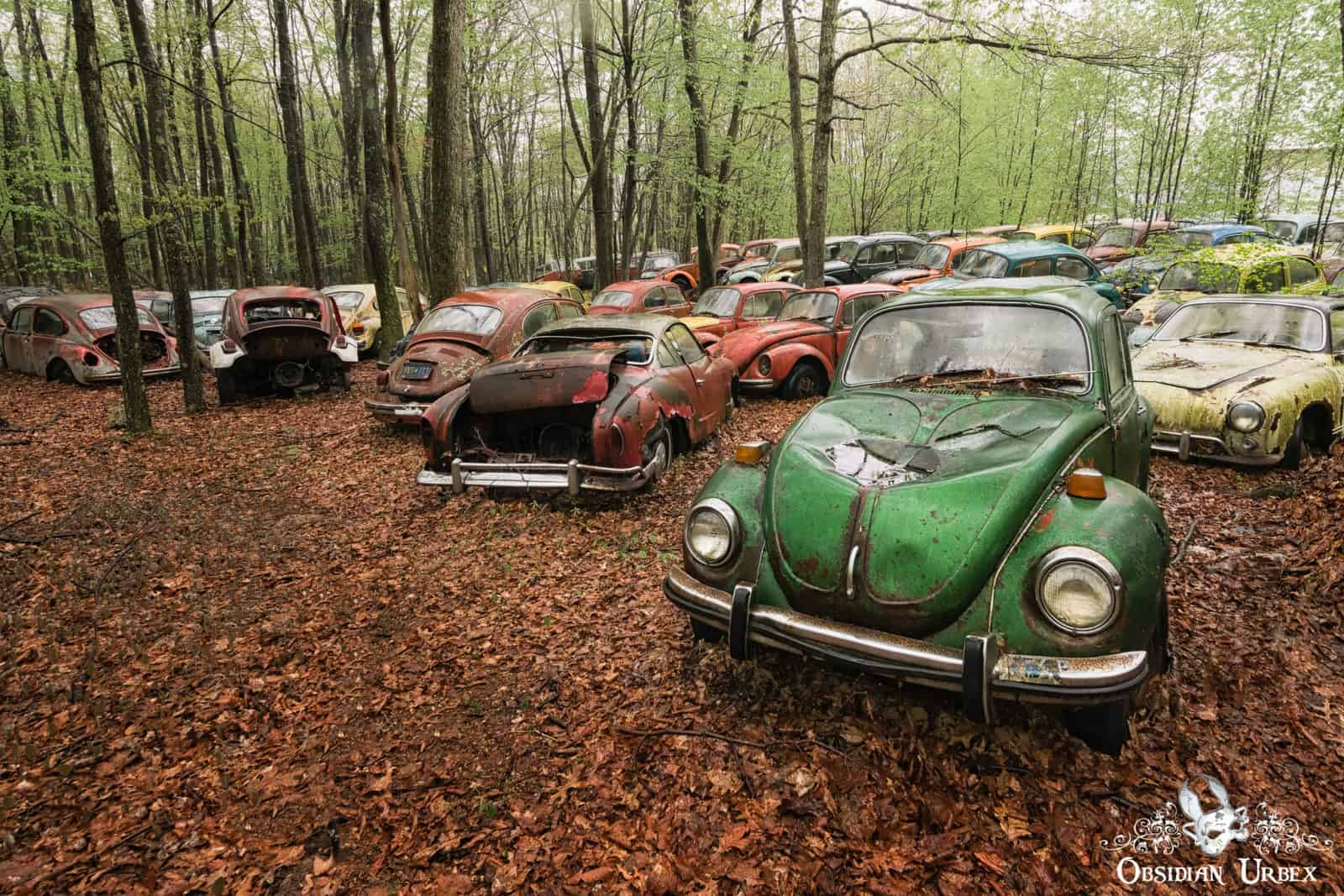 Deep in the woods lies an abandoned VW Beetle Car Graveyard. Hundreds of Volkswagen Beetles and Bus Campervans are organized into rows and clusters, seemingly based on age and model.