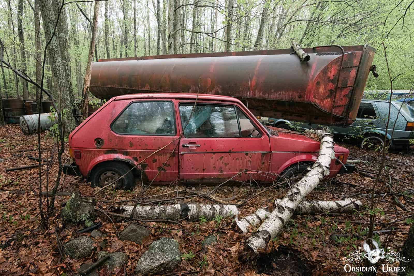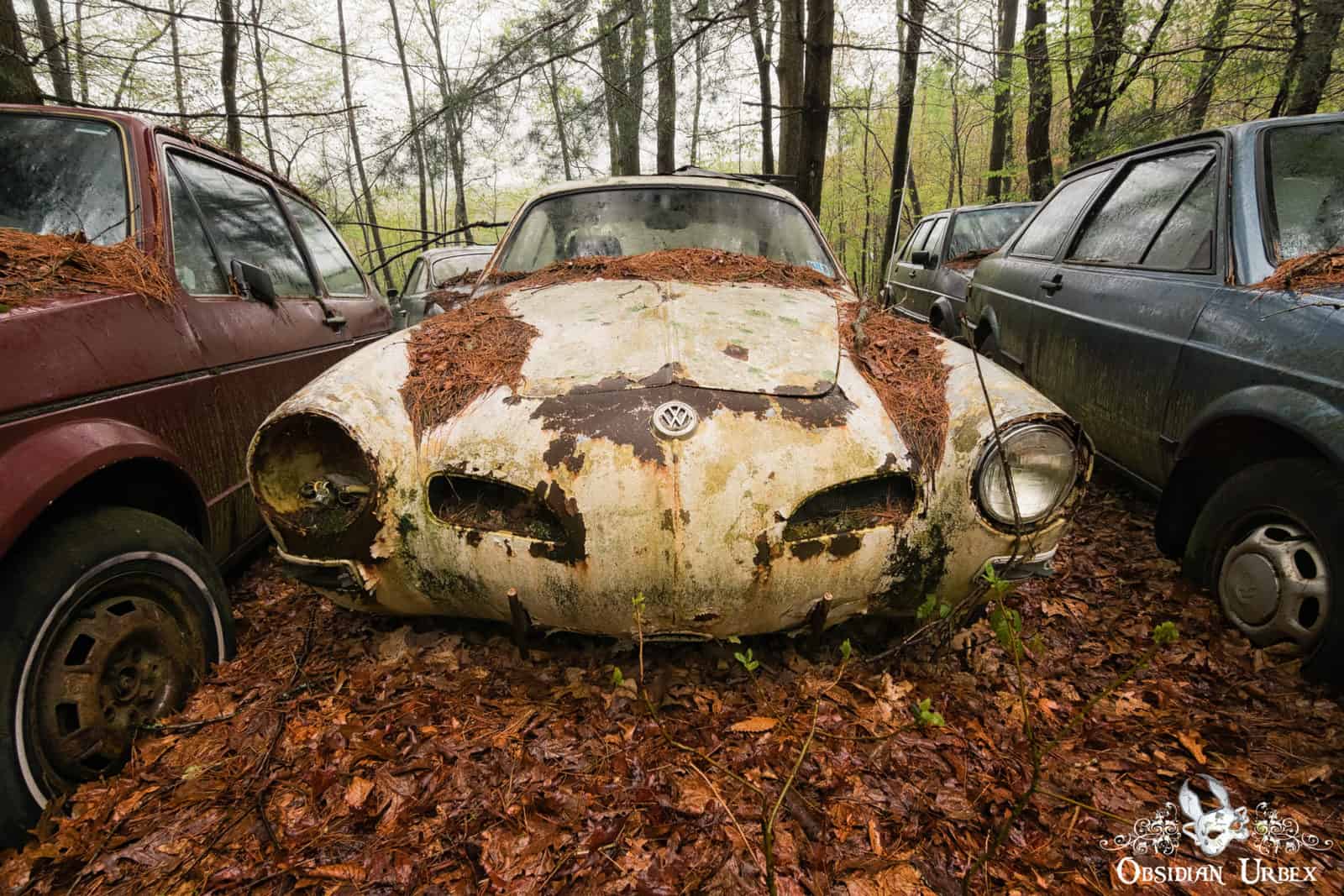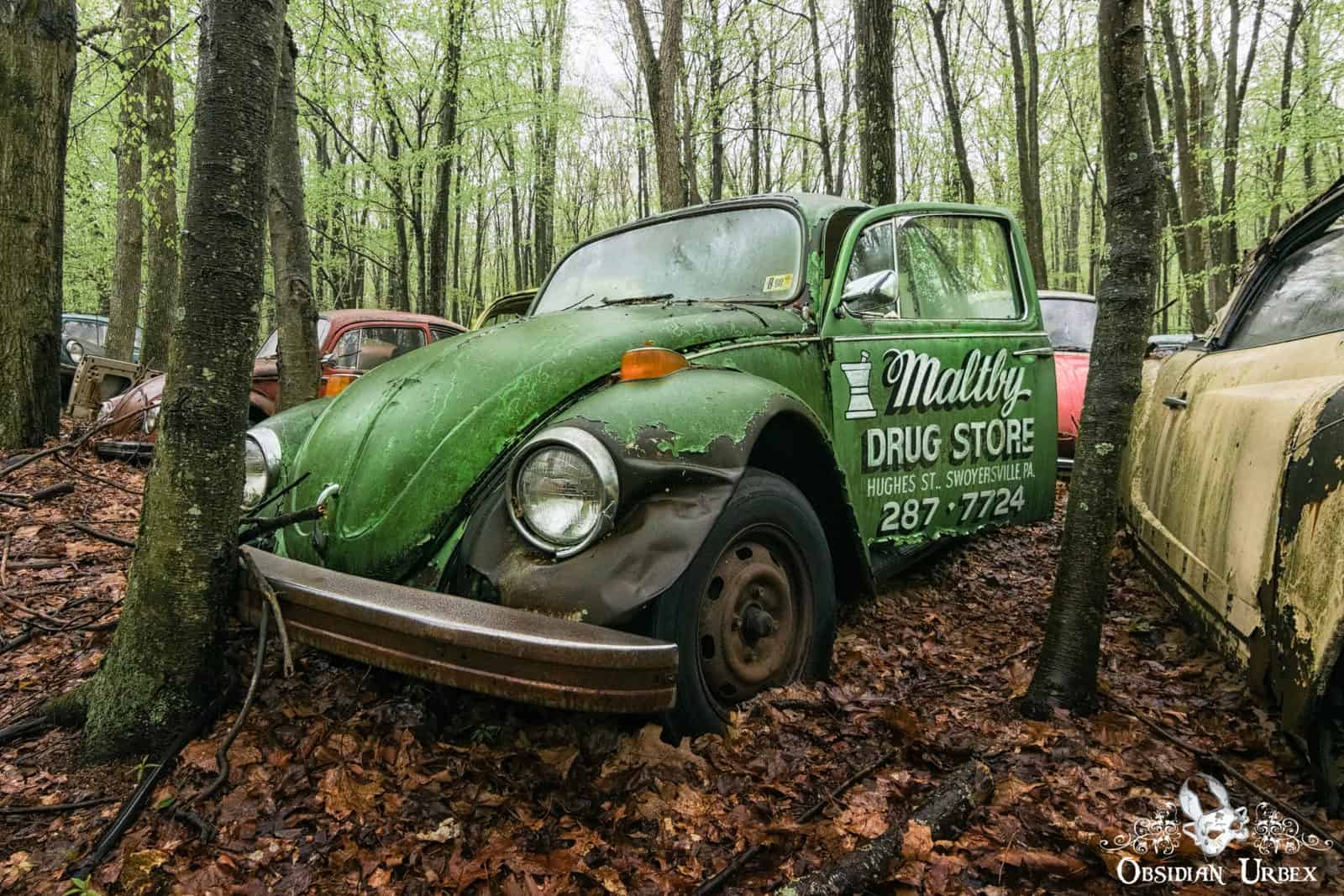 Deep in the woods lies an abandoned VW Beetle Car Graveyard. Hundreds of Volkswagen Beetles and Bus Campervans are organized into rows and clusters, seemingly based on age and model.