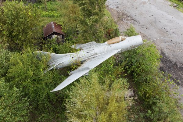 An abandoned Soviet-era MiG-19 fighter jet stands mounted on a high plinth, its nose peeks out from the trees that surround it.