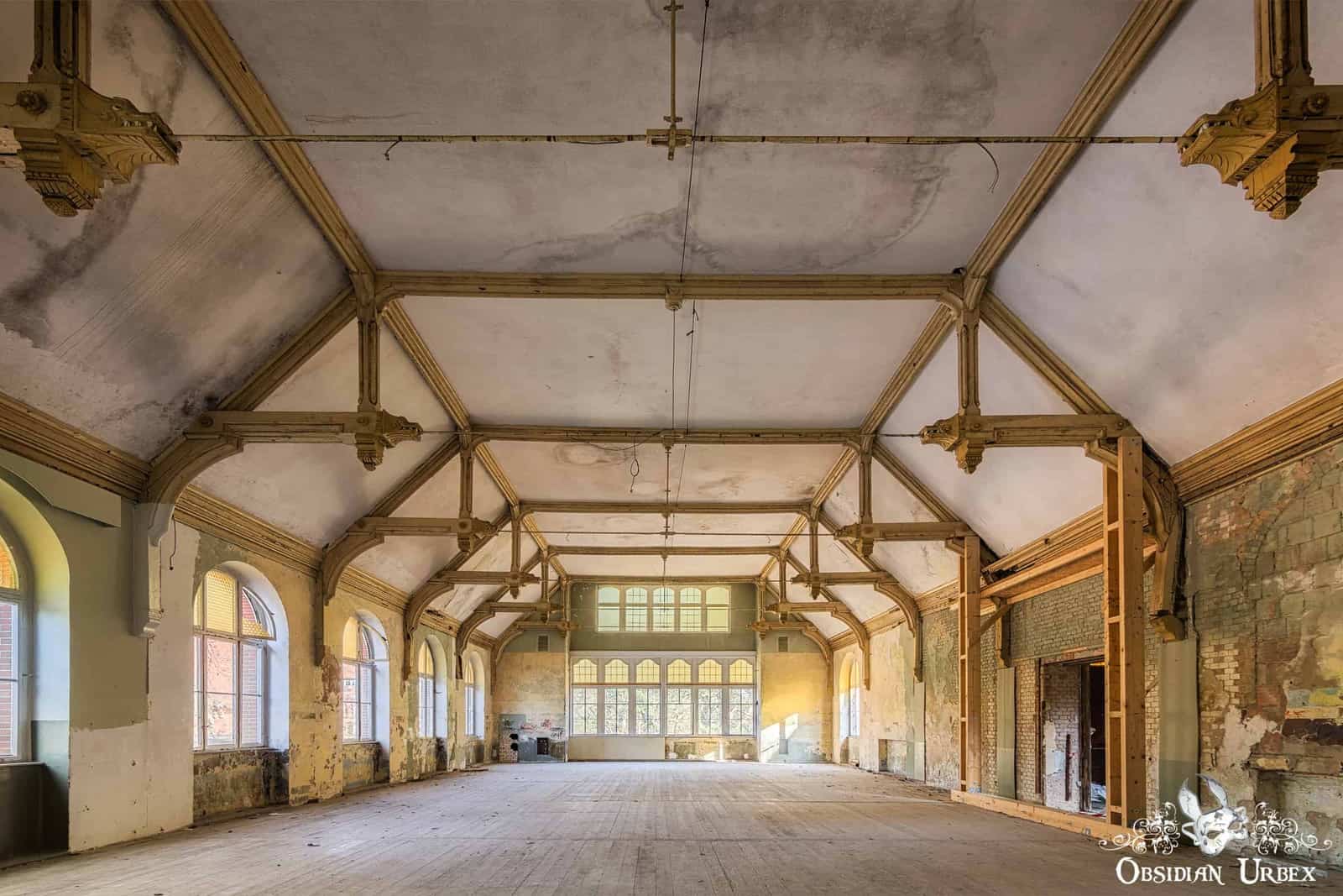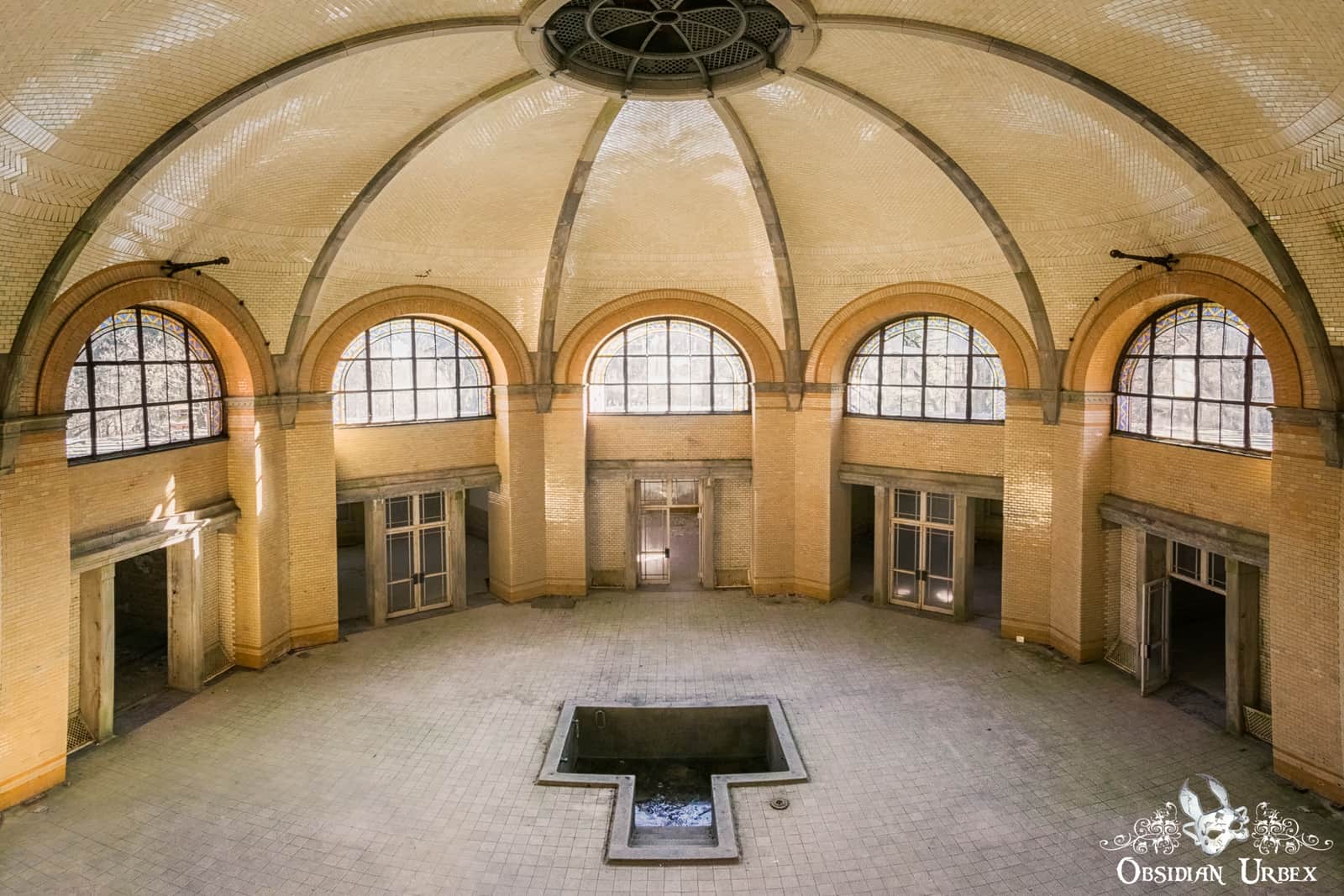 One of the most striking parts of Beelitz Heilstätten, is the cathedral-like bathing area of the Central Bathhouse. This semi-circular room has a domed ceiling. The chamber is well-lit by a ring of windows. The tiles are cream, yellow and orange. A T-shaped plunge pool sits in the centre. S