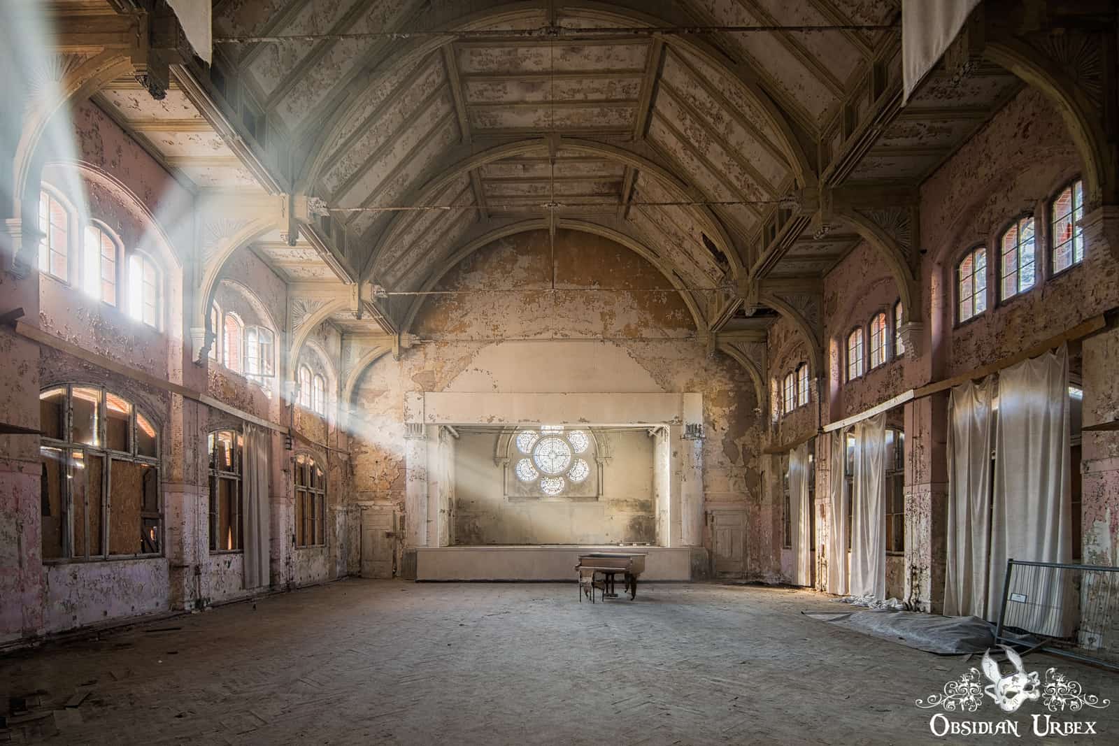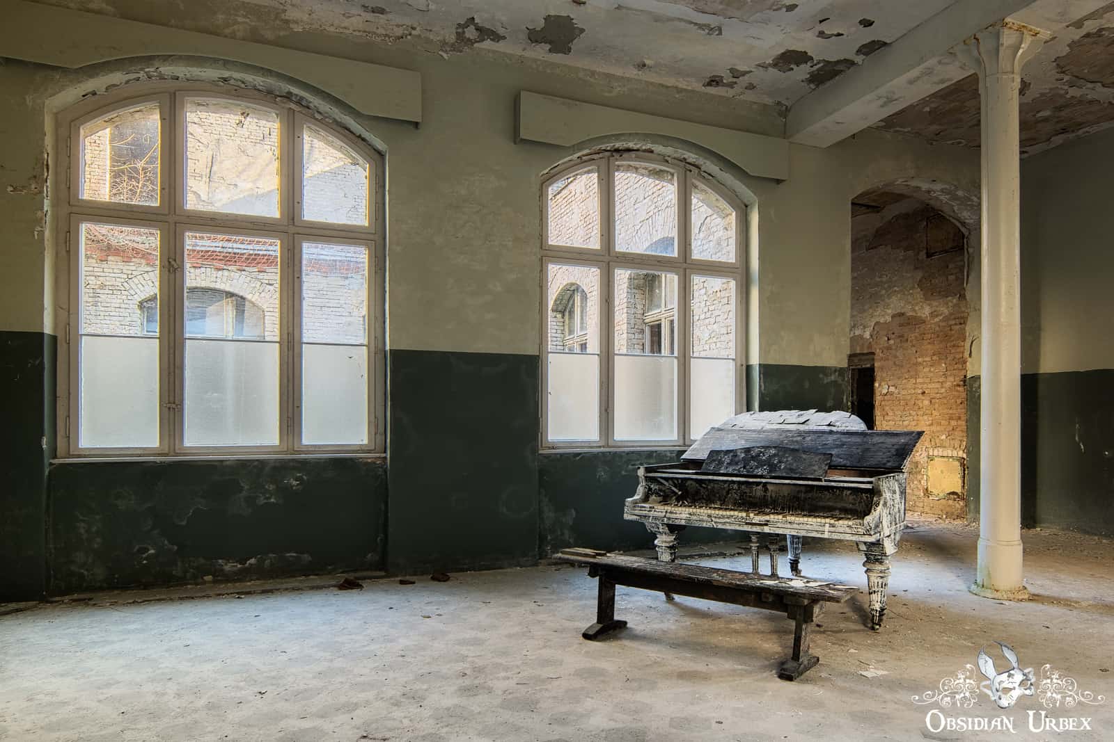 The Beelitz Heilstätten Tuberculosis Clinic was built between 1898 to 1902. The clinic had room for 186 patients. The building is also known as “Whitney Houston Haus”; a nickname derived from a banner that was once hung above the stage by some resident art students. There were plans to renovate this hall, but it seems that these have not come to fruition yet. In front of the stage sits a lonely piano and stool. When we entered the low evening light cast dramatic light rays across the room. One shaft of light falls directly on the piano; a happy coincidence of timing. In addition to this, the textures of the peeling rust-coloured peeling paint on the walls contrast beautifully with the grandeur of the ceiling.