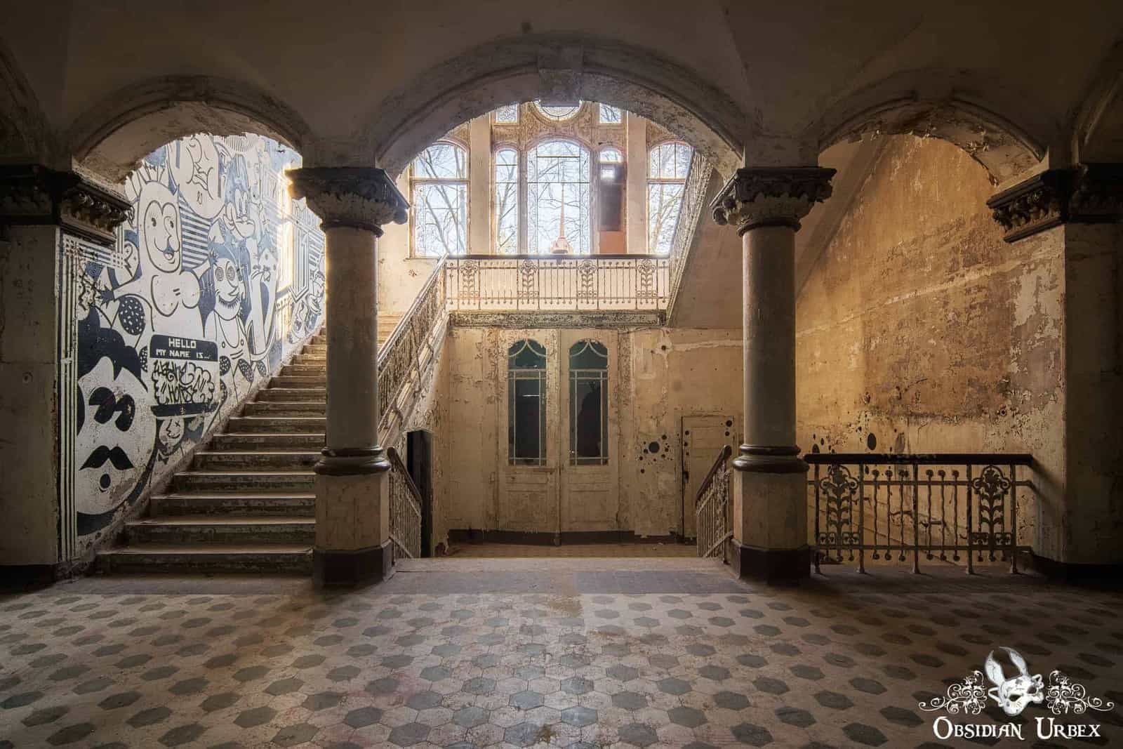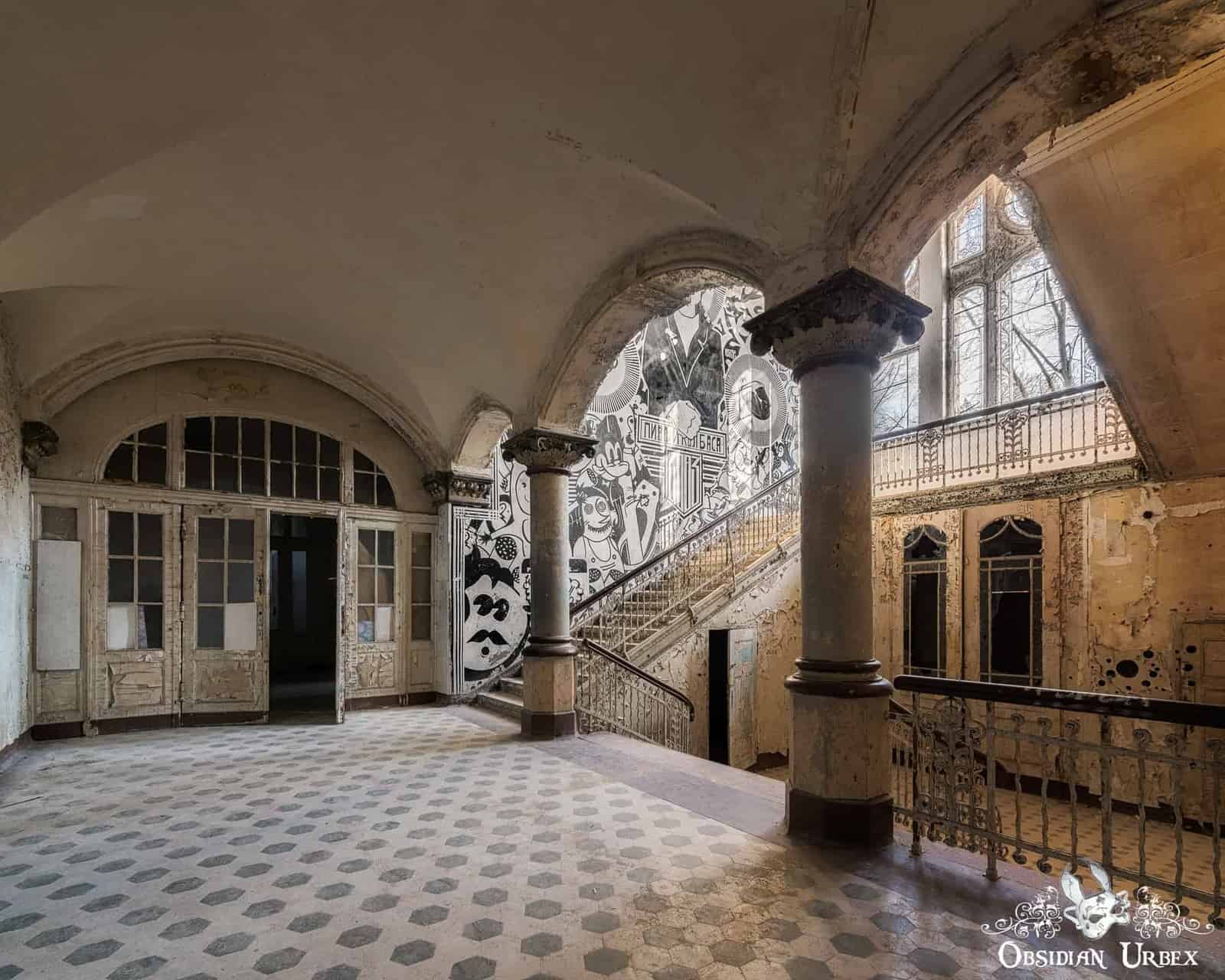 This building in the most decayed, providing some very photogenic corridors encrusted with peeling paint. The main entrance stairway is artfully gratified.