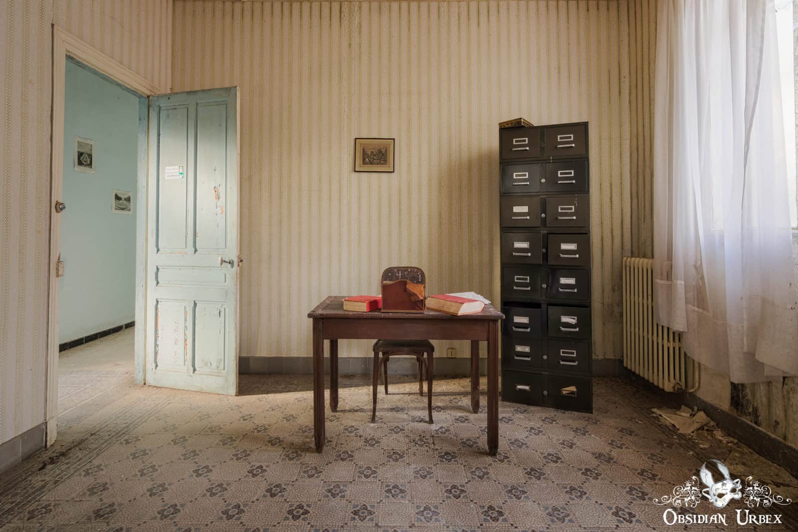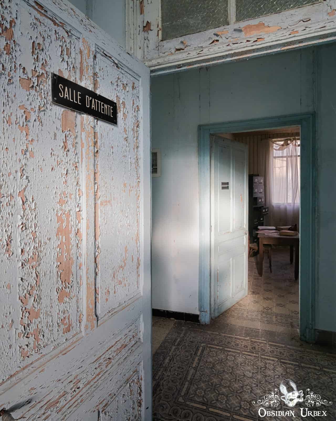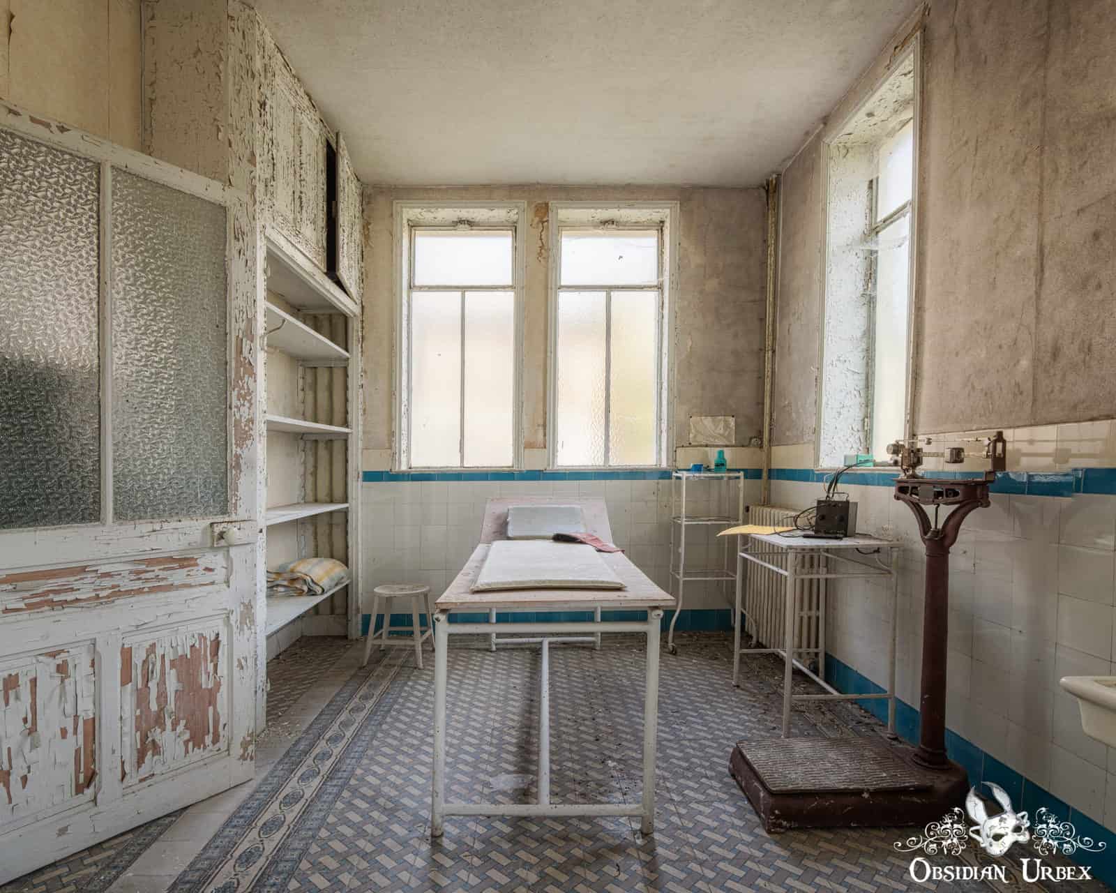 Another interesting area at Les Thermes Bleus is the medical wing. Inside this area is a doctors office. Papers and books lay scattered on the desk. Leading off from the office is a treatment or examination room. Inside this room there is a bed, vintage scales and a few other pieces of medical equipment. There is also a waiting room with leather benches where patients would await their appointment.