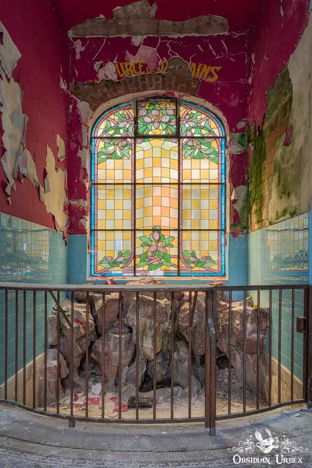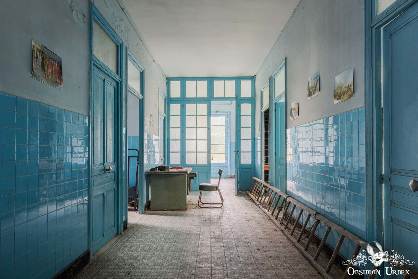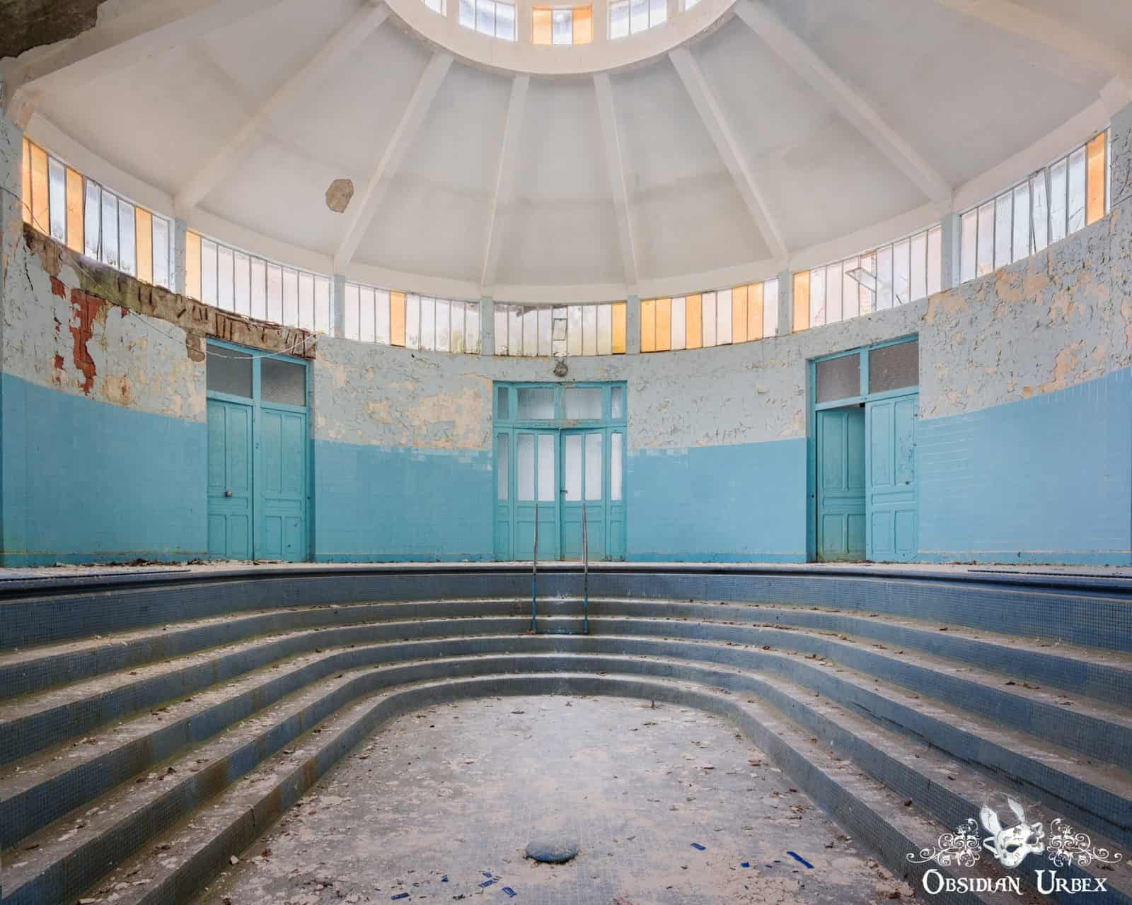 The main attraction here is the beautiful blue bathing pool. This oval-shaped bath is well-lit by a large skylight. There is abundant, beautiful natural decay to be seen here. The corridors on the ground floor feature similar blue tiles and are similarly decaying peacefully.