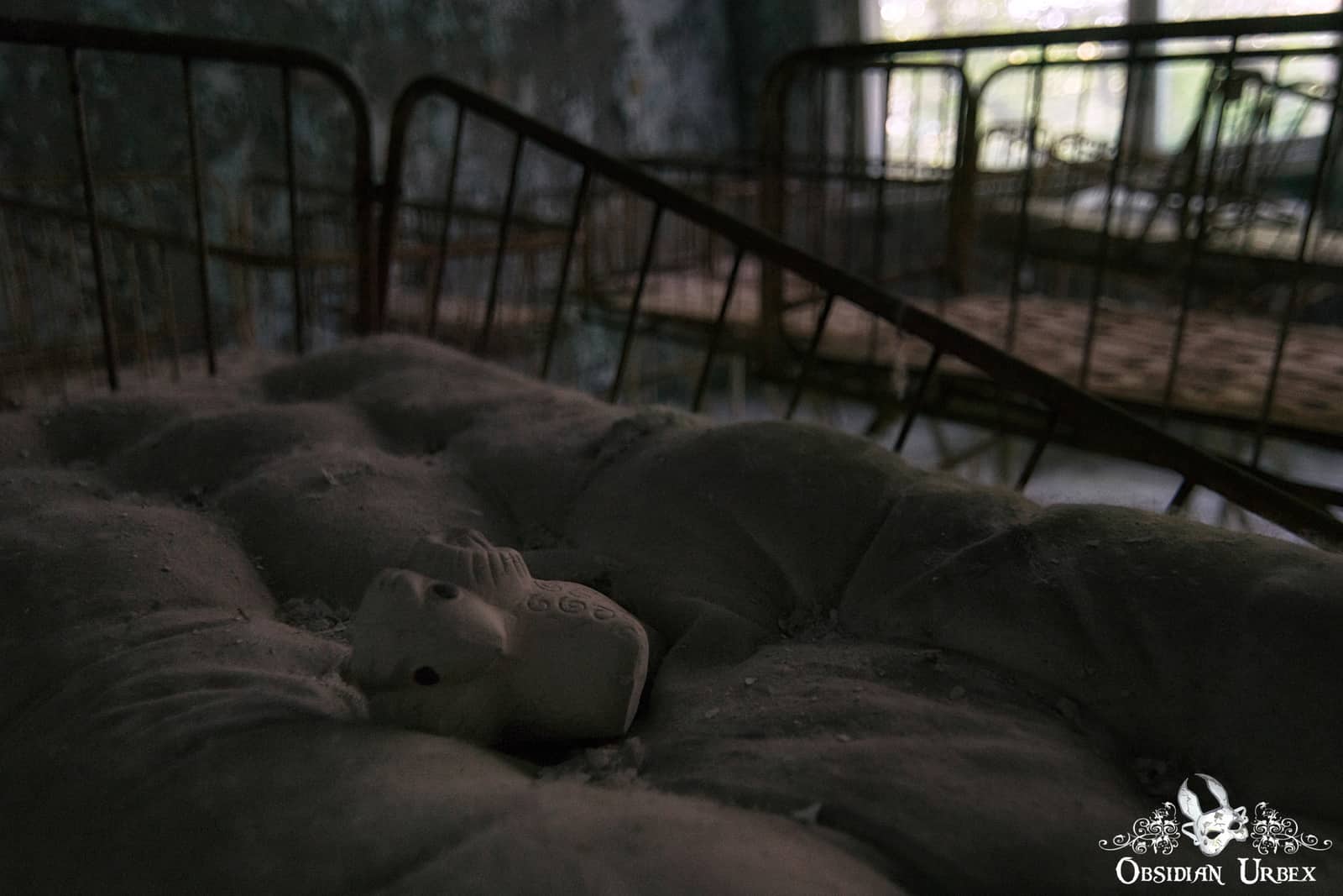 A maternity ward with baby cots can be found on one of the upper floors of Pripyat Hospital No. 126. A small child’s sheep toy lies on the mattress. Other rooms feature various medical paraphernalia; beds, examination chairs, bottles, jars and rare pieces of surgical equipment.