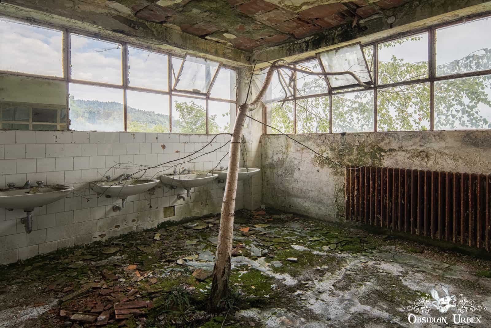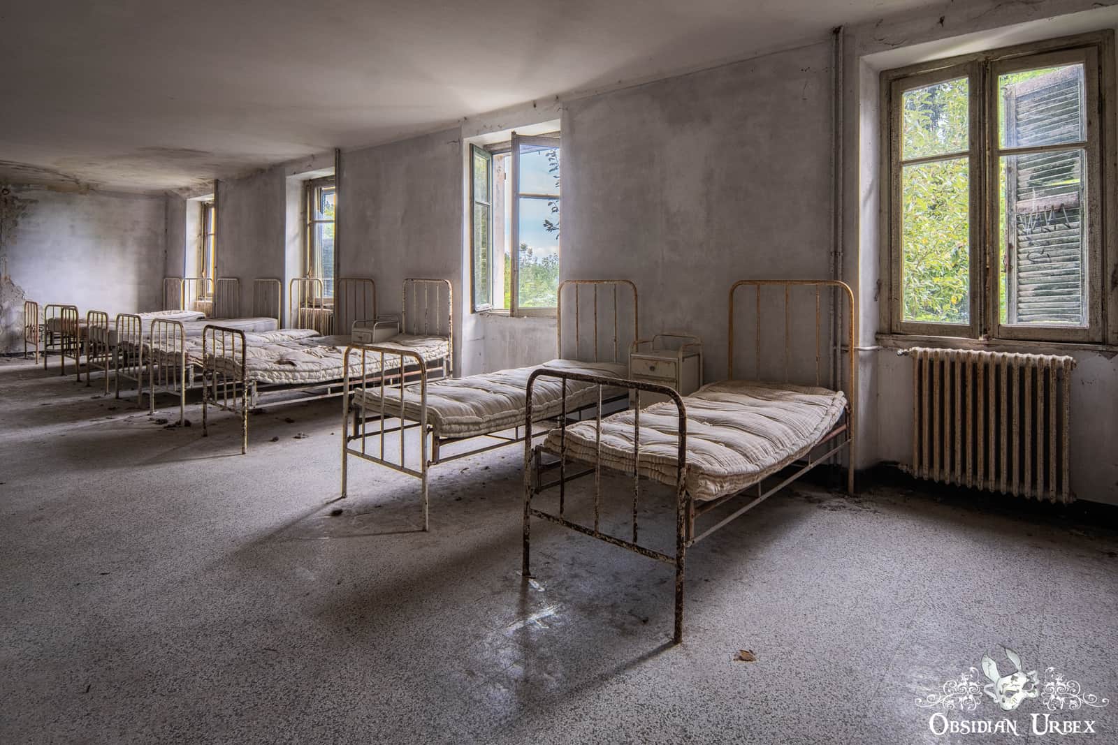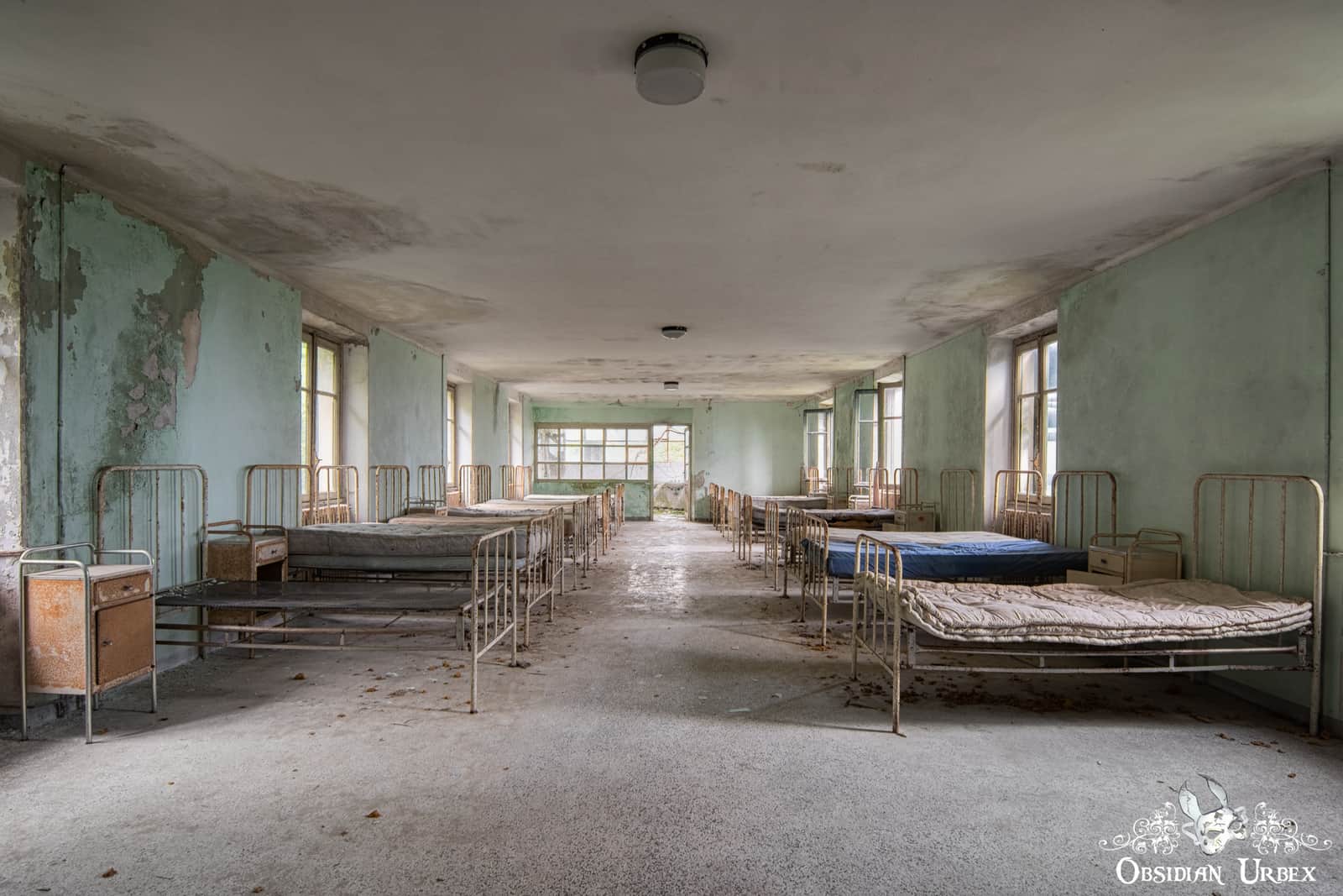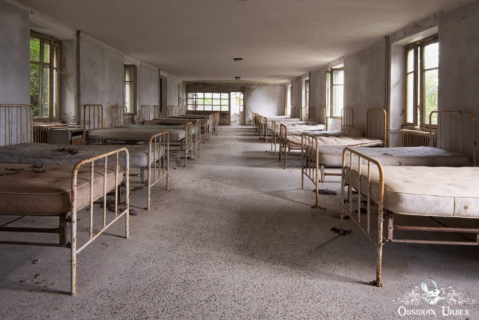 There are several dormitories on the upper floor, filled with metal beds. Children would sleep in these beds during their summer visits. There is a communal bathroom for each dormitory, and several of these now have trees growing in them. Nowadays, the building is mostly empty apart from these numerous metal beds and rotting mattresses.