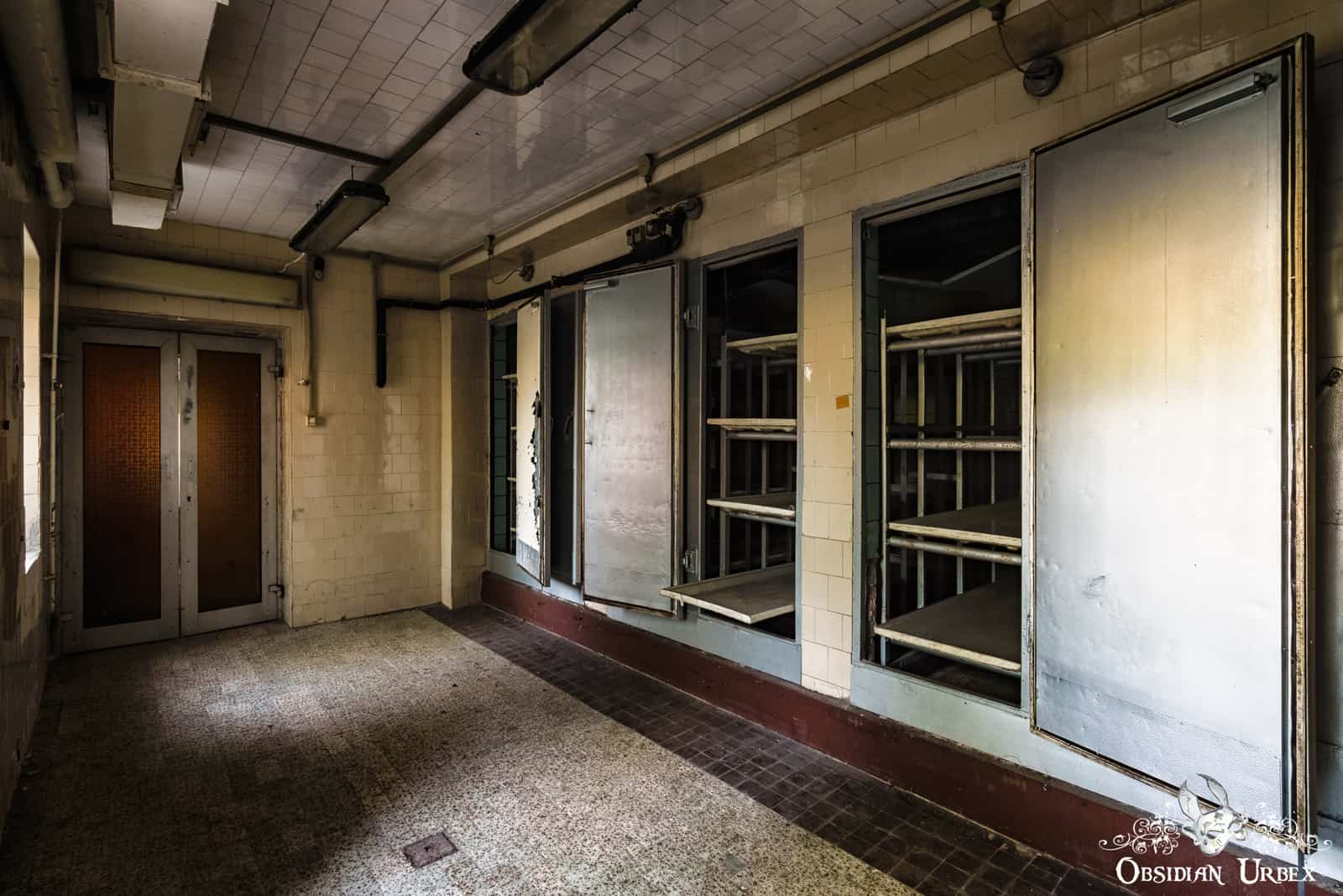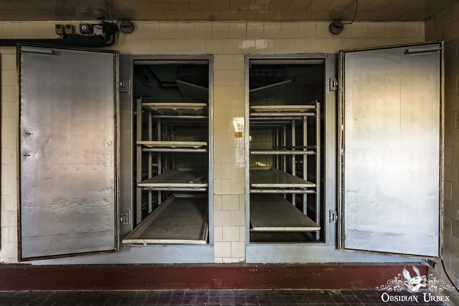 Off from the main room is a white tiled corridor with three cadaver fridges, with trays to store four bodies in each.