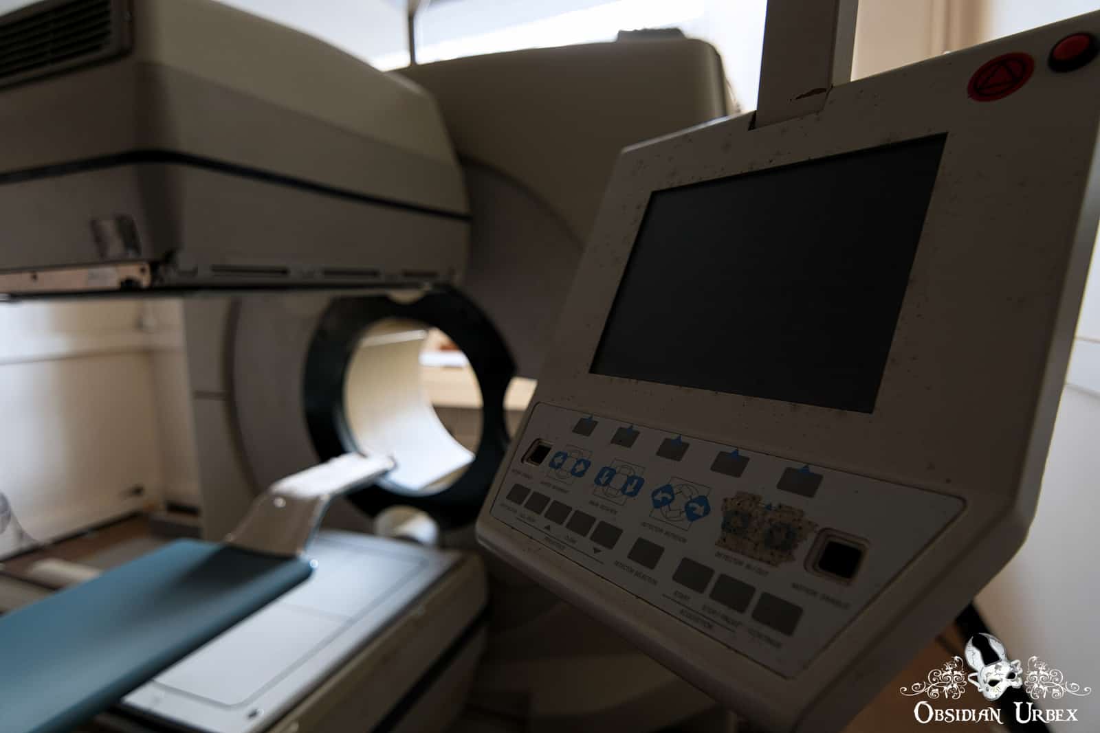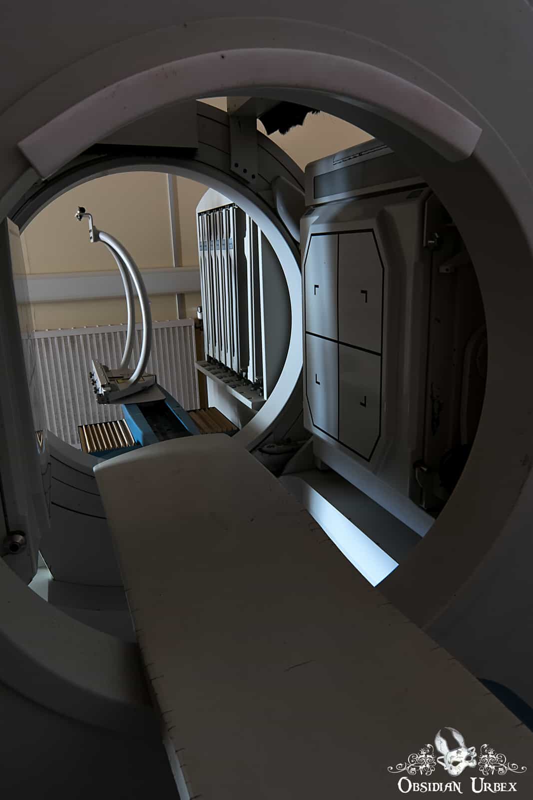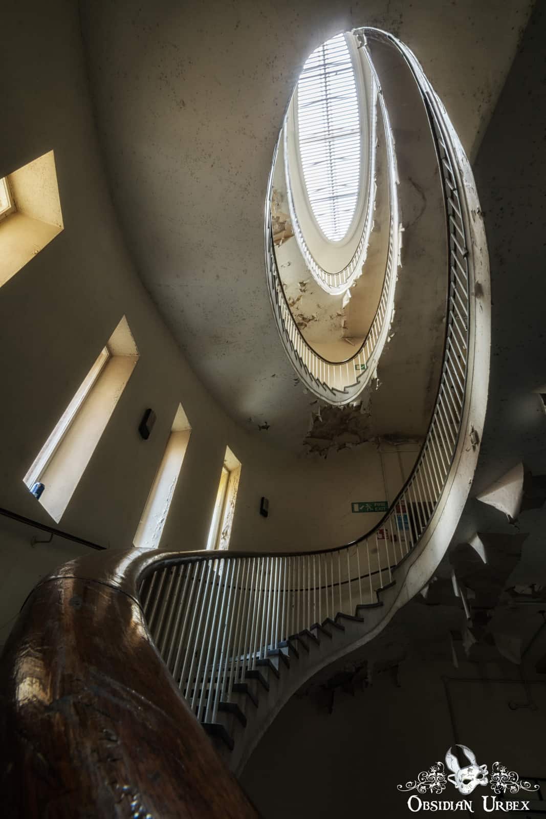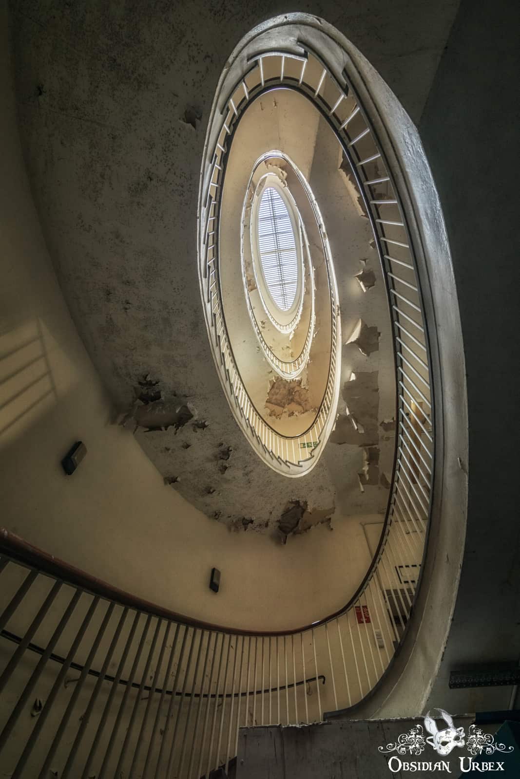 This hospital is massive, consisting of a large main quadrangle which is connected to the two side wings via long corridors called “crosslinks”. Navigating this monstrous collection of buildings is hampered by blocked corridors and locked doors. Several hours were spent wondering the complex, which had sadly had most of the machinery and fixtures removed by the time of our visit. We were still able to see; MRI scanners, laboratories with vials and centrifuges, hydrotherapy room and operating theatre. The best part of the hospital, is the famous elliptical spiral staircase. Having seen this in photographs, it was amazing to finally get to see it personally.
