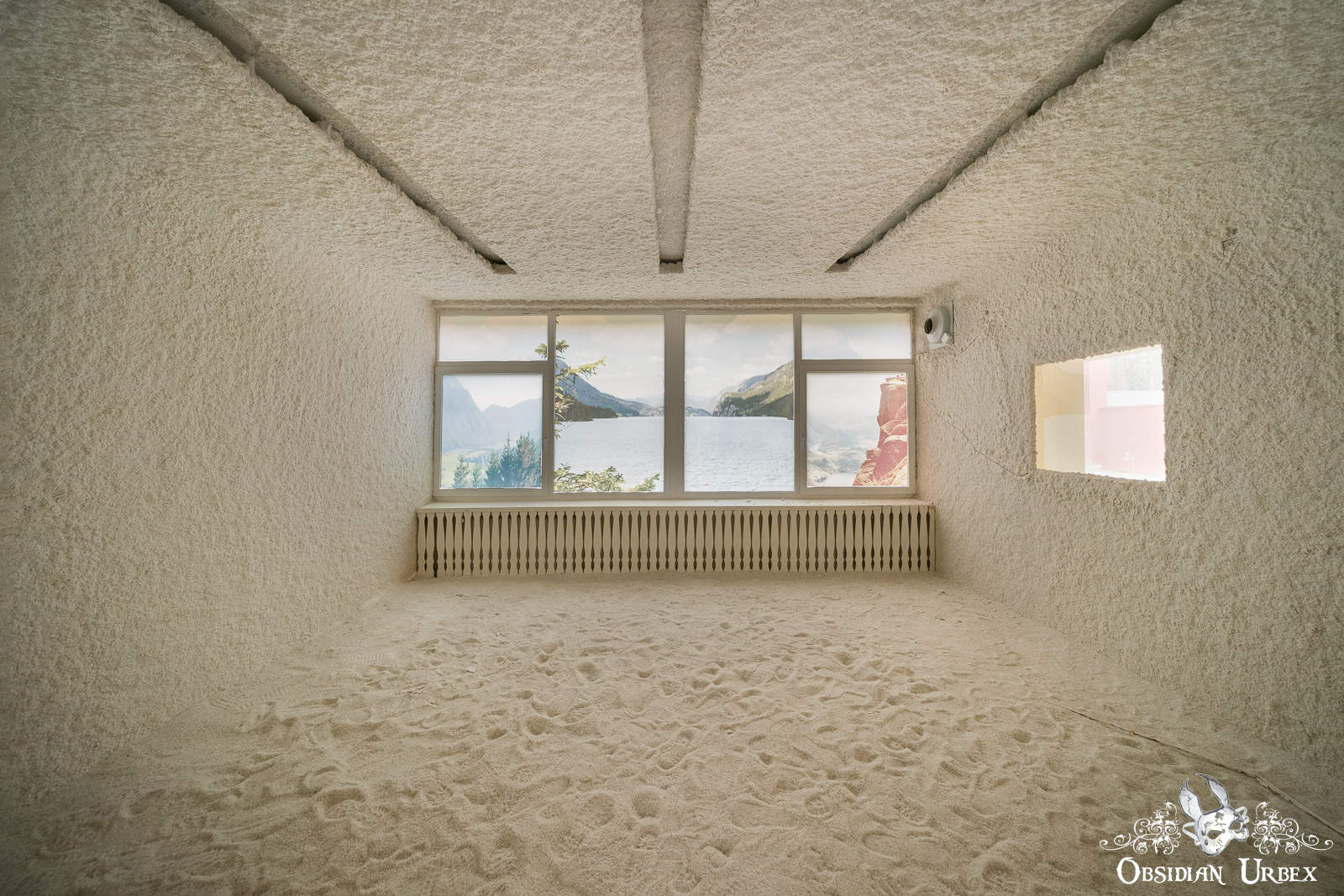 I was exploring the medical and therapeutic section when I stumbled across an unexpected room. Firstly, the floor is covered with sand! It’s several inches deep and snow white in colour. Nevertheless, that wasn’t the end of it; the same sand also coats the walls and ceiling. Photos of mountains and lakes, backlit by the sunlight outside, cover the large window . A window is located on the right wall, presumably for staff monitoring during the sandy sensory therapy session. The entire scene is most surreal, like something out of a dystopian sci-fi movie!