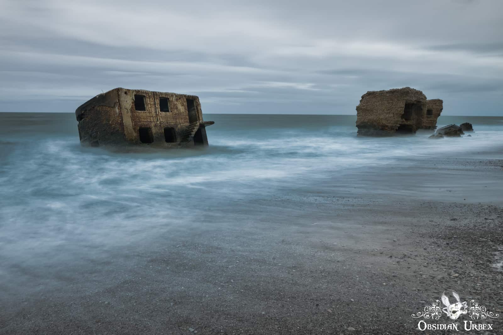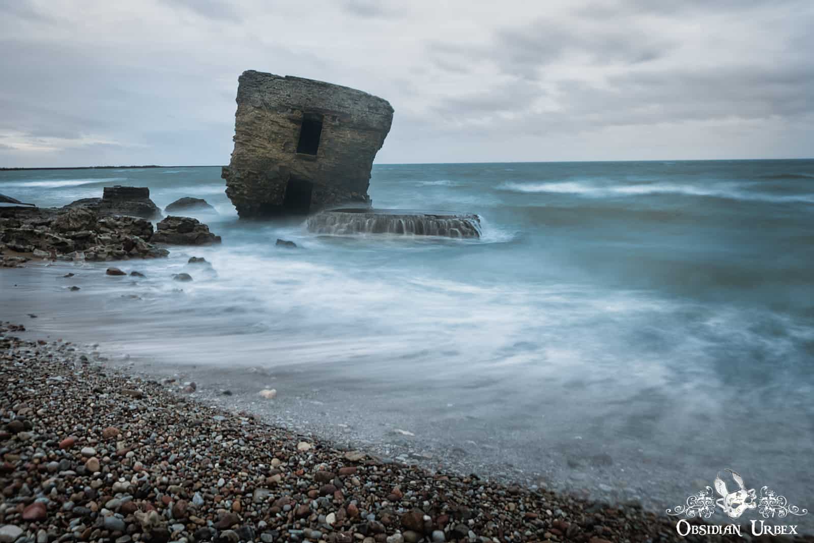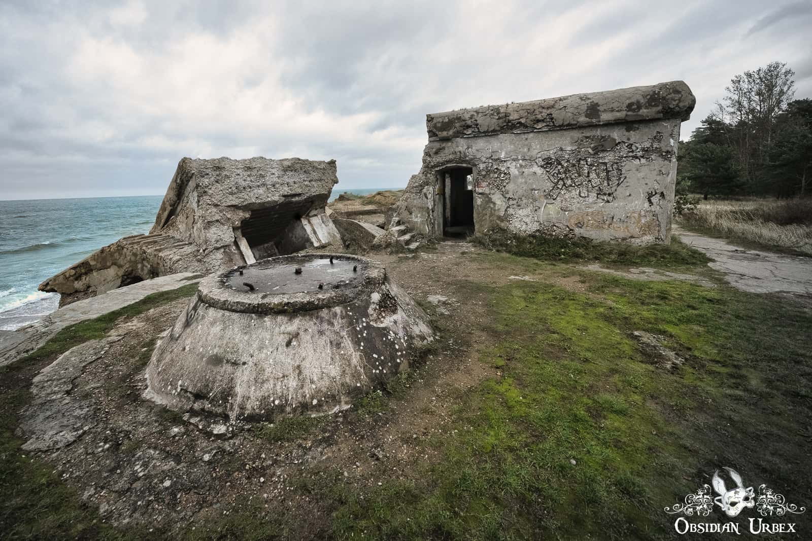 Karosta Sea Forts & Coastal Defence Battery are the remains of an old military establishment on the Baltic Coast of Latvia. The ruins consist of isolated buildings rising up from the sea, as well as the jumbled remains of destroyed fortifications and ammunition stores. Primarily, the broken and fractured concrete blocks are the result of intentional explosive demolition of the structures sometime before World War One. However, nature has also played a part over the intervening decades. The strong Baltic sea currents and fierce winter storms have further damaged the foundations of the buildings. Over the years the swirling eddies and driving waves have eroded away concrete. As a result of this, the buildings have tilted and sunk into the sands.