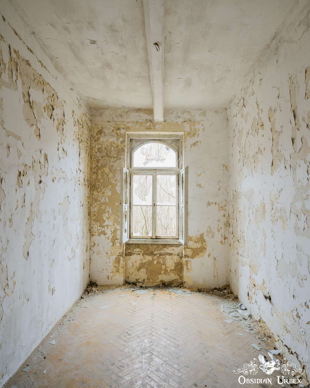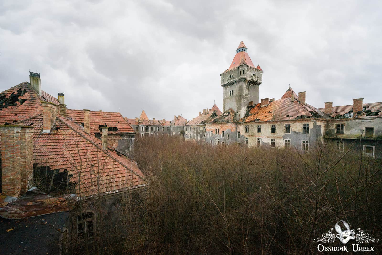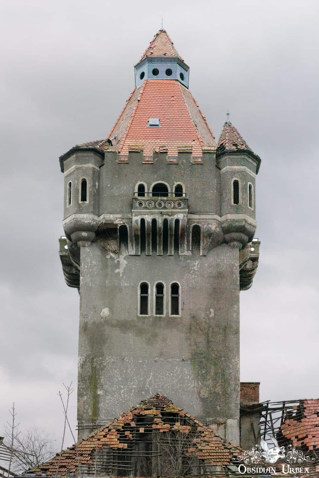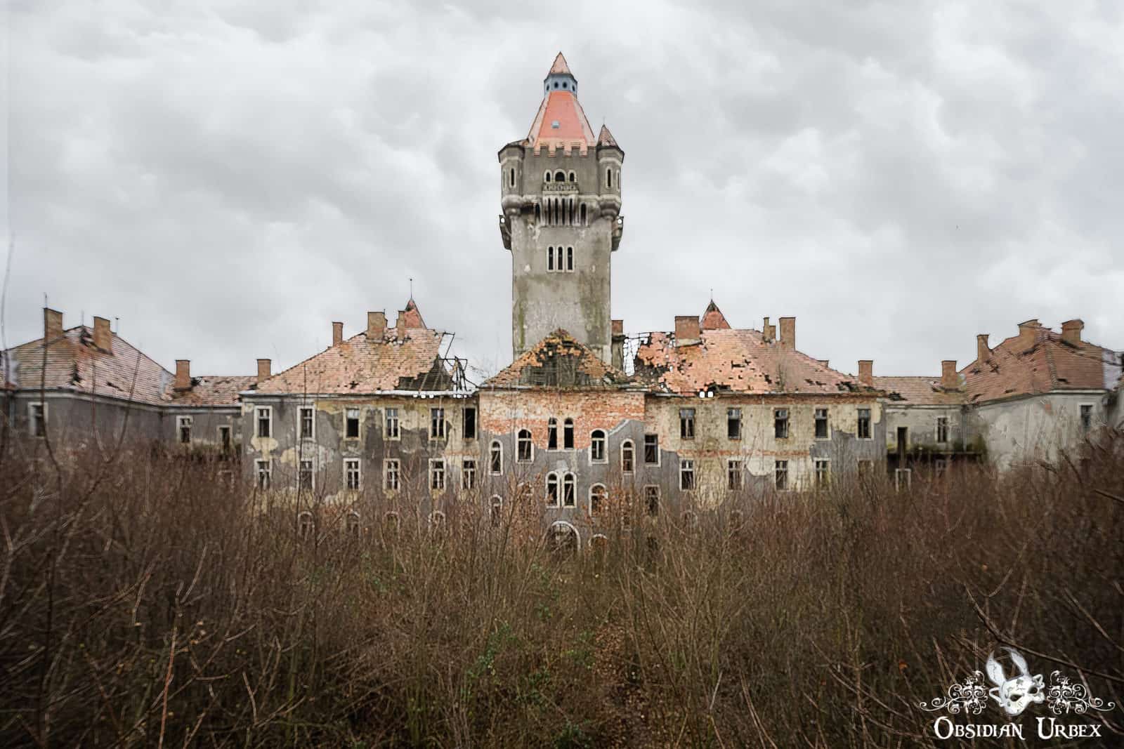 “Little Noisy” is an abandoned army barracks in eastern Hungary. The exterior is very striking. The architecture is reminiscent of a castle. The building features turrets and towers. The walls are dark grey, mimicking the grey moody skies on the day of our visit. The exterior is similar to a classic abandoned location in Belgium, Chateau Miranda, which was also known as Chateau Noisy.