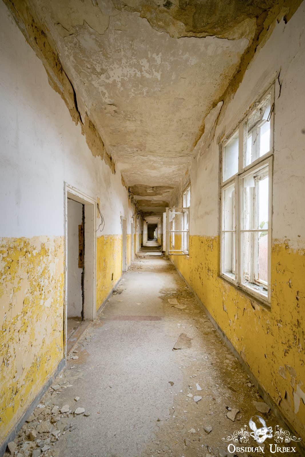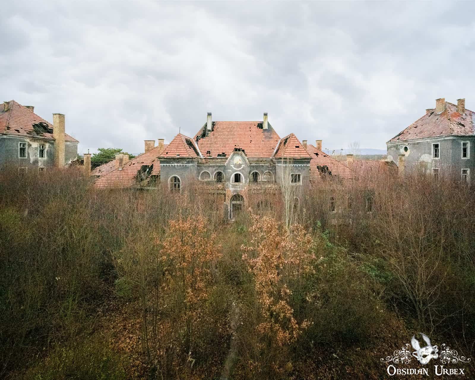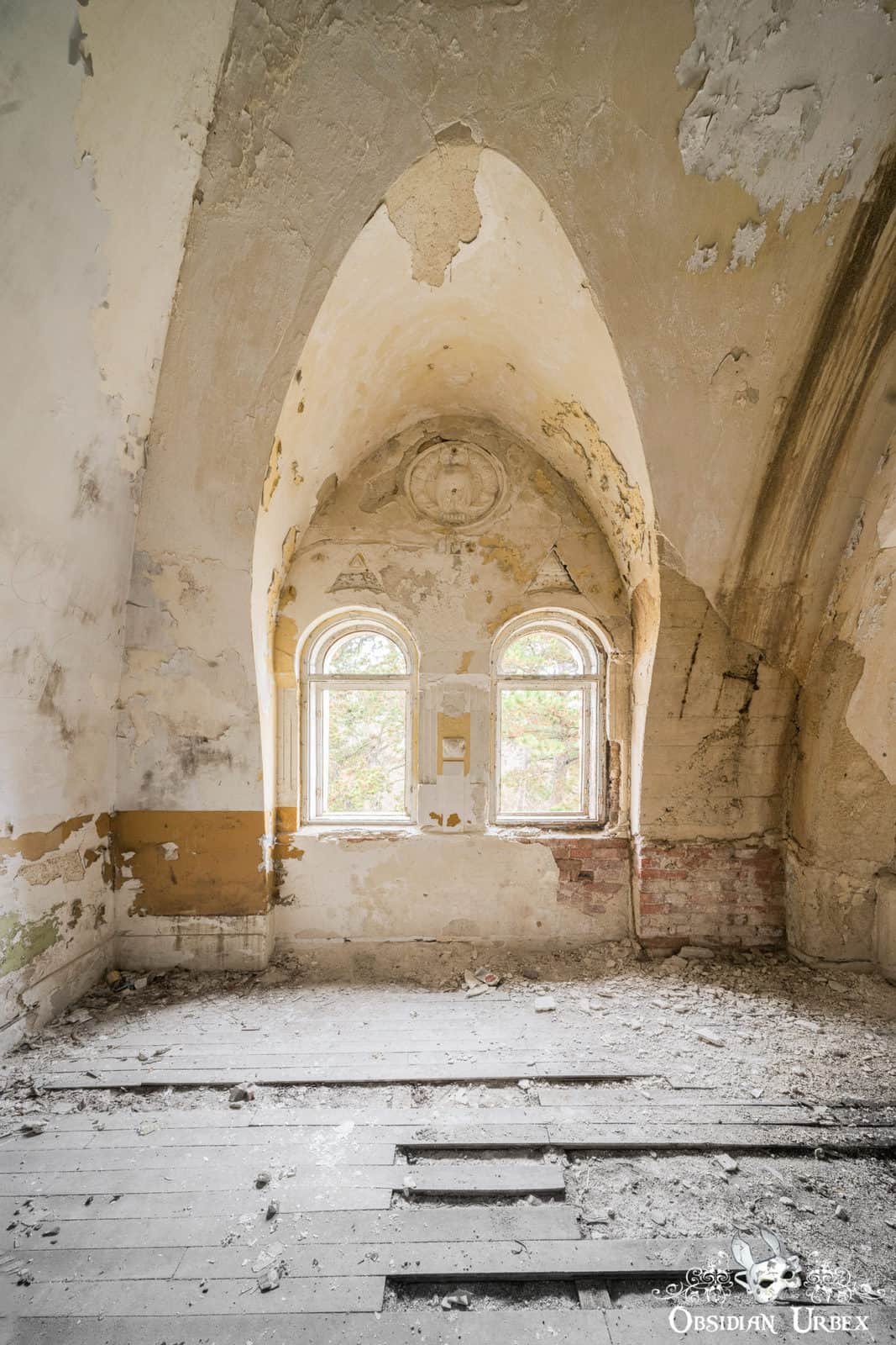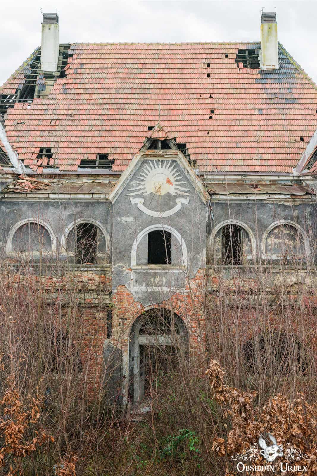 “Little Noisy” is an abandoned army barracks in eastern Hungary. The exterior is very striking. The architecture is reminiscent of a castle. The building features turrets and towers. The walls are dark grey, mimicking the grey moody skies on the day of our visit. The exterior is similar to a classic abandoned location in Belgium, Chateau Miranda, which was also known as Chateau Noisy.