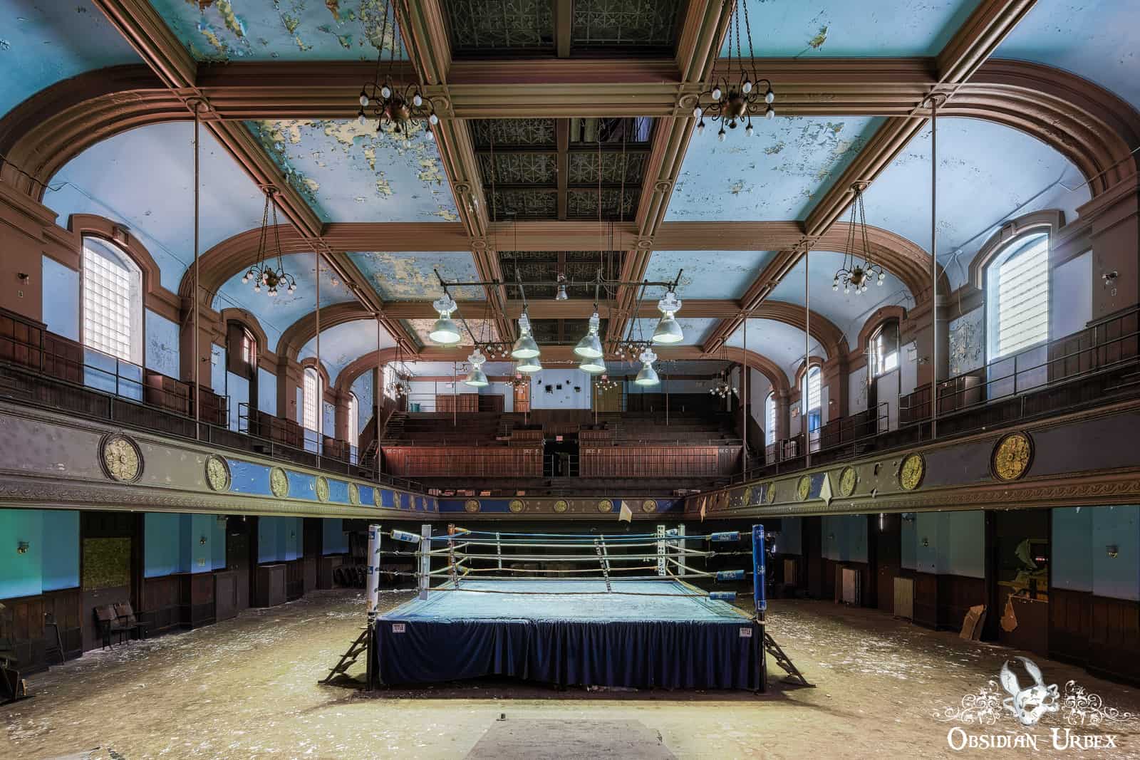 The Blue Boxing Ring was a famous sports venue in the United States. Numerous sport magazines and commentators herald this prestigious arena as “the last great boxing venue” and “the number-one boxing venue in the world. It opened in the early 1960’s. Now the building lies unused, quietly decaying behind locked doors. The hot halogen lights still have power, and with a flick of the switch some of the atmosphere of this spectacular place can be restored. The ground floor would have been packed tightly with stools and folding chairs on fight night, and the spectators would eagerly lean over the guard rails on the upper tier seating to get closer to the action.
