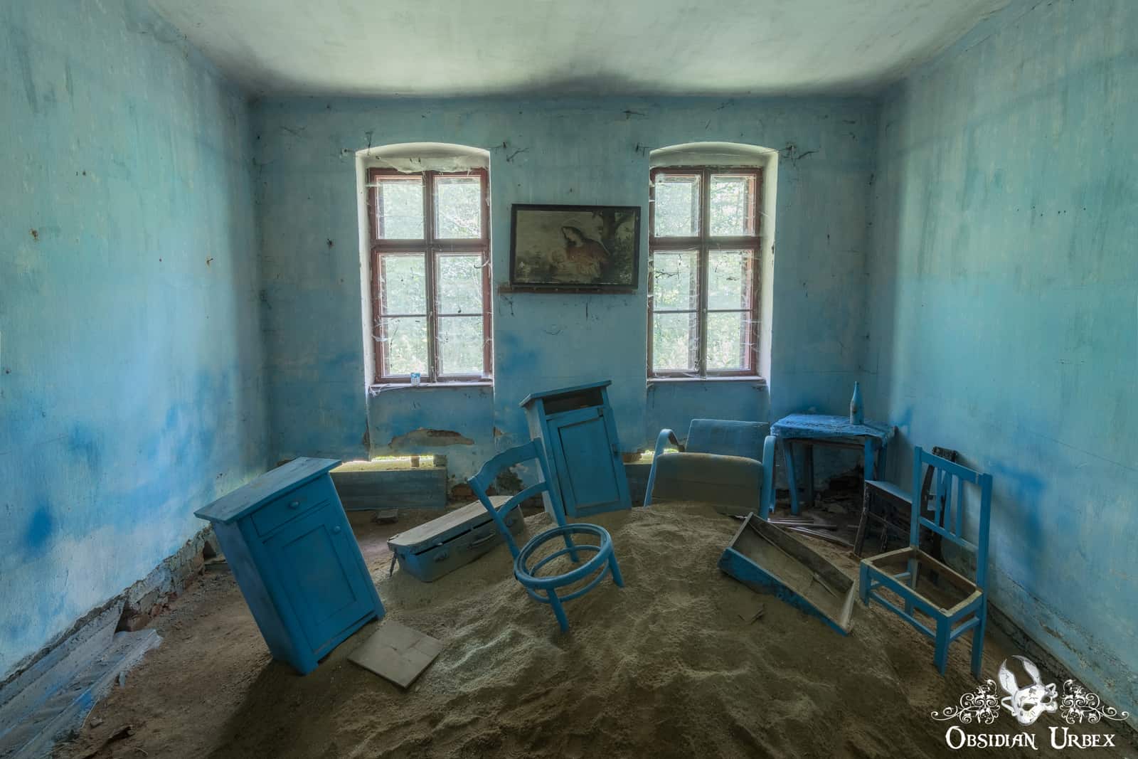 The room is painted bright blue, with a single painting the Virgin Mary, holding the infant Christ, is hung between the two long windows. The room is curiously filled with sand, and furniture lies scattered around randomly. The furniture is painted the same colour as the walls, even the sofa has been painted. From asking other explorers from Austria, Blue Sand Room is thought to be an art installation or artist’s project. I could not find out who the artist was, so perhaps they are yet to become famous.