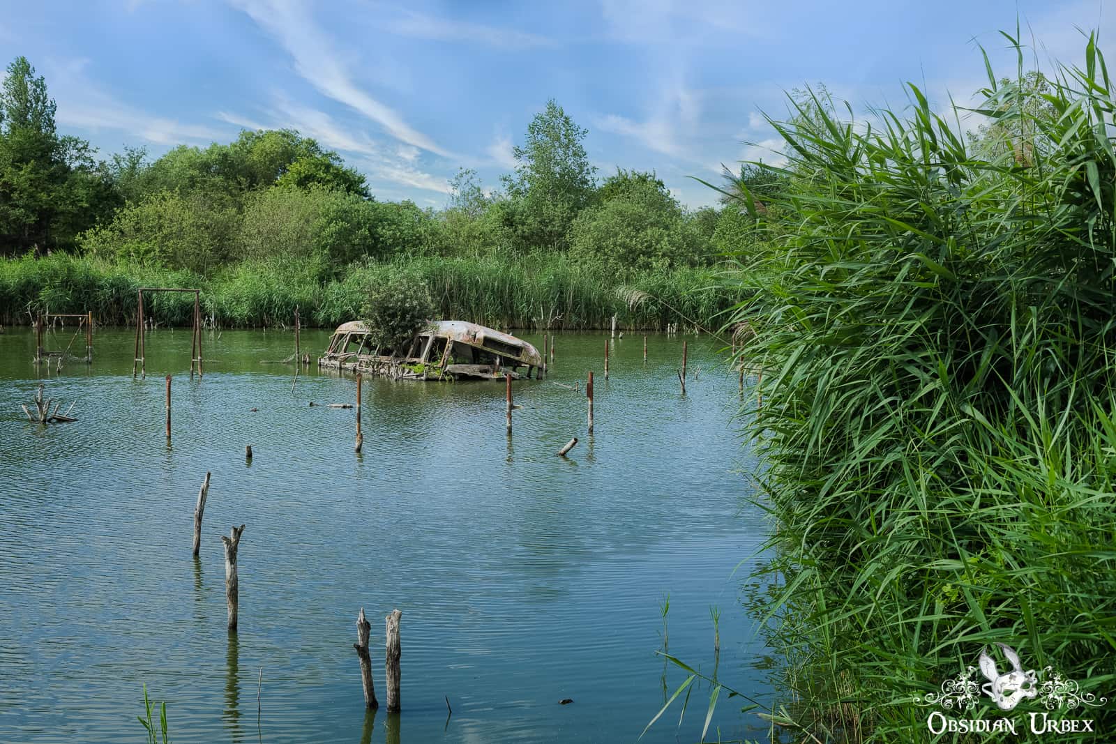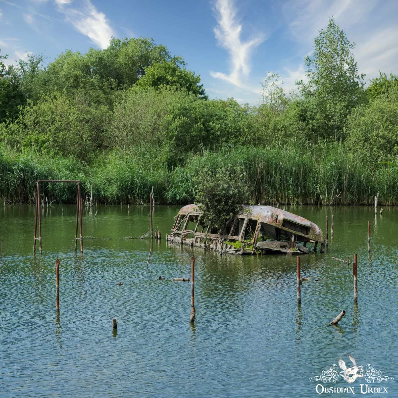 Buswrack im See is an abandoned bus, partially submerged in a salty lake. This interesting scene is located in east Germany. We visited this location in during the Germany Summer 2020 – The GDR Ballroom Tour.