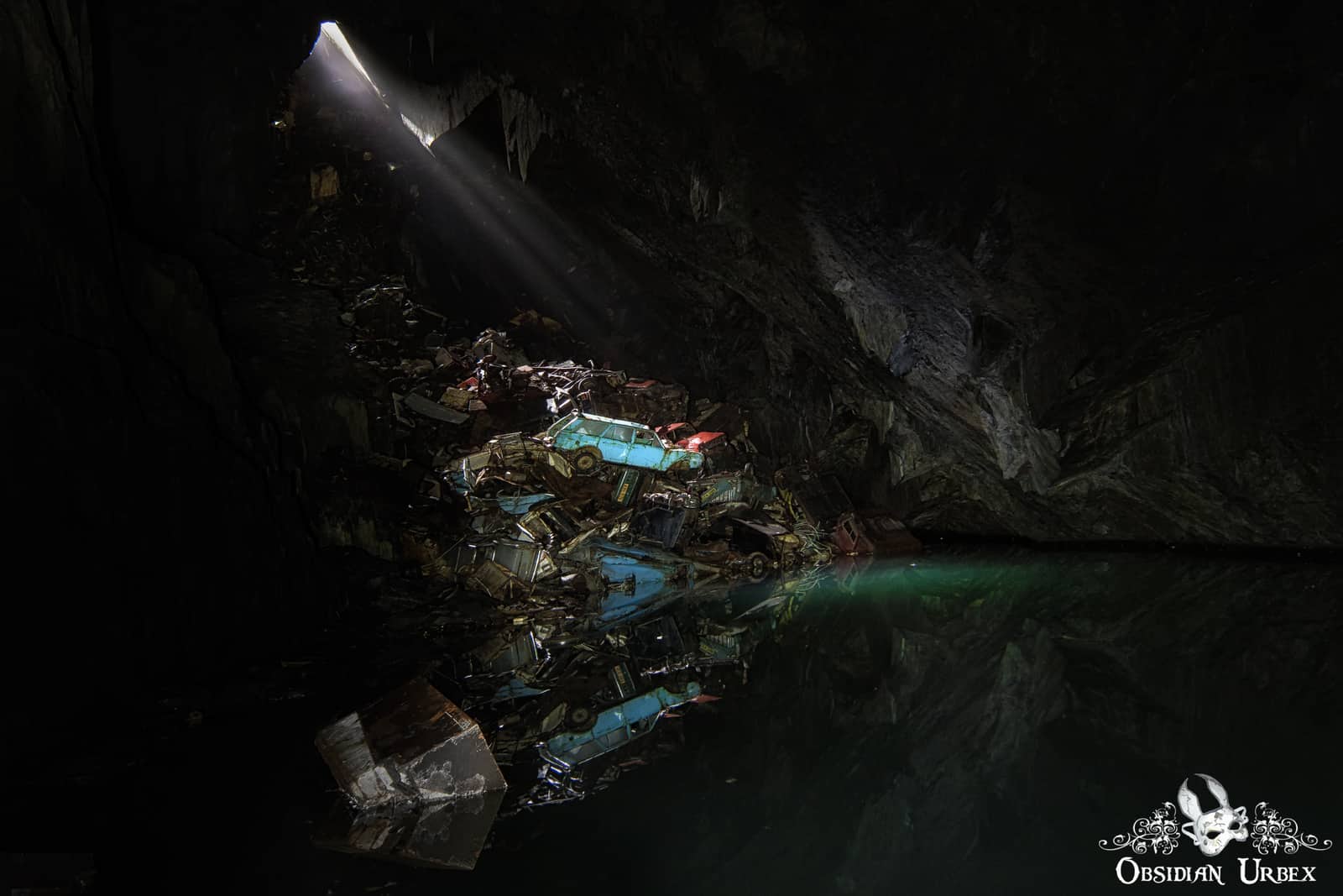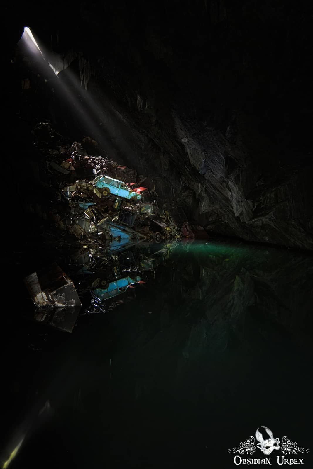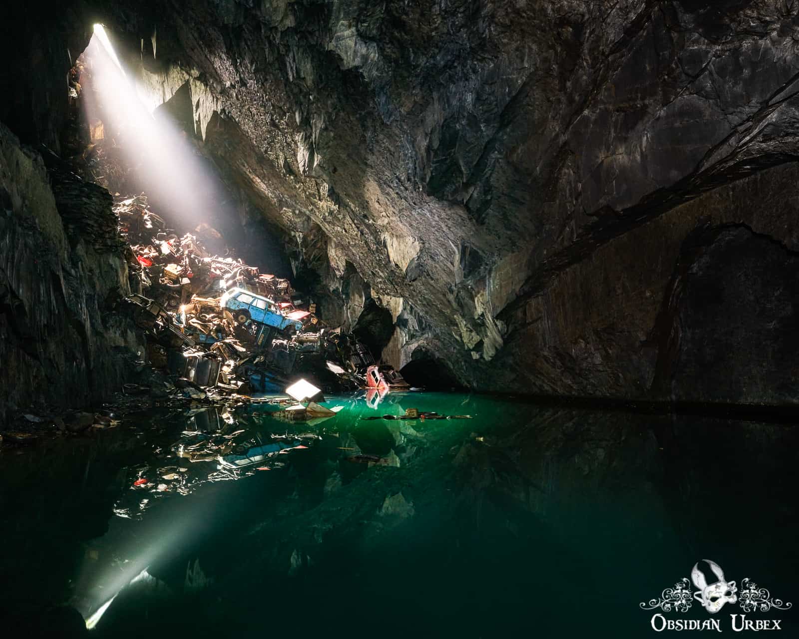 Two large chambers are accessible, one of which is of interest here. The main chamber is around sixty-five feet deep. This Cavern of Lost Souls chamber is deeply flooded, with a small opening to the surface. Since the mine closed, locals and the council have used this opening to dump a wide array of unwanted items. Fridges, TVs, microwaves and even whole cars are piled up at one corner of the mine chamber. The Cavern of Lost Souls is lit by a single ray of light, illuminating the twisted pile of wrecked cars and metal. The water in the cavern is revealed to be striking turquoise-green where the light strikes it. Breathtaking reflections of the cars and cavern walls are cast across the millpond-still water. The occasional falling pieces of slate break the silence and send out ripples.