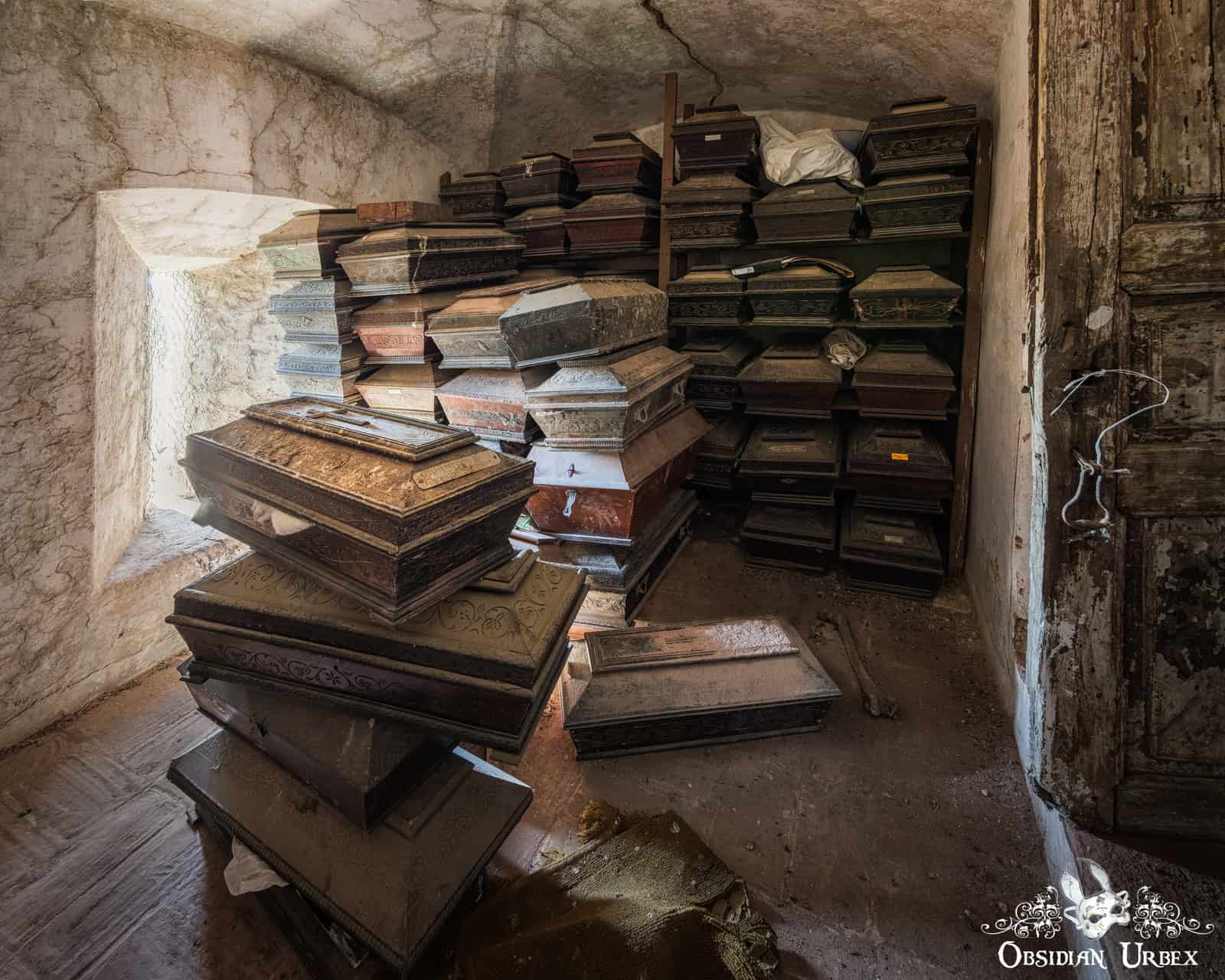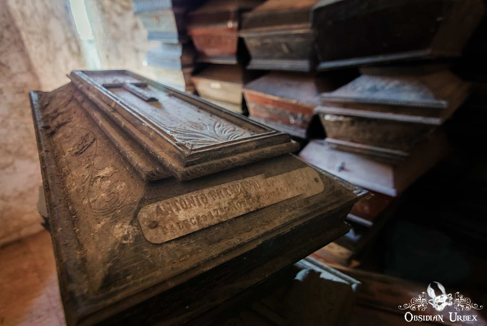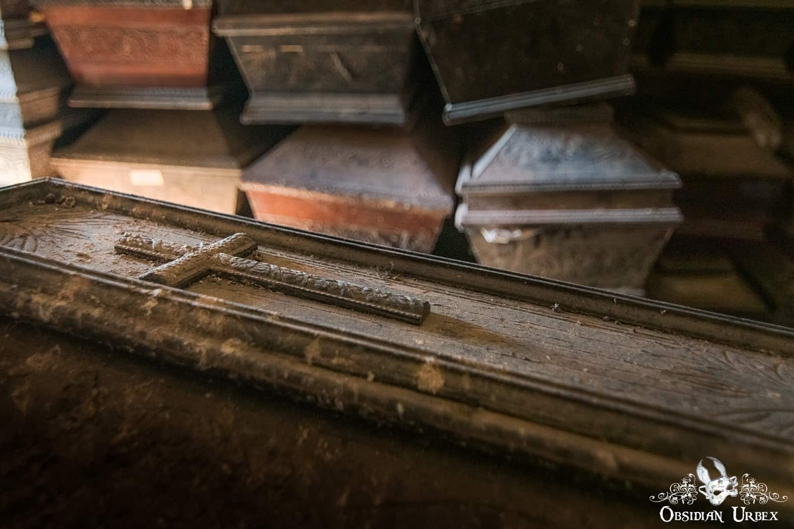 Cemitério Ossuary stands in a frequented and well-maintained cemetery. This location is a dark tourism site, and not an abandoned place. The church area has lit candles, as well as trinkets and flowers from recent visitors. However, the ossuary appears to be not visited regularly. In support of this, a thick layer of undisturbed dust covers the caskets.