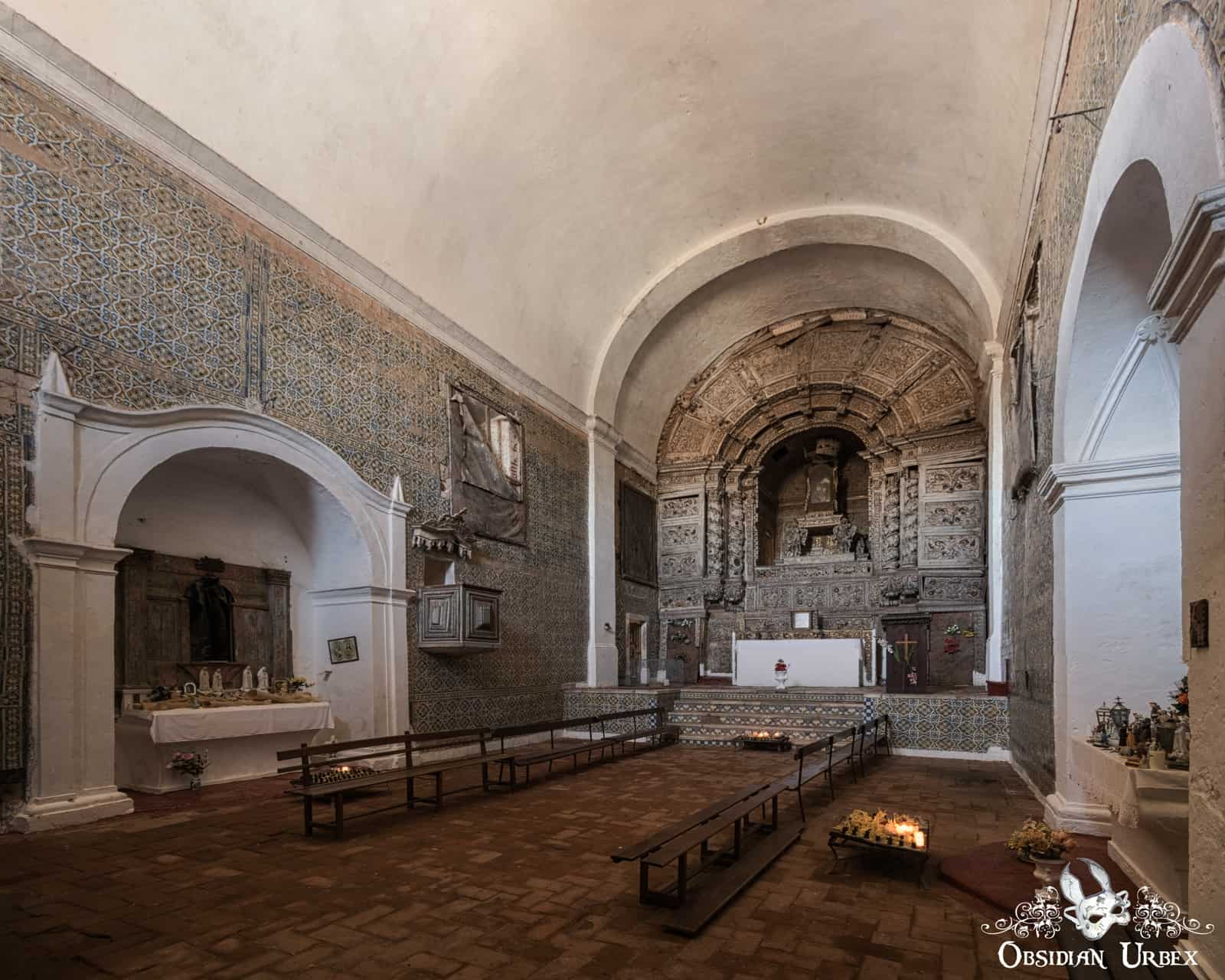 The altarpiece is beautifully gilded with gold, and is made out of carved masonry. The altar table is urn-shaped, and also made of masonry. Presently, the altar is covered by a white table cloth. The walls are covered with patterned polychrome tiles, which are over 300 years old. The pulpit is attached to the wall, on the left side of the nave. This wooden box is gilded and polychrome and is cushioned.