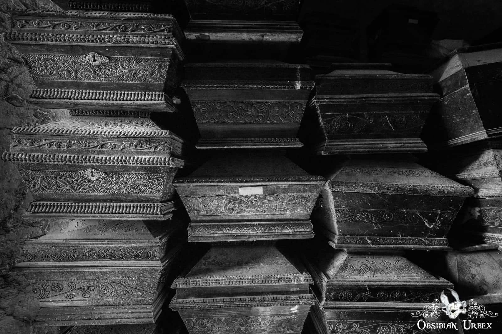 There is an old wooden door, leading off from one side of the chancel area. In this side room, is an ossuary. Here, human remains are stored in small wooden boxes or caskets. These small caskets are ornately carved, many also feature wooden crosses.