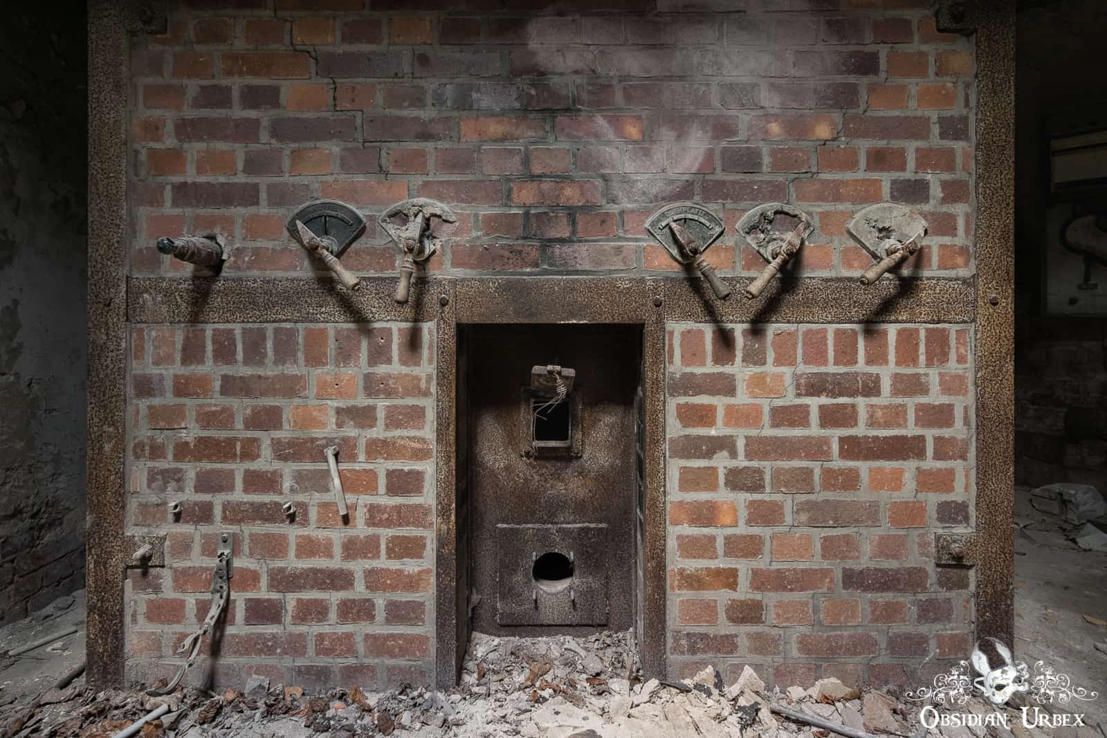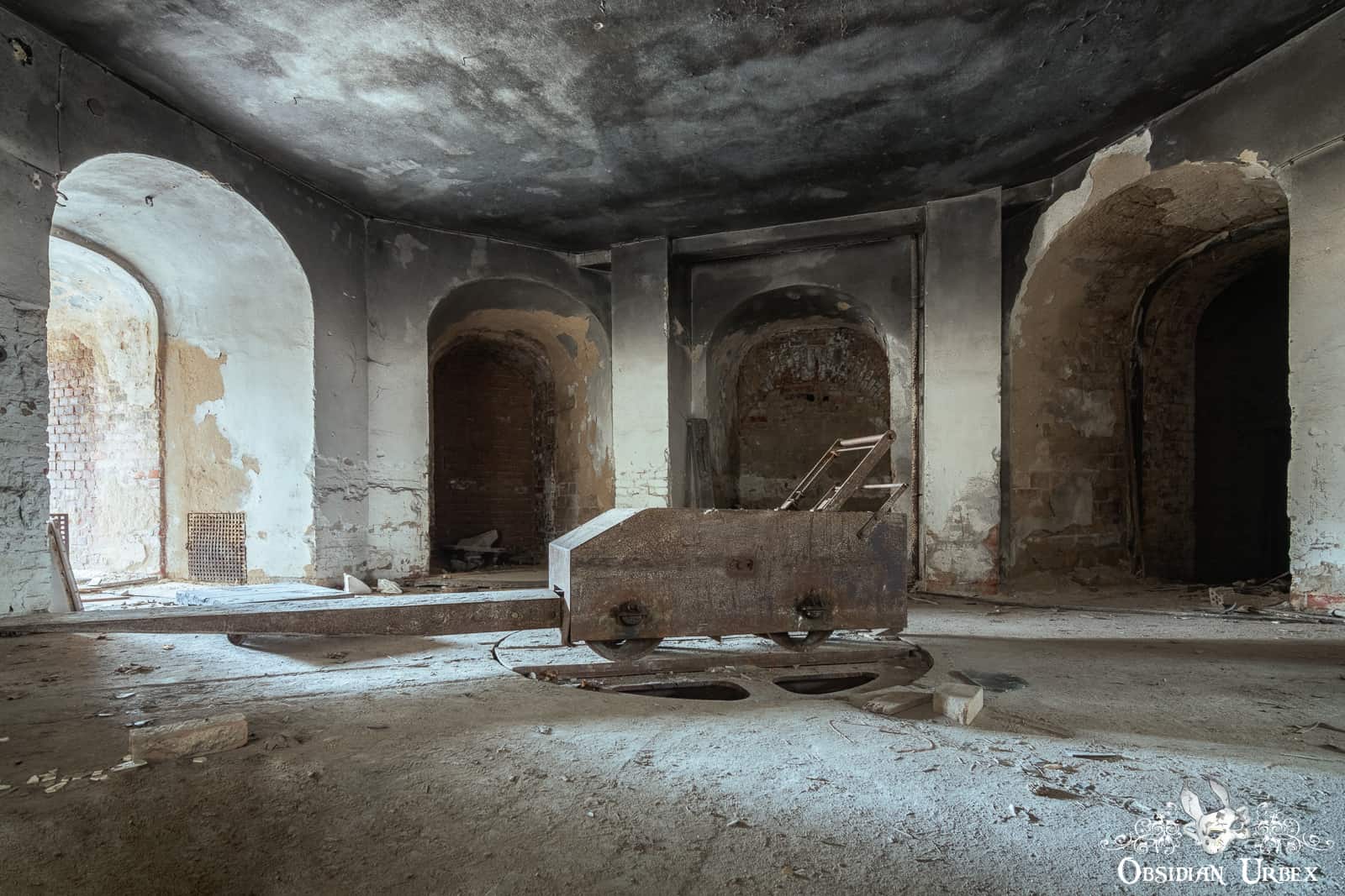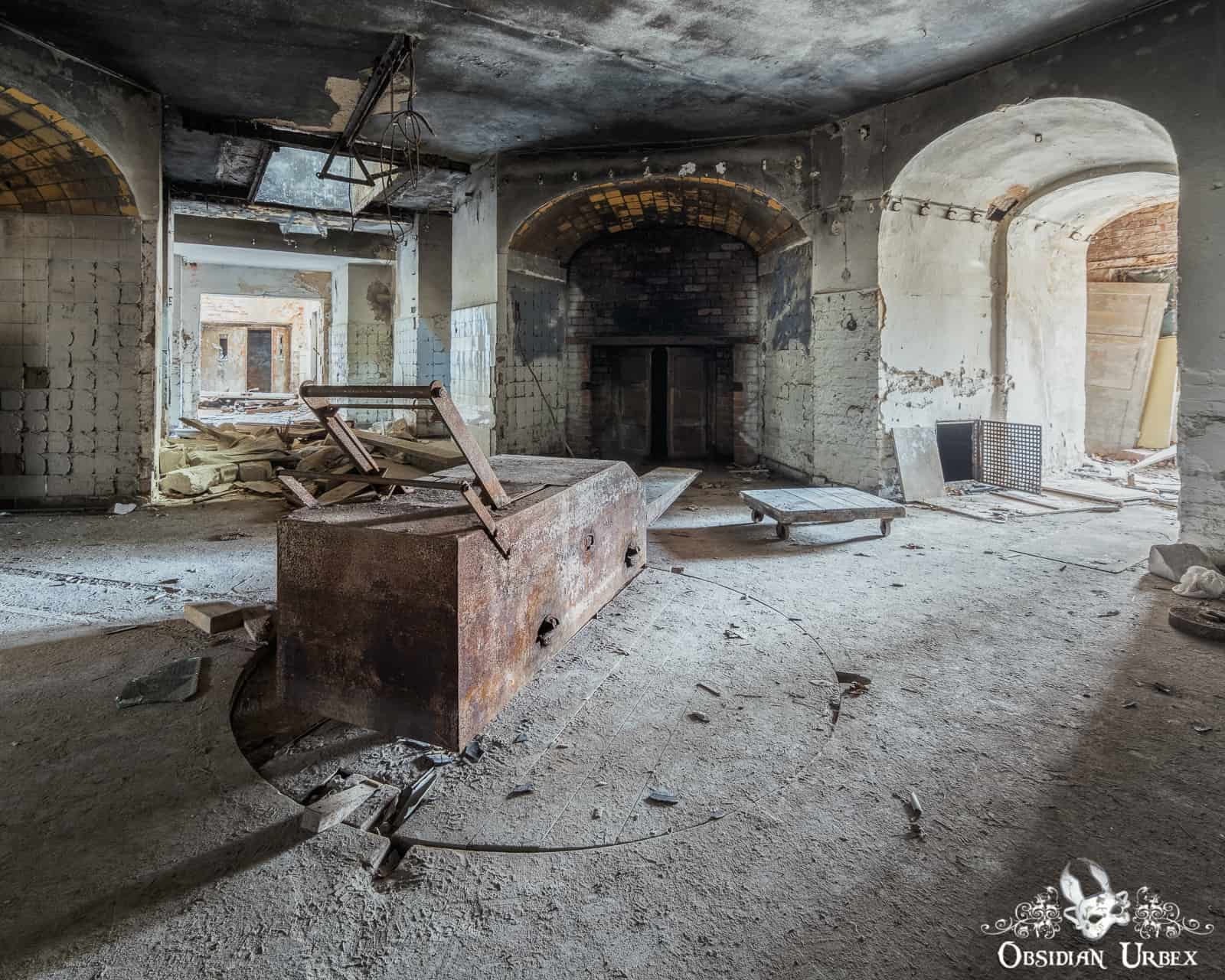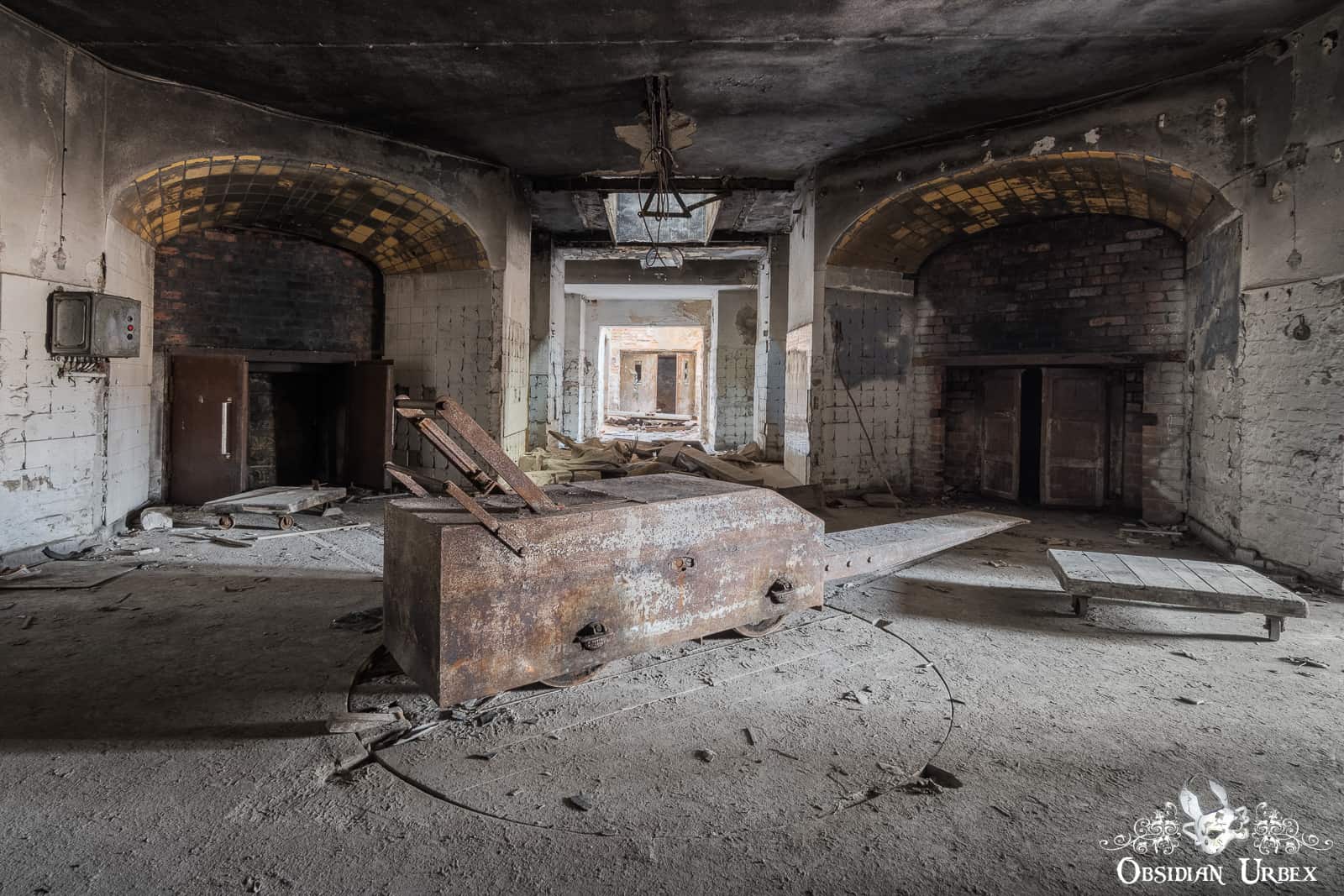 Beneath the (former position of) the black cross is the metal remains of the viewing area. The body would be displayed here, and the bereaved would bid farewell. After this, the corpse was lowered on a platform to the sub-level. This was achieved with a water-pressure operated sinking system. A heavy metal cart awaited below to receive the body. A staff member pushed the cart via a rail system. Directing it onto a turntable. The turntable was used to direct the cart towards one of three furnaces.