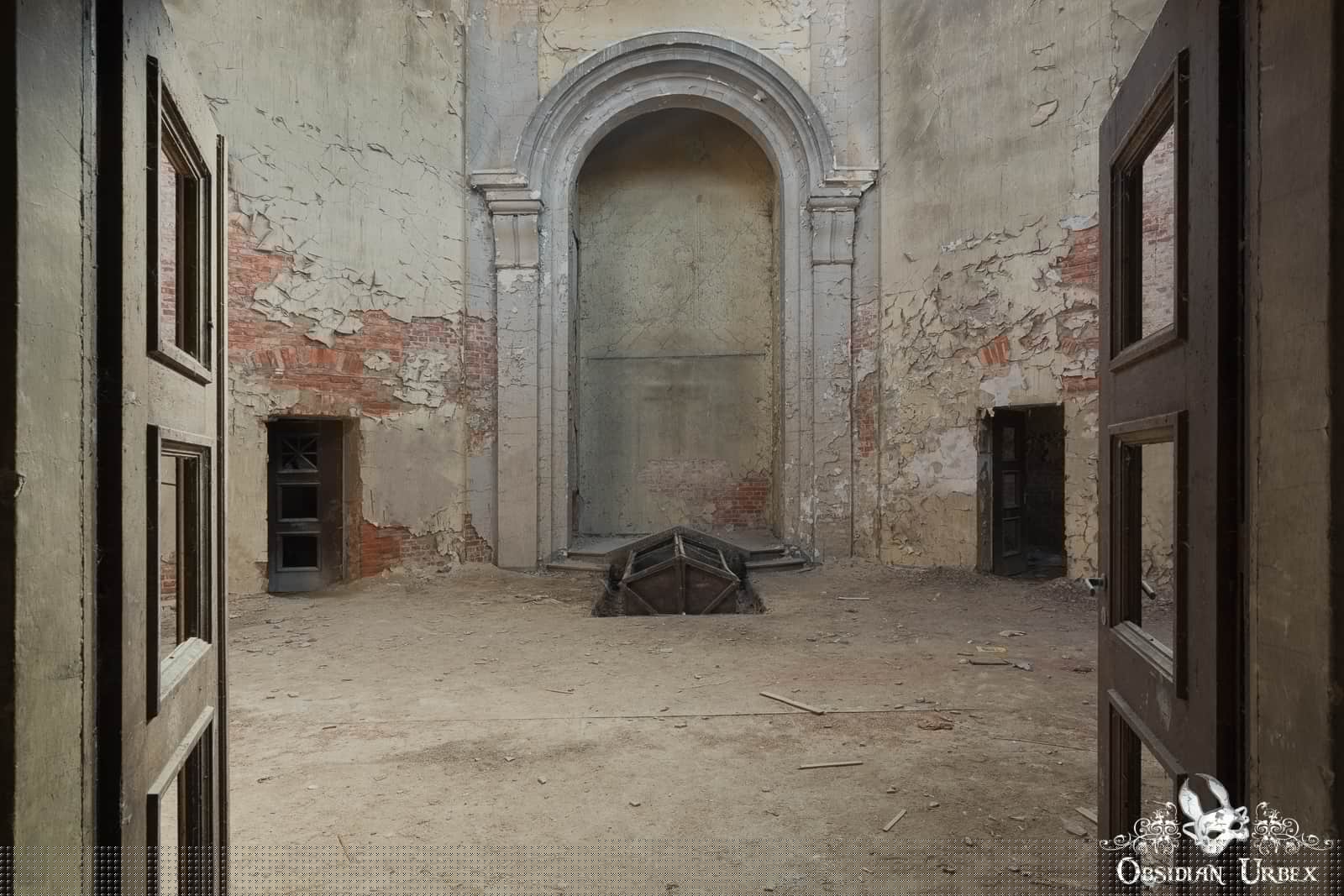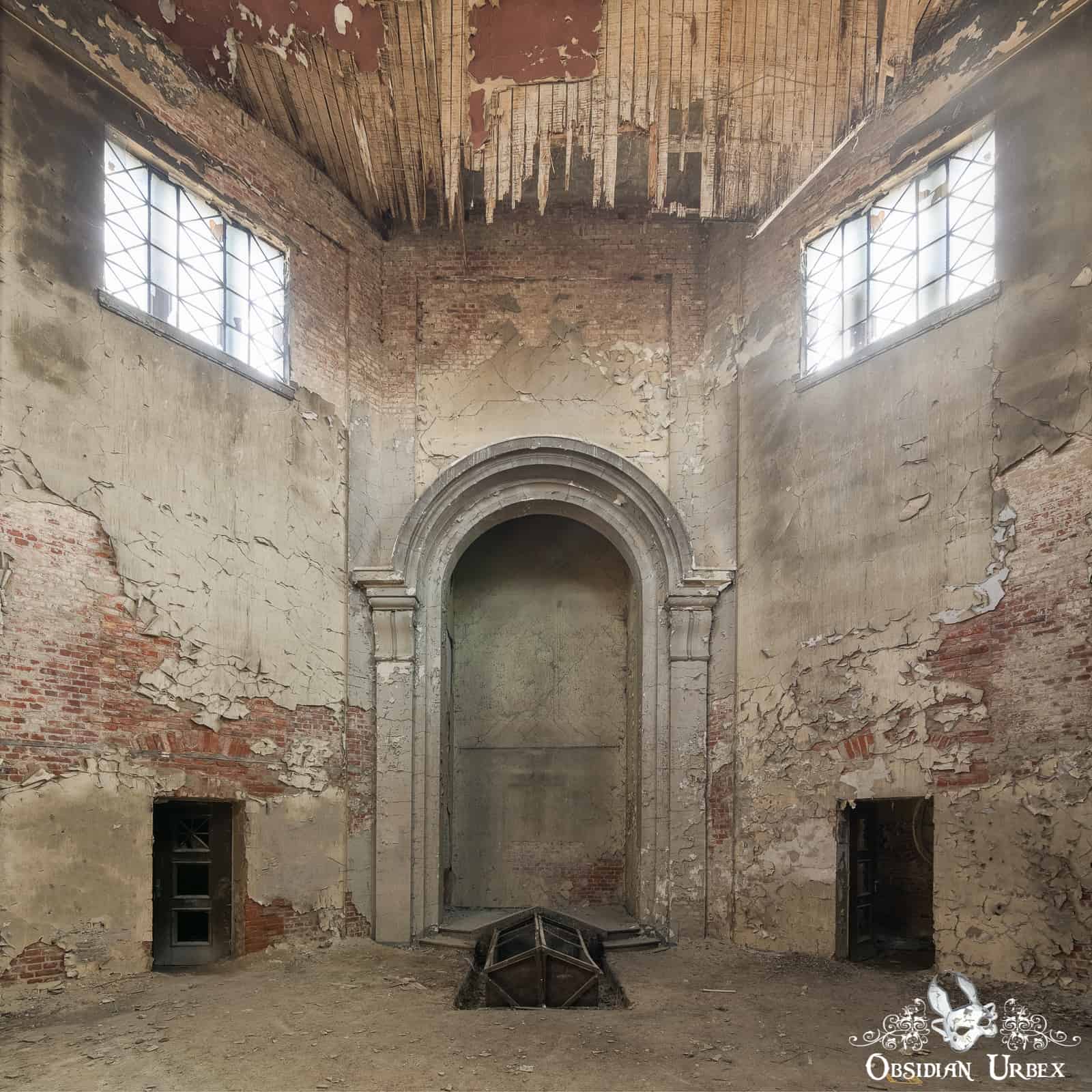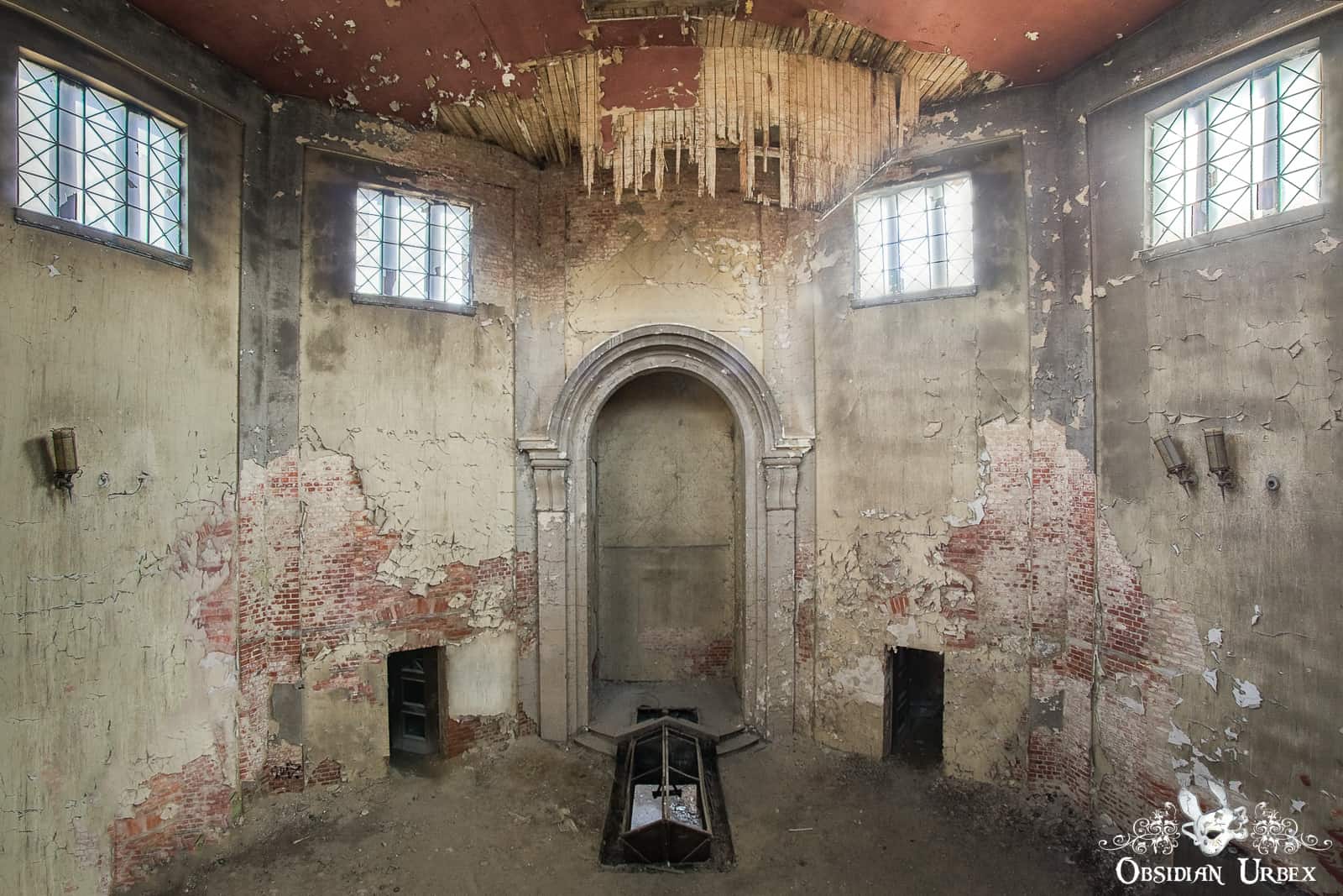 Stone steps take you from ground level to the main door of Das Krematorium D. The main door leads to the mourning hall. This tall octagonal room is mostly empty. Were services standing room only, or was the seating removed? At one time, a large black cross decorated the wall. Sadly this had been stolen prior to our visit. Looking close at the wall of the alcove, you can still see the ghostly outline where it once was hung.
