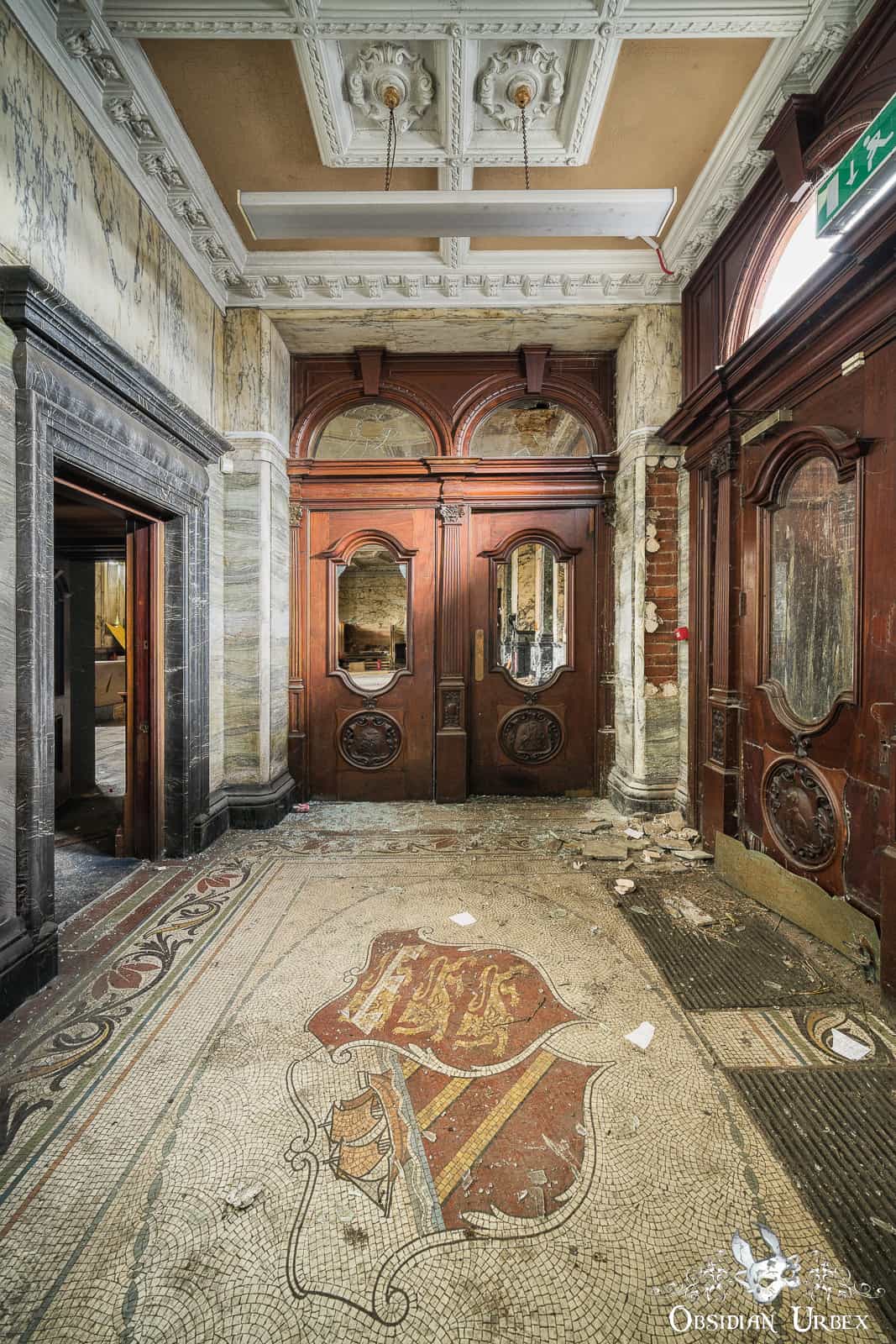 From the outside, this Edwardian Baroque Bank has a beautiful stone and granite facade. Customers would enter through a main entrance, flanked with polished pink granite columns and below the iconic domed tower. The heavy dark wooden double doors lead into a small but beautifully decorated vestibule. The walls and internal doors have white and black marble slabbing. The ceiling has molded plasterwork. However, the most eye-catching feature for me was the coat of arms mosaic on the floor.