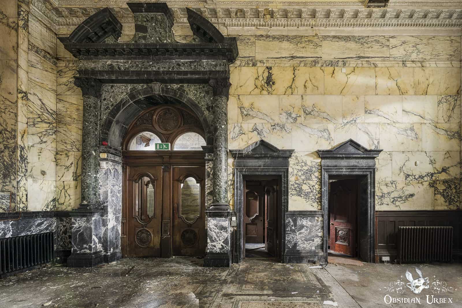 Stepping into the huge banking hall, the scale of this space is impressive. The ceiling is very high, decorated with ornate plasterwork. The walls are a black and lighter off-white marble, the now dirty floor is mosaiced. Once there was a 15m long mahogany counter, as well as various desks and kiosks. Sadly, these have all been removed which leaves the banking hall a rather empty void. Looking back towards the entrance vestibule, there is a wonderful decorative portico. The tall black columns flanking the double doors are Composite order (Corinthian columns, with Ionic volutes at the top of the capital). Above the columns rests a pediment, broken at the apex (a popular Baroque style). To the right of the entrance vestibule portico, there are two smaller/simpler porticos framing doors leading to two small offices.