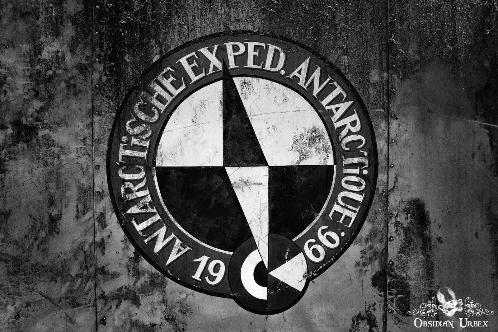 The Expédition Antarctique 1966 logo emblazoning the sides of the Sno-Cats is said to be designed by TinTin comic book artist, Hergé, in 1957. Below the stylised inclined compass logo, cockades of the Belgium and Netherlands flags appear side-by-side. The fame and cult following of this talented artist presented an unguarded prize to hard to resist for certain unscrupulous people. Several of the logos have been removed with some sort of power tool, leaving a jagged hole where the chunk of metal was carelessly and hastily removed.
