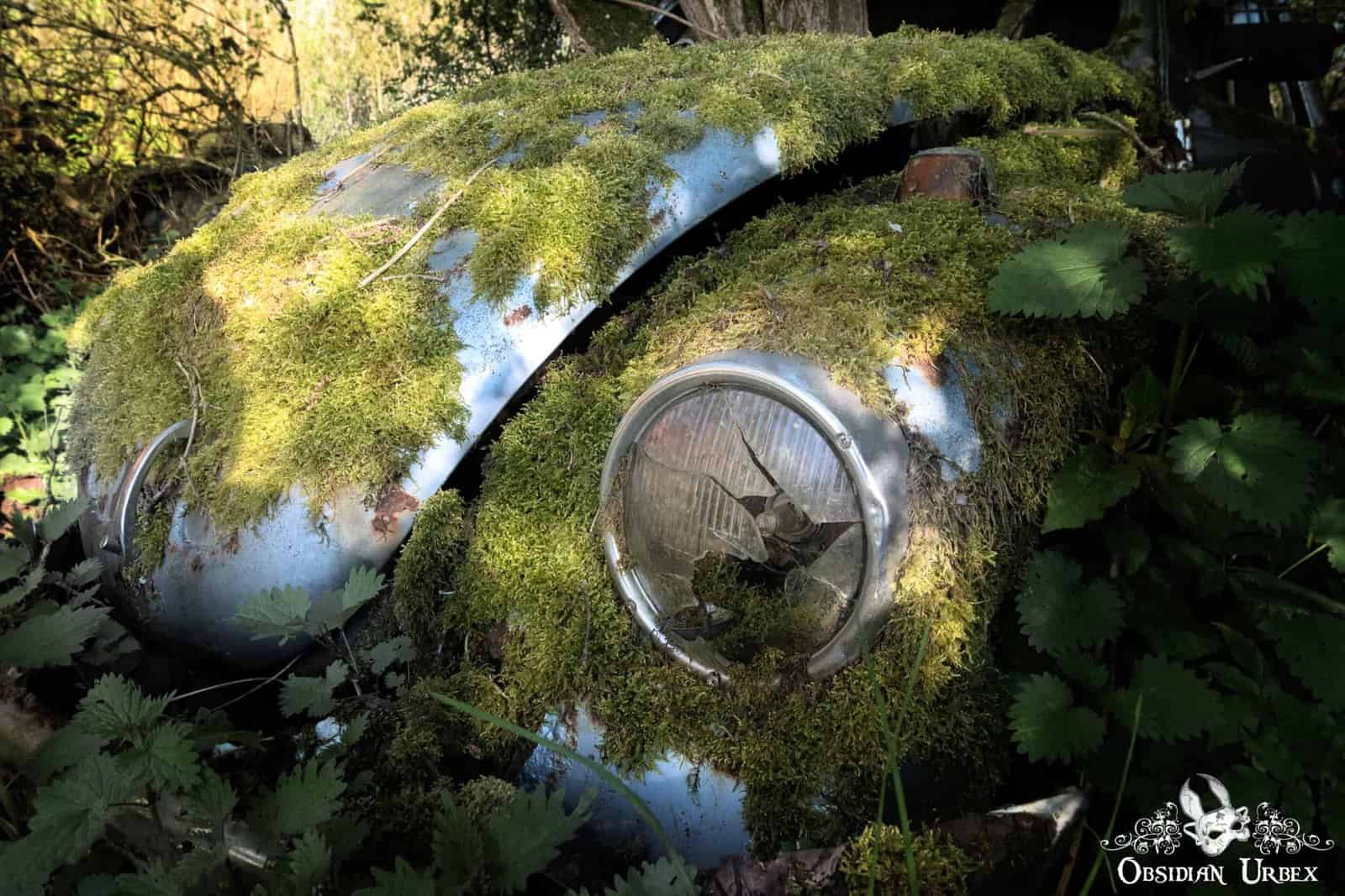 Lignum Beetleum is a beautiful pale blue, and covered with vibrantly contrasting green-yellow moss. A bed of vivid green nettles surrounded it at the time of our visit. A tree has grown up through the passenger side of the car. It emerges from the windscreen as several diverging moss-covered trunks as they fan out and extended skyward. There are other cars nearby, including a red Mustang. Most of these were too overgrown by nettles and brambles to photograph during our brief late Spring visit in 2017.