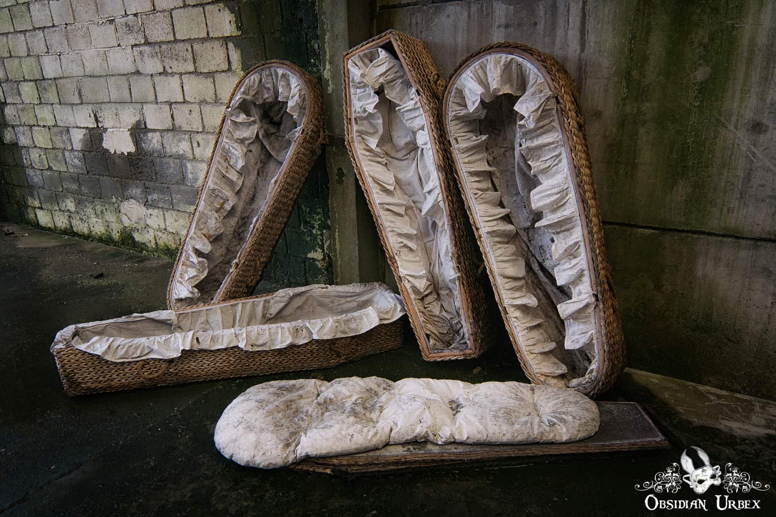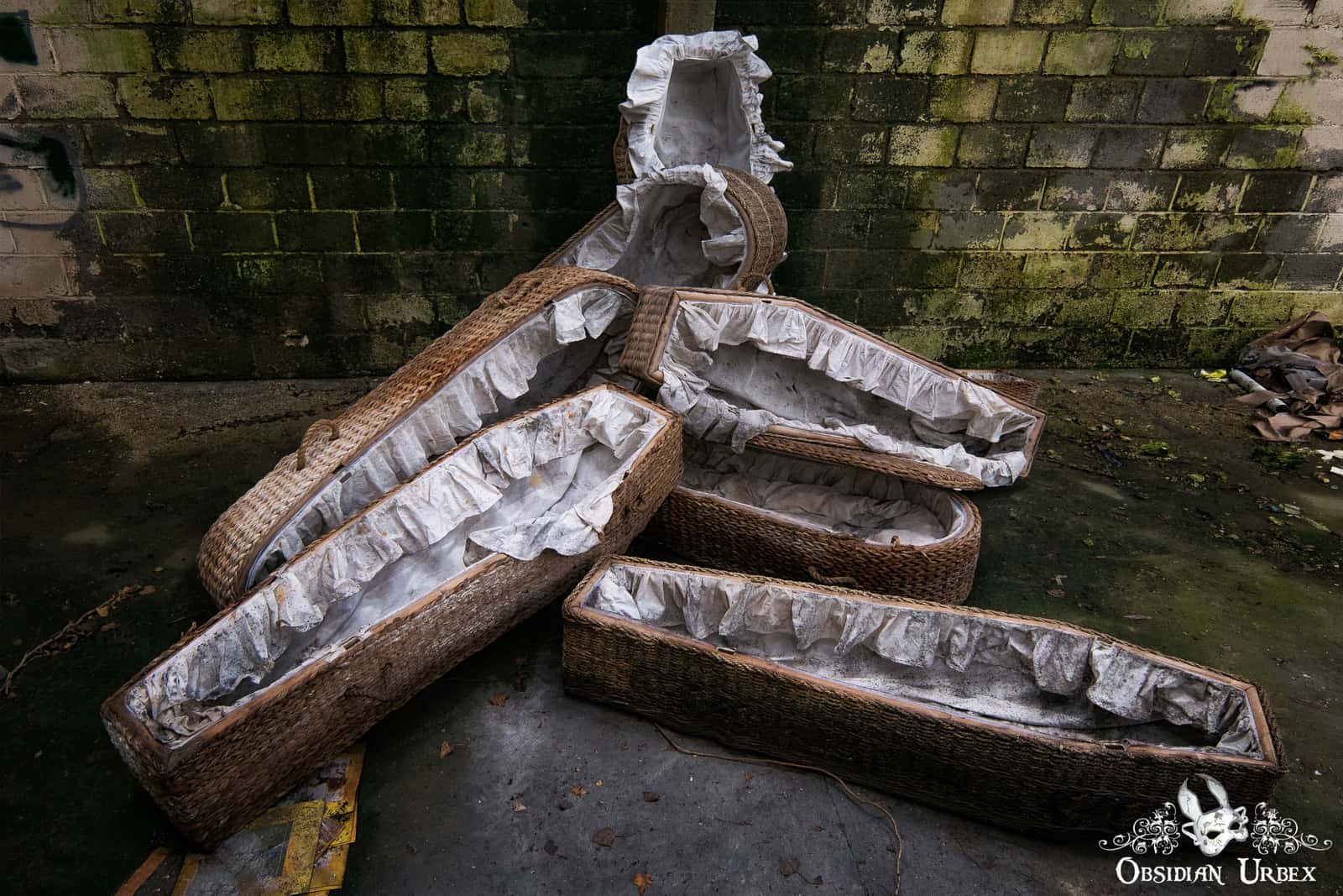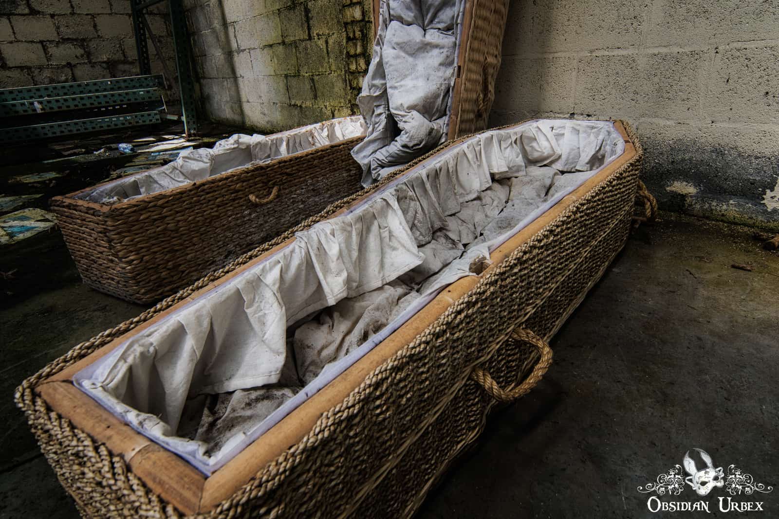 Lost Coffins, also known as Coffin Factory, are a set of wicker coffins. The coffins lay in an abandoned furniture warehouse in Belgium. This site was once a storage area for a furniture importer. This company also owned the attached office space.