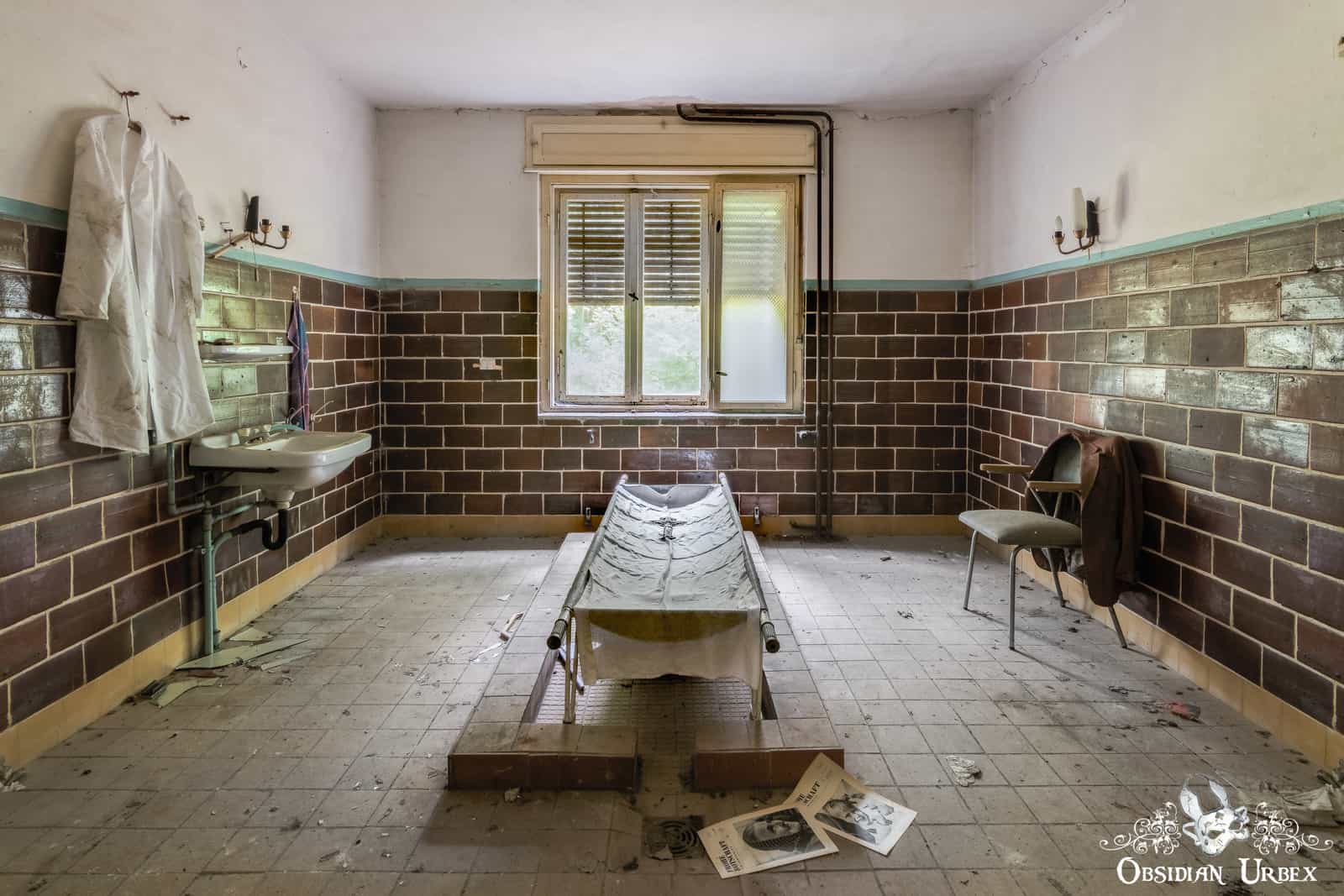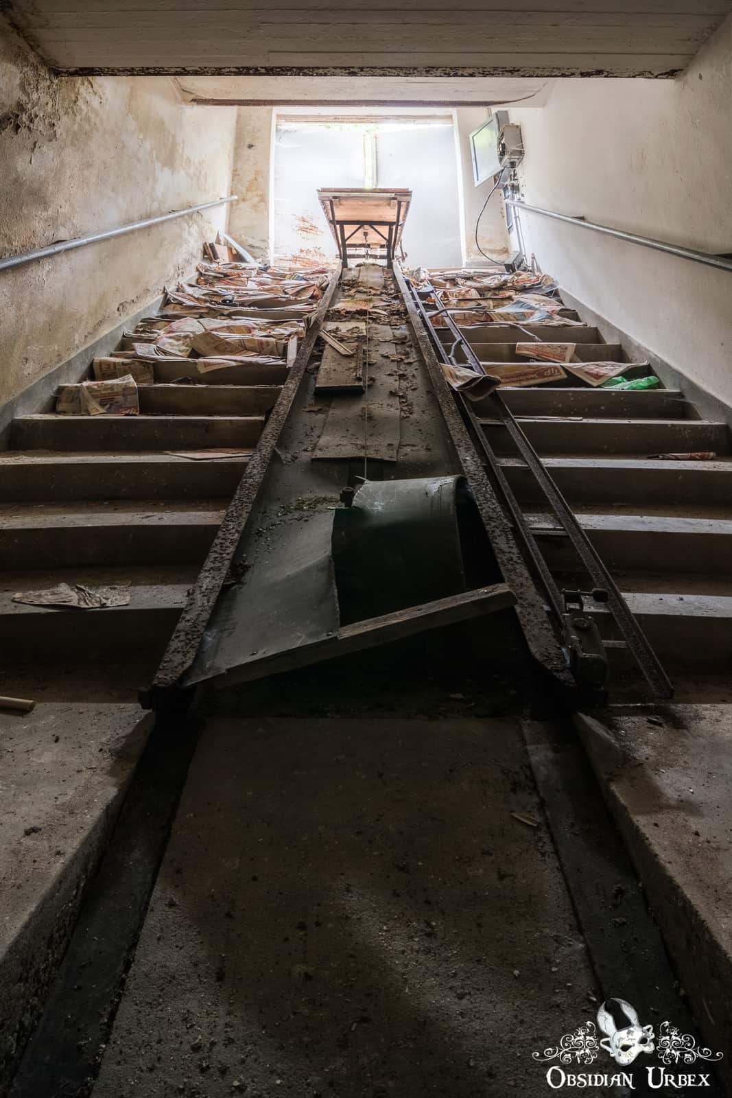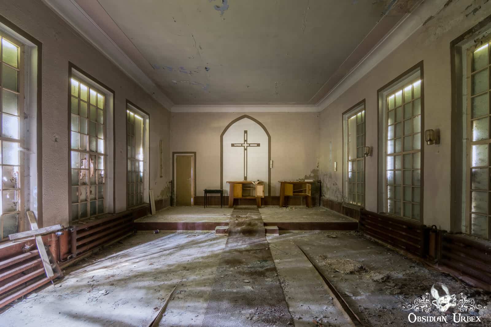 Orange Morgue is an abandoned mortuary in Germany. Bodies were stored in the basement, being transported by a mechanical gurney system which runs along the stairway. Upstairs there is a chapel of rest, where body viewings would take place and an attached chapel where services were conducted before burial.