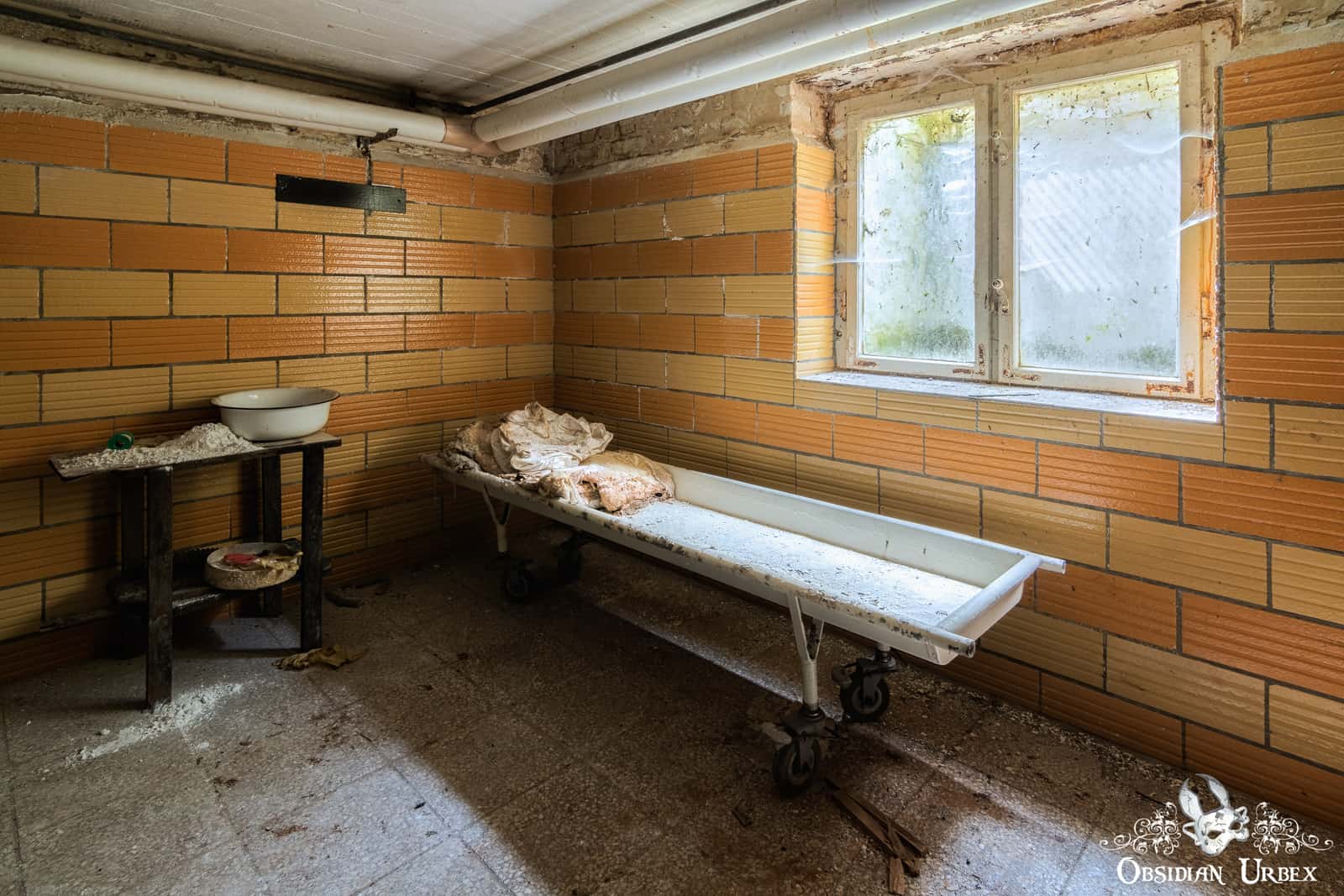 The mortuary is in the basement, below the chapel of rest. Bodies were stored in fridges in a side room, and then prepared for final viewings in a room with orange and yellow tiled walls. There are small wheeled tables which would have held tools for embalming and preserving the body. Bowls and trays now lay on the tables, covered with dust after years of disuse. Undertakers wax and cosmetics would be used to make the deceased presentable for open coffin display, if required. White cotton funeral robes lay in a pile on one stretcher, still neatly folded. The body would then be taken up to the chapel of rest for the final service, or body viewing.