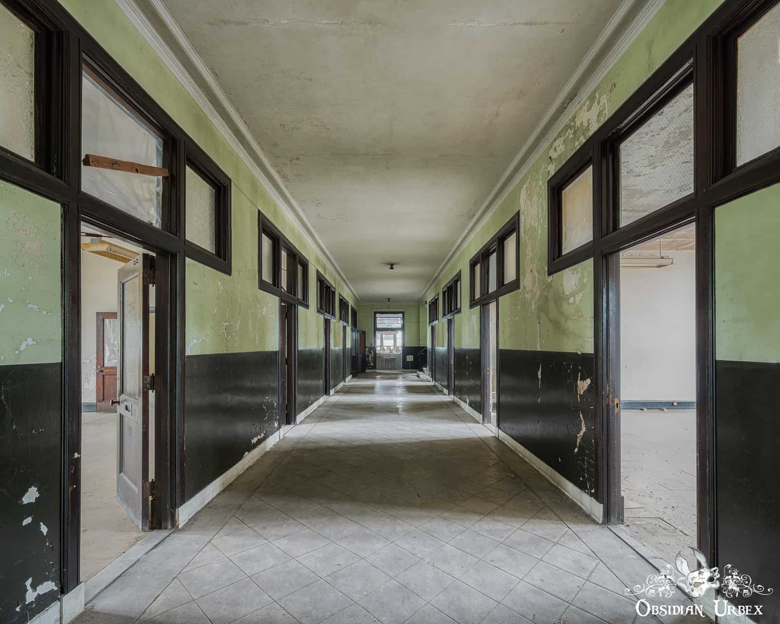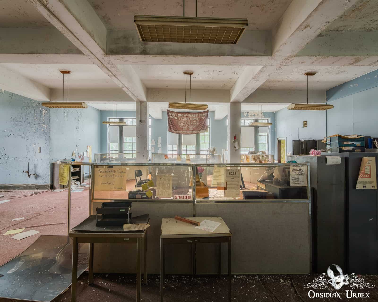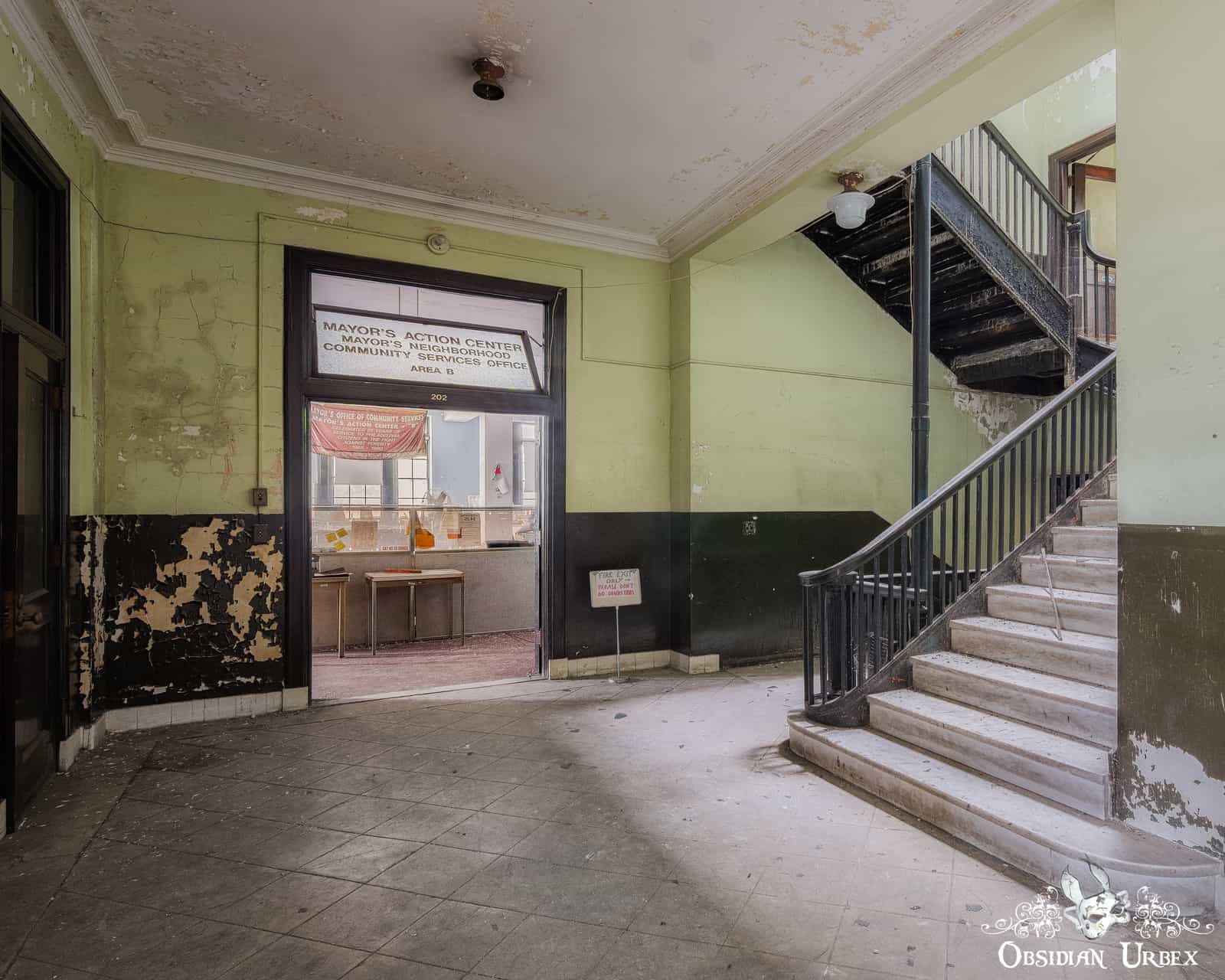 A few years later, the new town hall was constructed. The building covers 20,000 square feet, over three floors. The clock and bell from the old town hall were lovingly re-instated in their new home atop the new tower. Below the clock tower, a green-painted rotunda was added. Two marble memorial tablets line the walls beneath the dome, emblazoned with the names of the towns fallen soldiers from World War 1. Leading from the dome are corridors of various offices, mostly empty now. One office retains many interesting original signs and appears relatively untouched, a stark contrast to the rest of the building. The banners and signed state this is the “Mayor’s Office of Community Services”. There are files and stationery littering the desk, and a lot of original vintage signs.