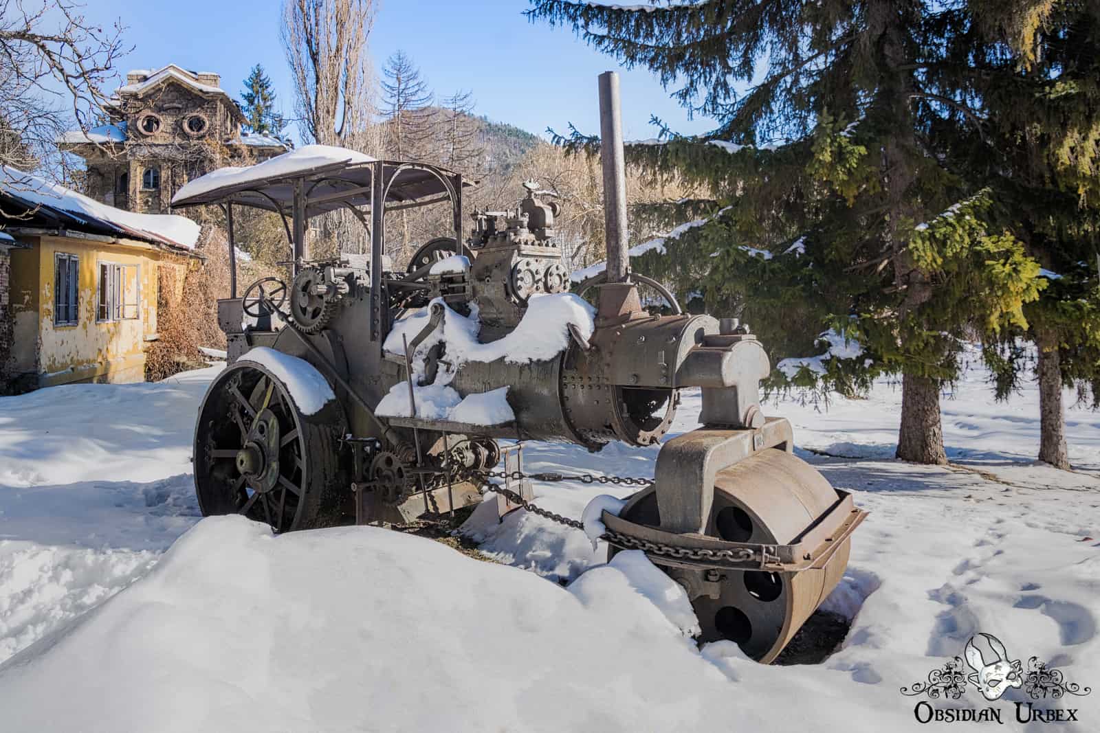Tucked away in an unassuming back road of a Bulgarian town, sits a rusting Steampunk Steamroller. The steamroller lies within the grounds of a large ruined mansion, which was once owned by an important Bulgarian businessman. Over the years the town has encroached, surrounding the mansion and steamroller.