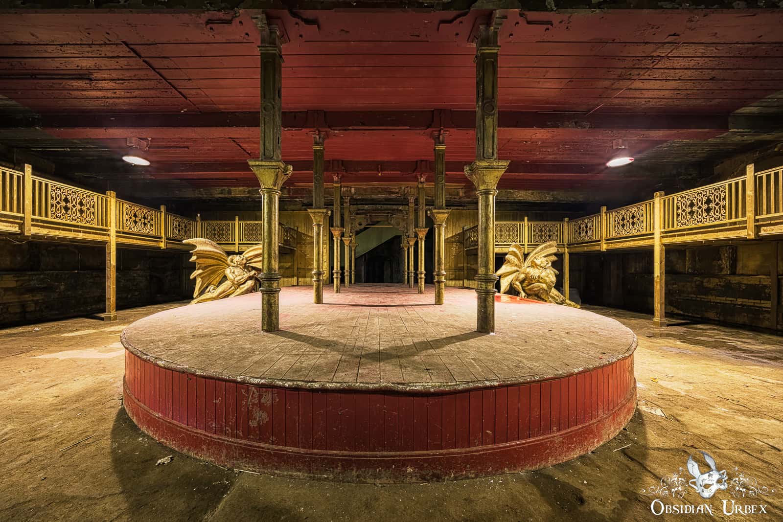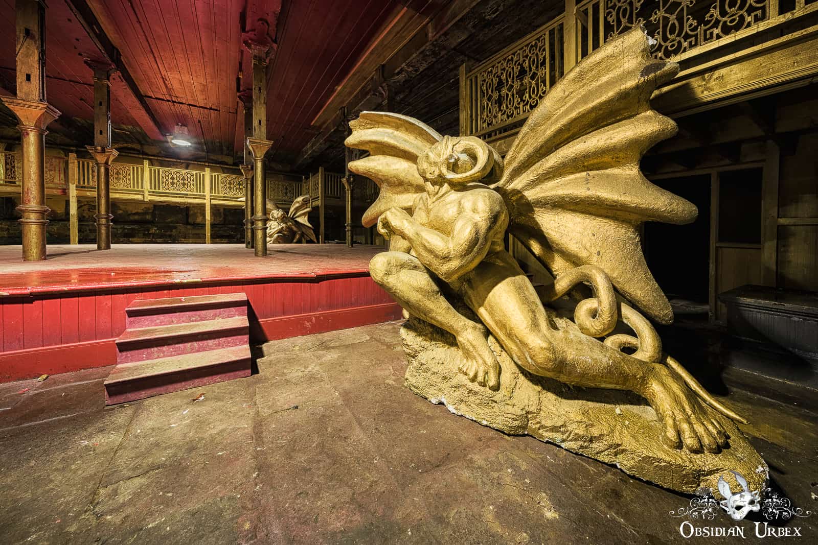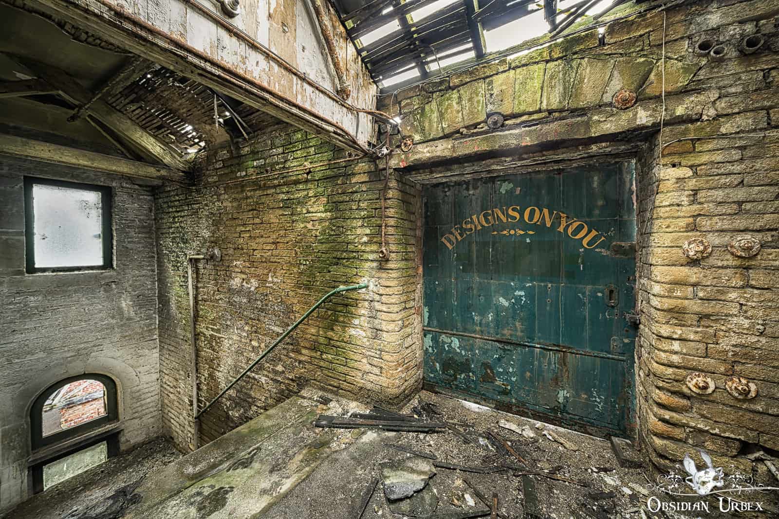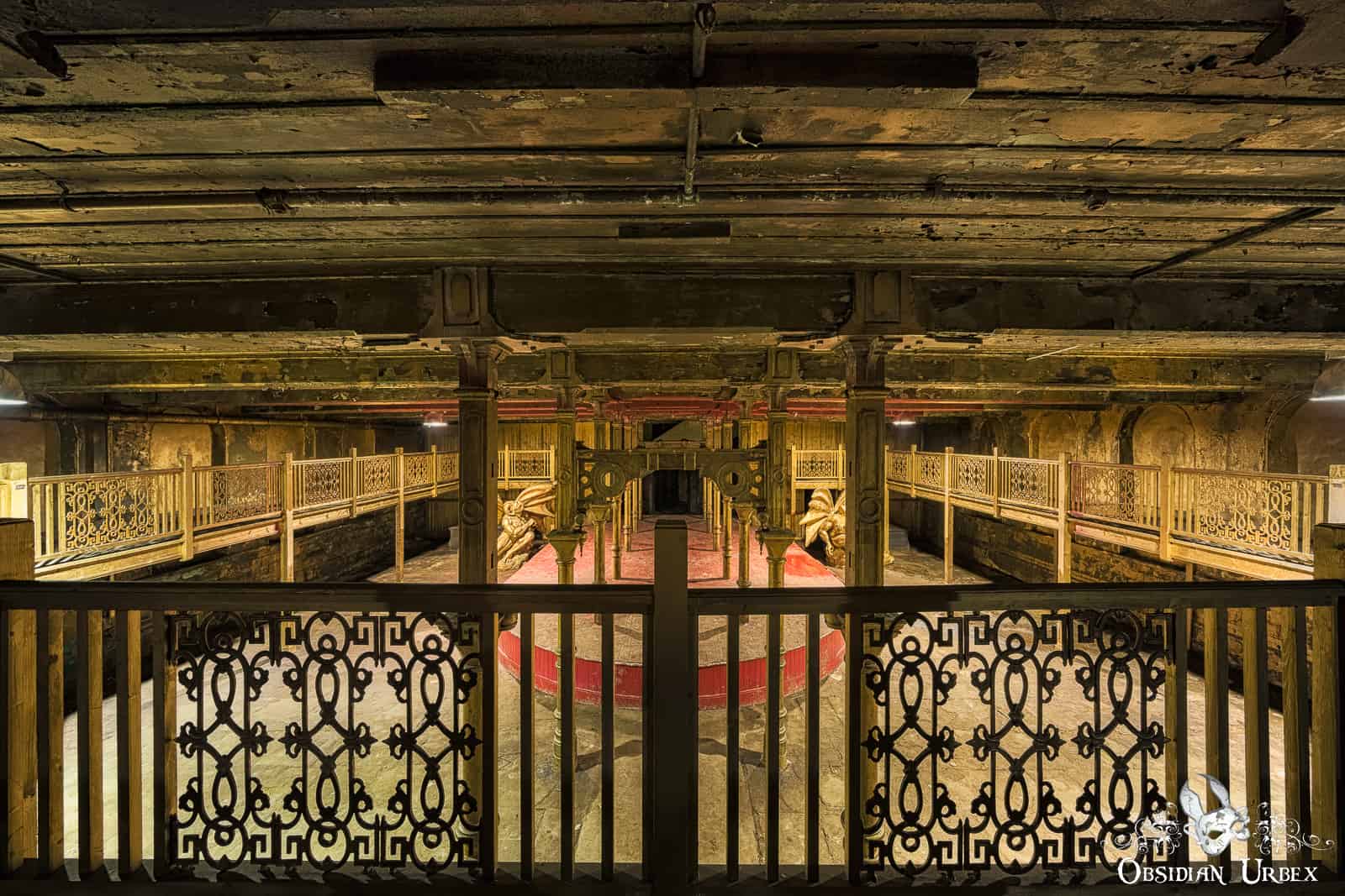 Most of the ground floor of Dalton Mills is a bizarre mix of decor. One area features a red stage with golden pillars and gargoyles. Nearby there is what looks like an ancient prison, the walls are fabricated and sounded hollow when tapped upon. Other areas are decorated with vintage-style posters. These areas are actually all part of movie sets, used in the British horror-mystery film The Limehouse Golem (2016). It appears everything was left here after final wrap, in part of the derelict mill.