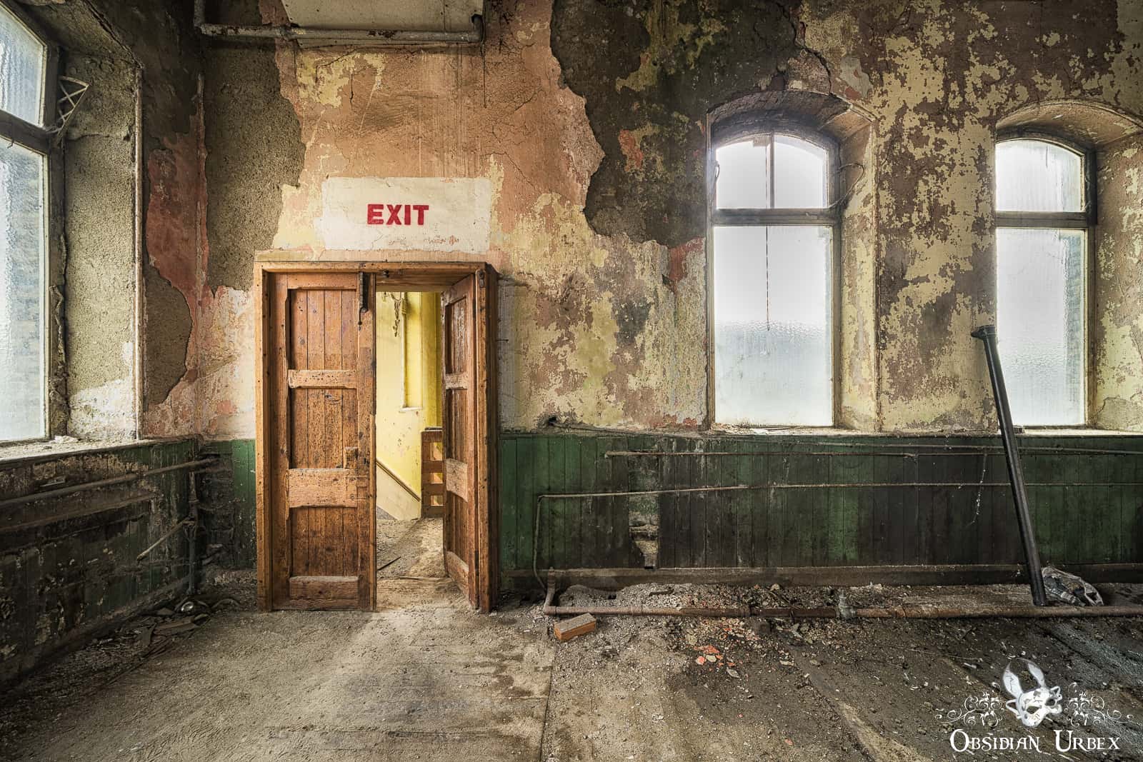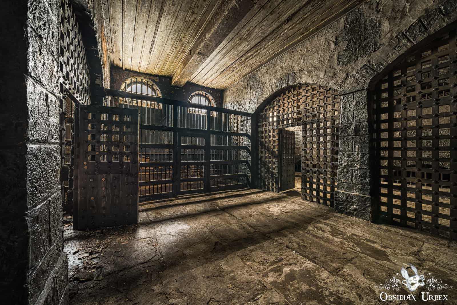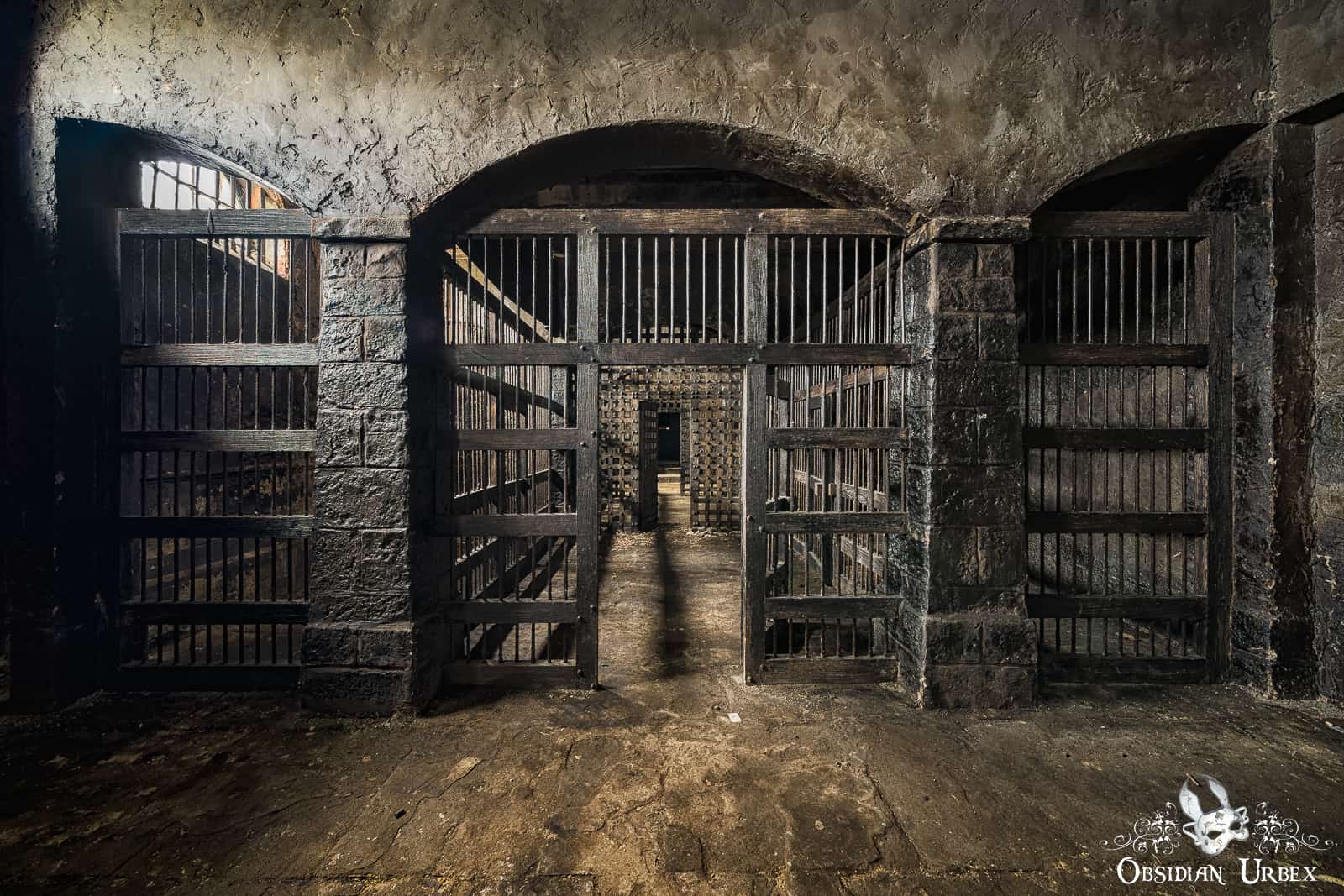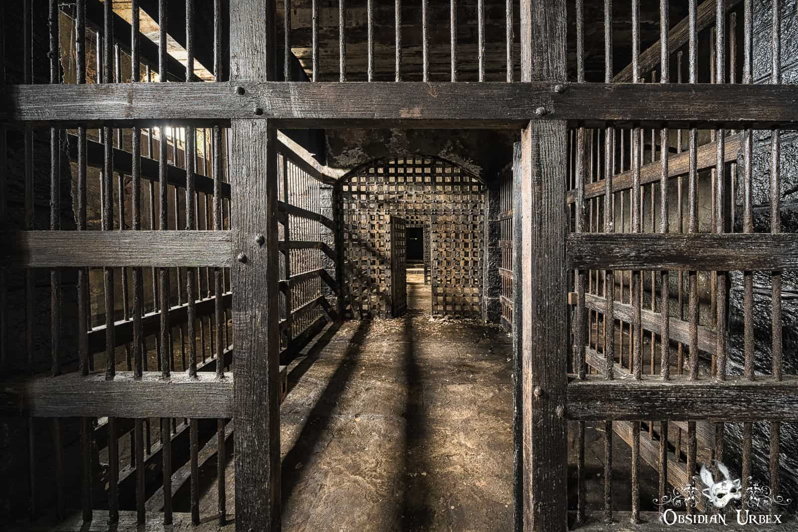 Most of the ground floor of Dalton Mills is a bizarre mix of decor. One area features a red stage with golden pillars and gargoyles. Nearby there is what looks like an ancient prison, the walls are fabricated and sounded hollow when tapped upon. Other areas are decorated with vintage-style posters. These areas are actually all part of movie sets, used in the British horror-mystery film The Limehouse Golem (2016). It appears everything was left here after final wrap, in part of the derelict mill.