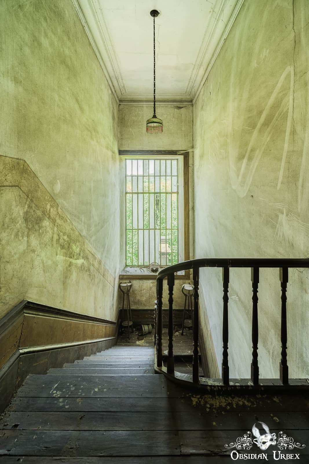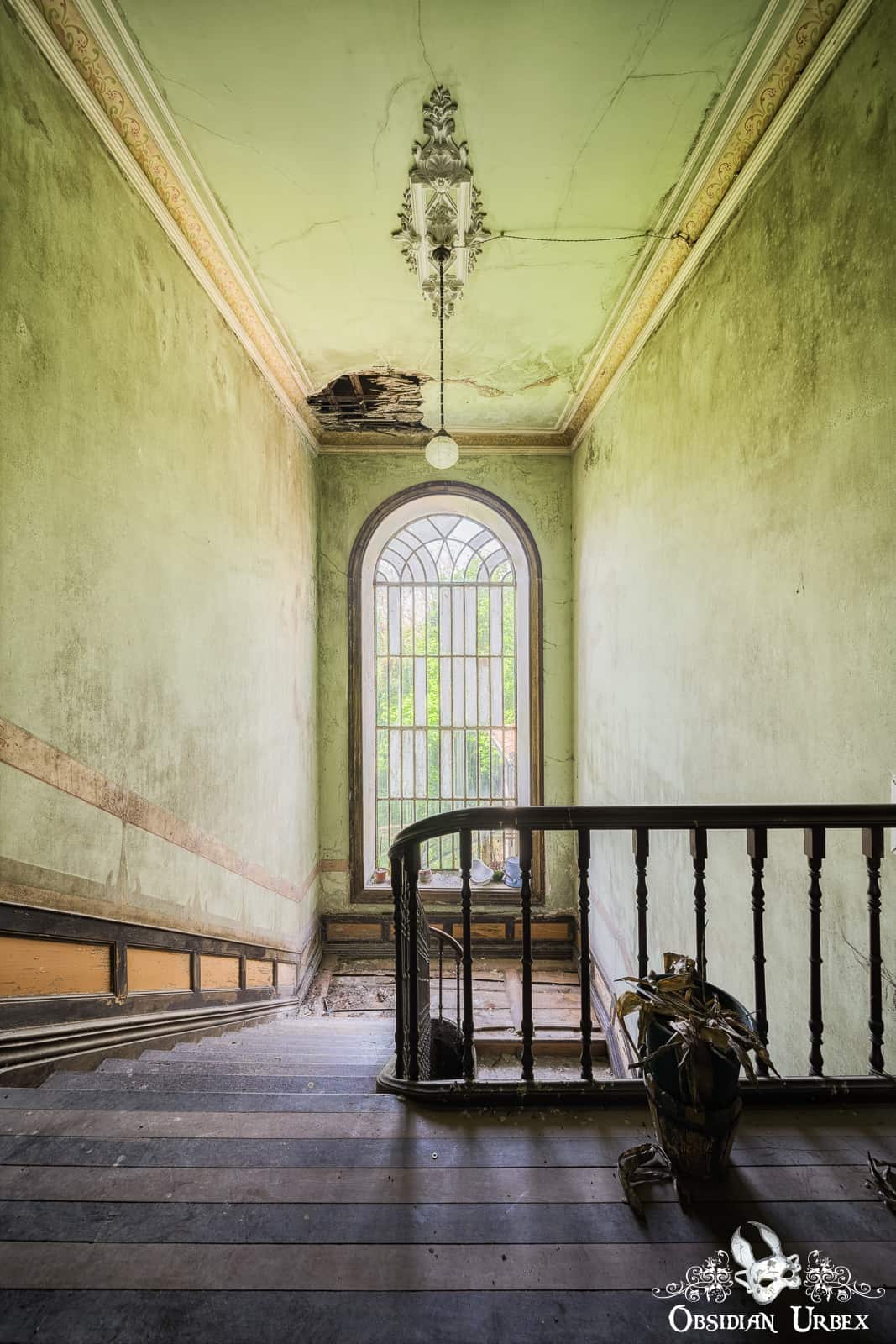 A wide window illuminates the stairs and upper-floor landing, making them bright and airy. There are some sad-looking plants in this area, all long dead. The master bedroom features a charmingly rustic bed with a pink chaise longue at the foot.
