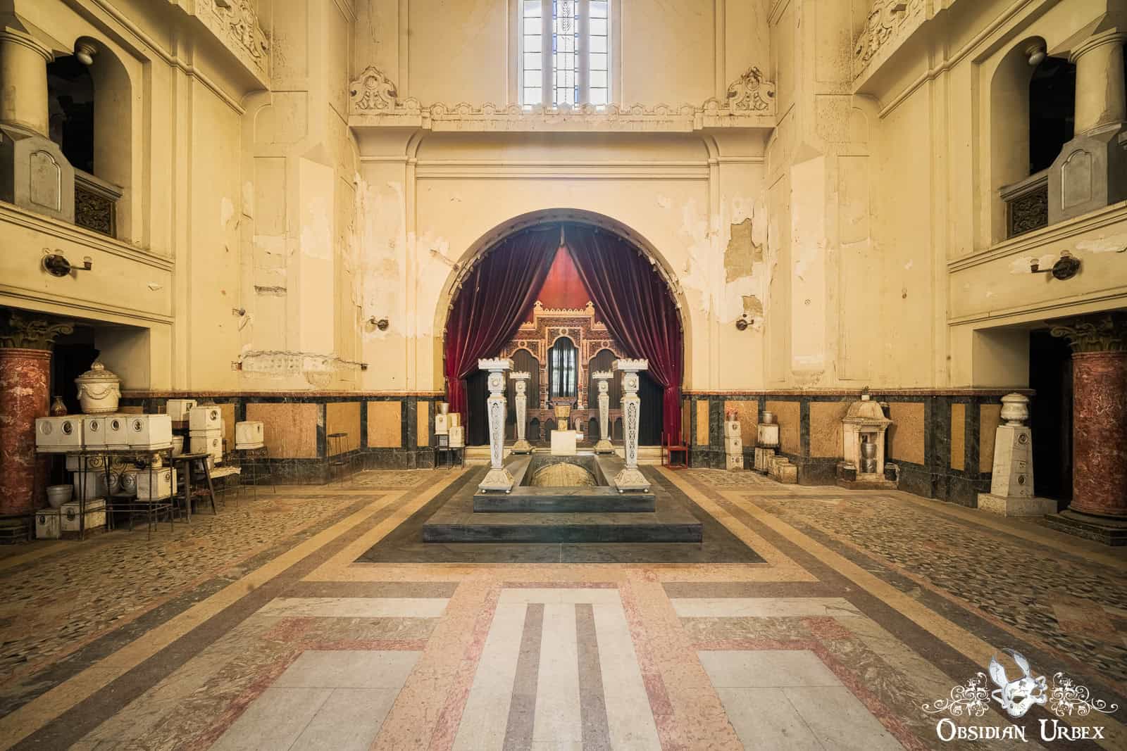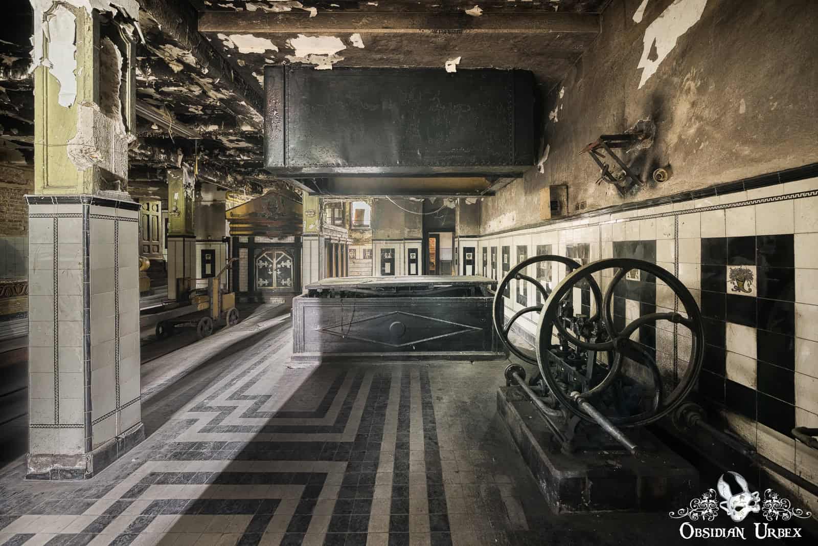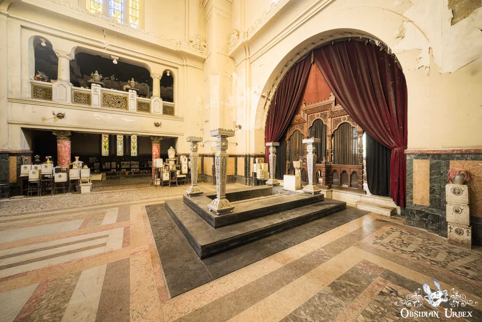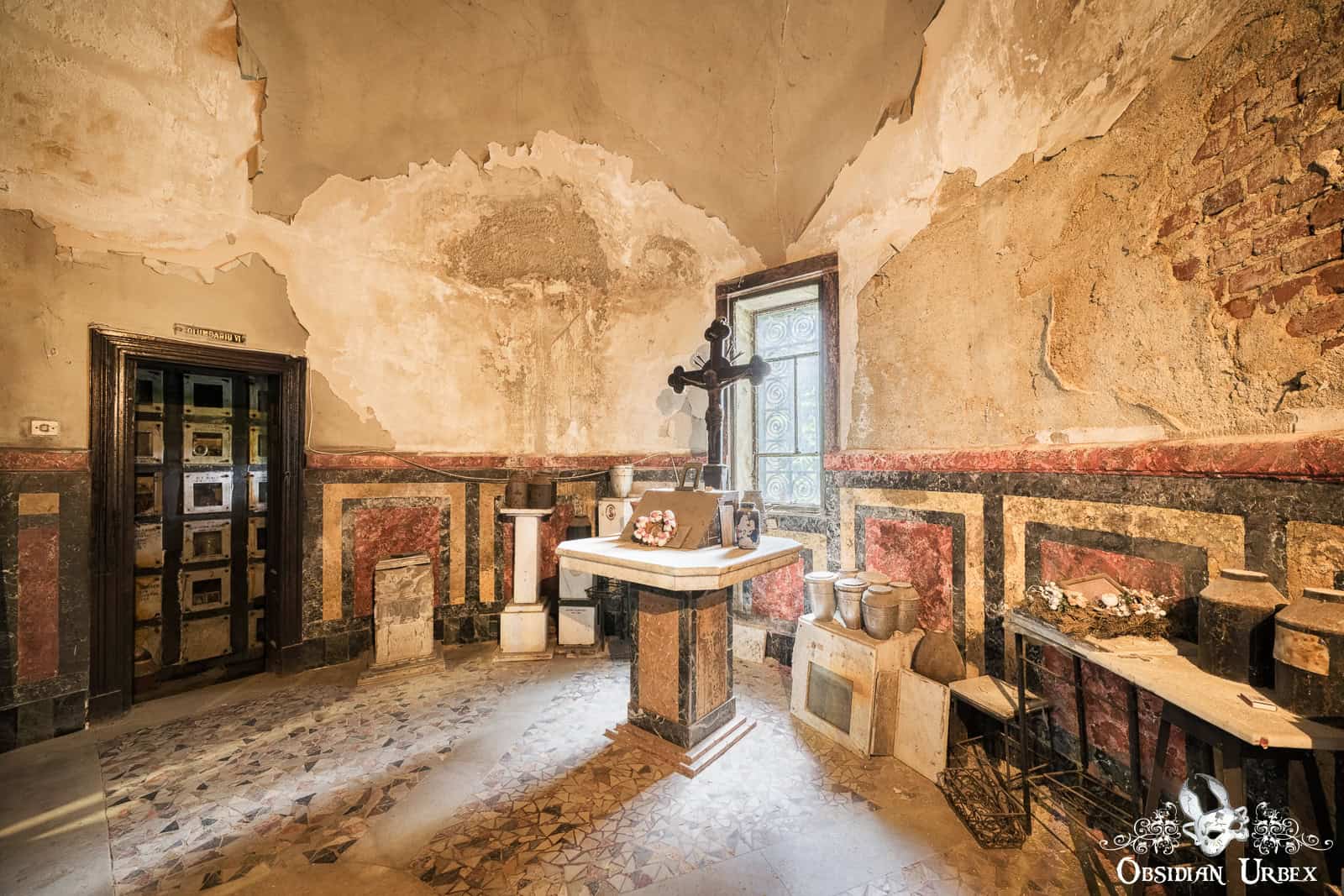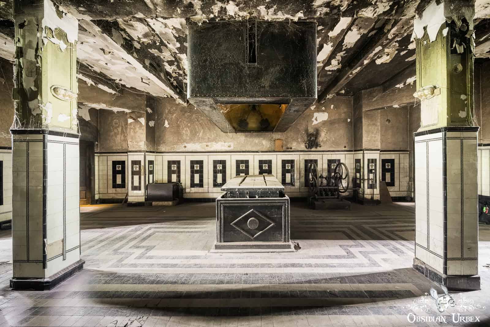 This crematorium opened in the 1920s, a grand project by the newly established Romanian Cremation Society. Designed by a leading Romanian architect of the interwar period, the architecture was influenced by both classical and modernist styles. The cremation chamber features bold geometric design, the designs picked out by black tiles set against white surrounding tiles. The overall design of this area certainly aligns with the Art Deco movement of the time: clean lines, geometric forms, and a sense of grandeur. The funerary hall features a vast, domed chamber with high, arched windows. Natural light floods filter in, creating a sombre yet serene atmosphere. Here, the ashes of the cremated are stored.