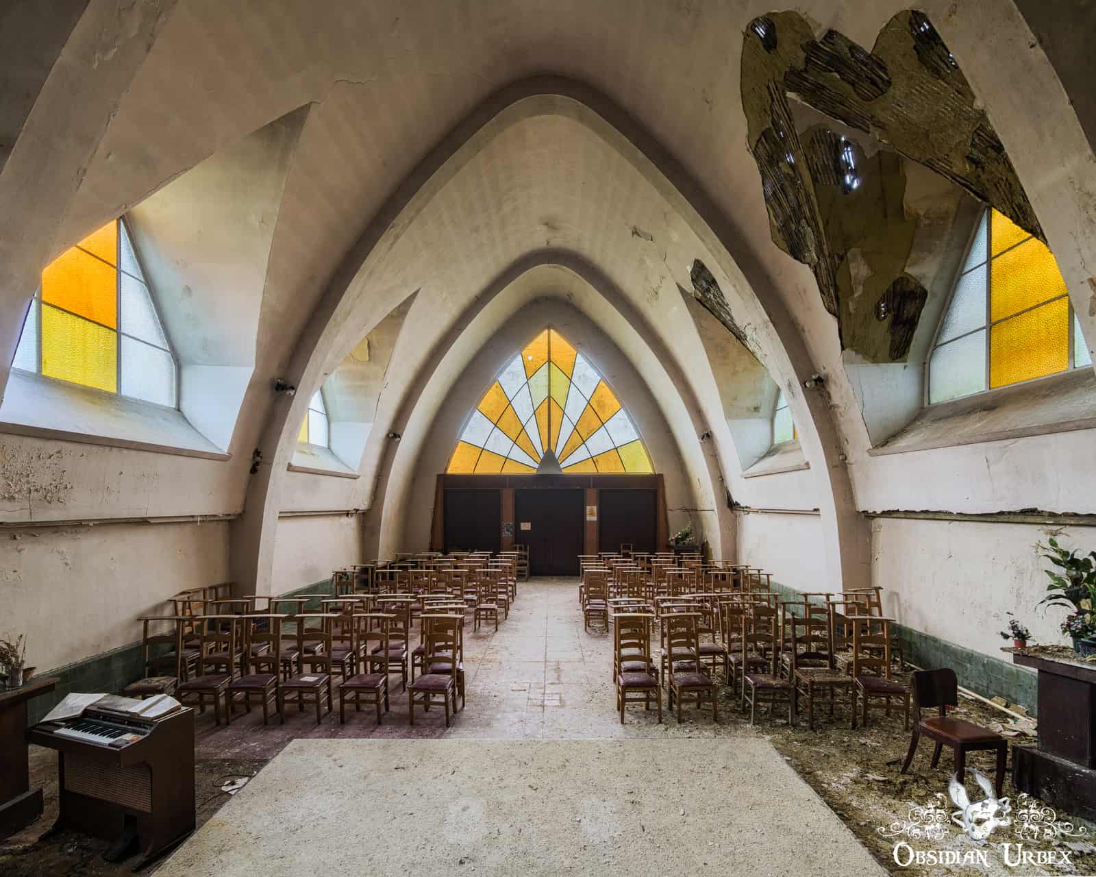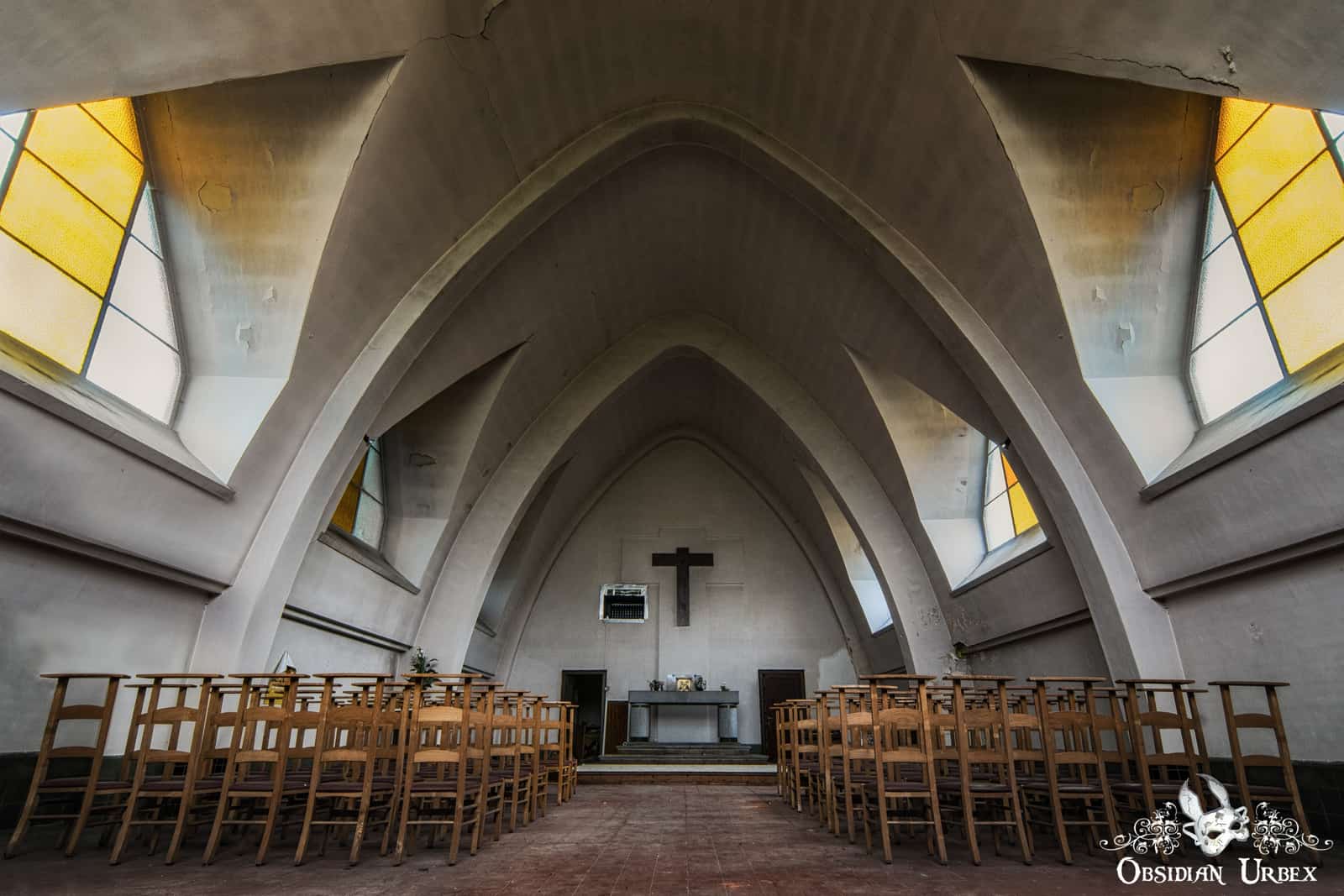 Chapelle Des Mineurs is a small church in northern Belgium. The church was built in the mid-1930’s, featuring unique Art Deco style triangular windows. Above the triple-door entrance, the main window has vivid orange radiating segments alternate with clear segments. This striking window is reminiscent of a famous sci-fi logo, leading to this church’s other code name; Star Trek Church. The roof of the church mimics this window, with the walls and arches raising to a high pointed ceiling. The arches are lined on either side by there similar triangular windows with orange stained glass.