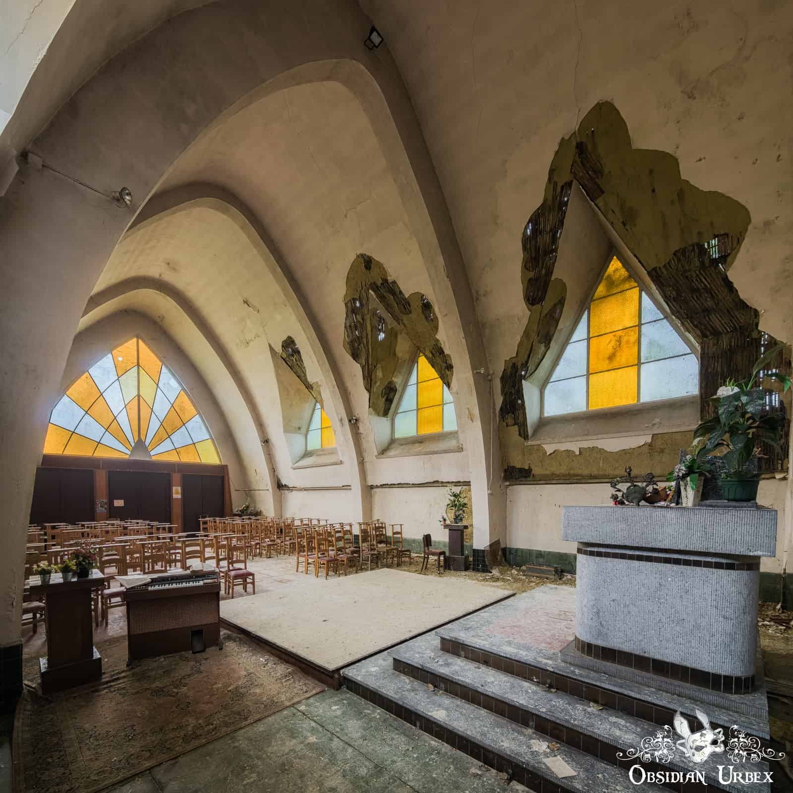 This church was one of the first locations I visited in mainland Europe, during the early Spring of 2016. At that time the church was relatively pristine, with only a few cracks beginning to show on the ceiling and the occasional pile of crumbled plaster on the floor. There were many religious artefacts; a cross, marble Virgin Mary bust, bibles and various hand-made craft items.