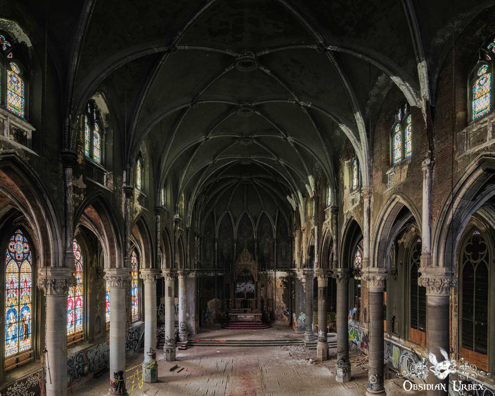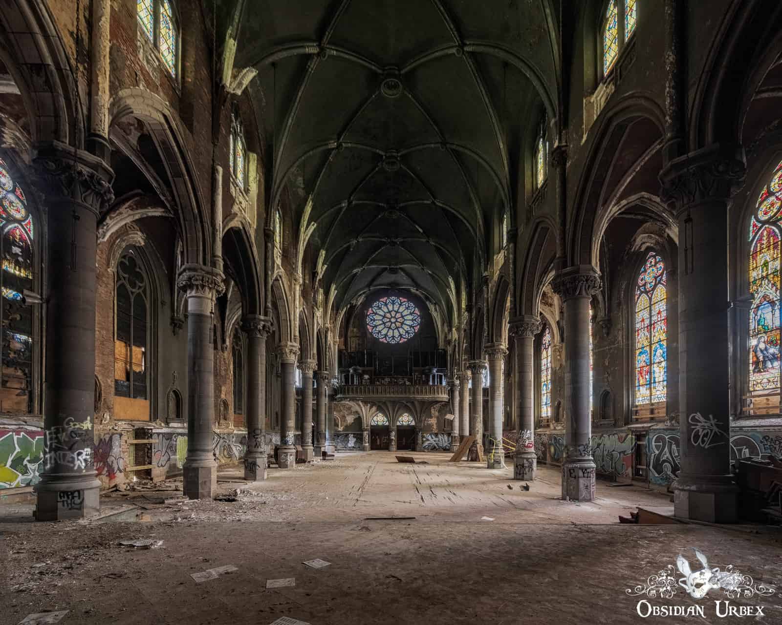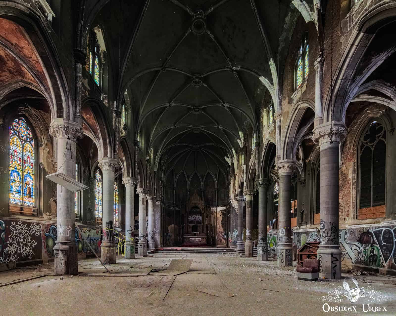 The Dark Dogma Church is over 120 years old, it has been abandoned for 20 years. The church was built in an imposing Gothic (Gothic Revival) architectural style, with a tall looming vaulted ceiling. The hall is lined with brightly coloured stained-glass windows, imported from Germany and made by the finest craftsmen of the time.