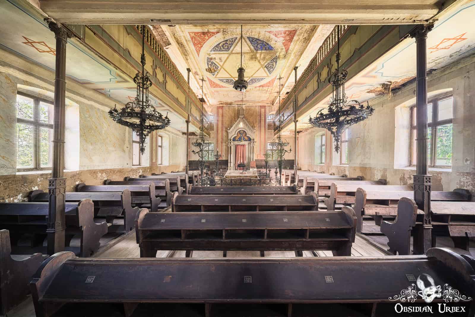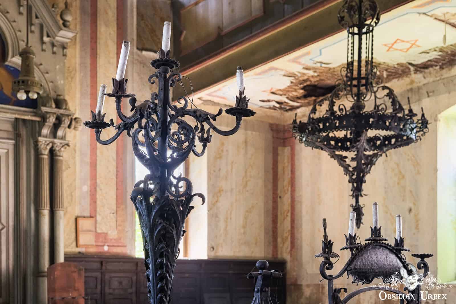 Inside, the main hall is a single open space. Windows line the walls, and afternoon sun pours in, flooding the space with natural light. The benches are dusty from disuse, strewn with spiderwebs. Occupying almost the whole ceiling, there is a massive Star of David in red, blue, and gold. From the edges hang two large ornate black metal chandeliers. Matching sconces sit at each corner of the bimah (the raised platform where the Torah scroll is read during services).