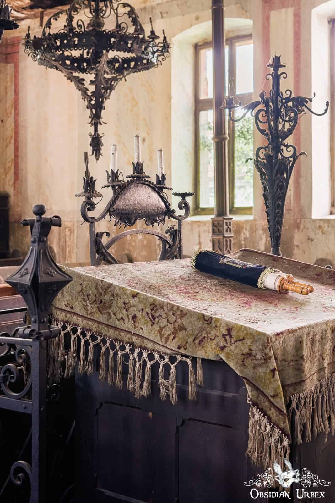 On the eastern wall lies the ark, which once housed the sacred Torah scrolls. Hanging from the ceiling in front of this is the sanctuary lamp (Ner Tamid). Scattered along the opposing wall are photographs and names of the families lost to the massacres of Auschwitz.
